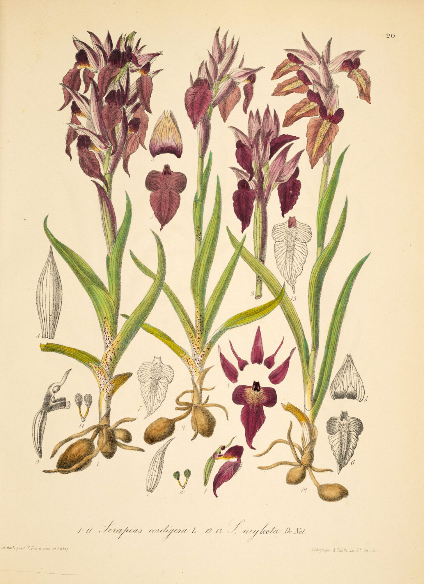 ⬅︎ In copertina un tetto erboso di un condominio a Genova colonizzato da Serapias neglecta. Foto di Milena Vanoli, Marzo 2020.⬆︎ Tavola di J. B. Barla che rappresenta le 2 più importanti specie di questo Sectio: Serapias cordigera e Serapias neglecta. 1868: Flore illustrée de Nice et des Alpes-Maritimes : iconographie des orchidées, Pl. 20. From BHL (Biodiversity Heritage Library): 1868 - Flore illustrée de Nice et des Alpes-Maritimes - Biodiversity Heritage Library