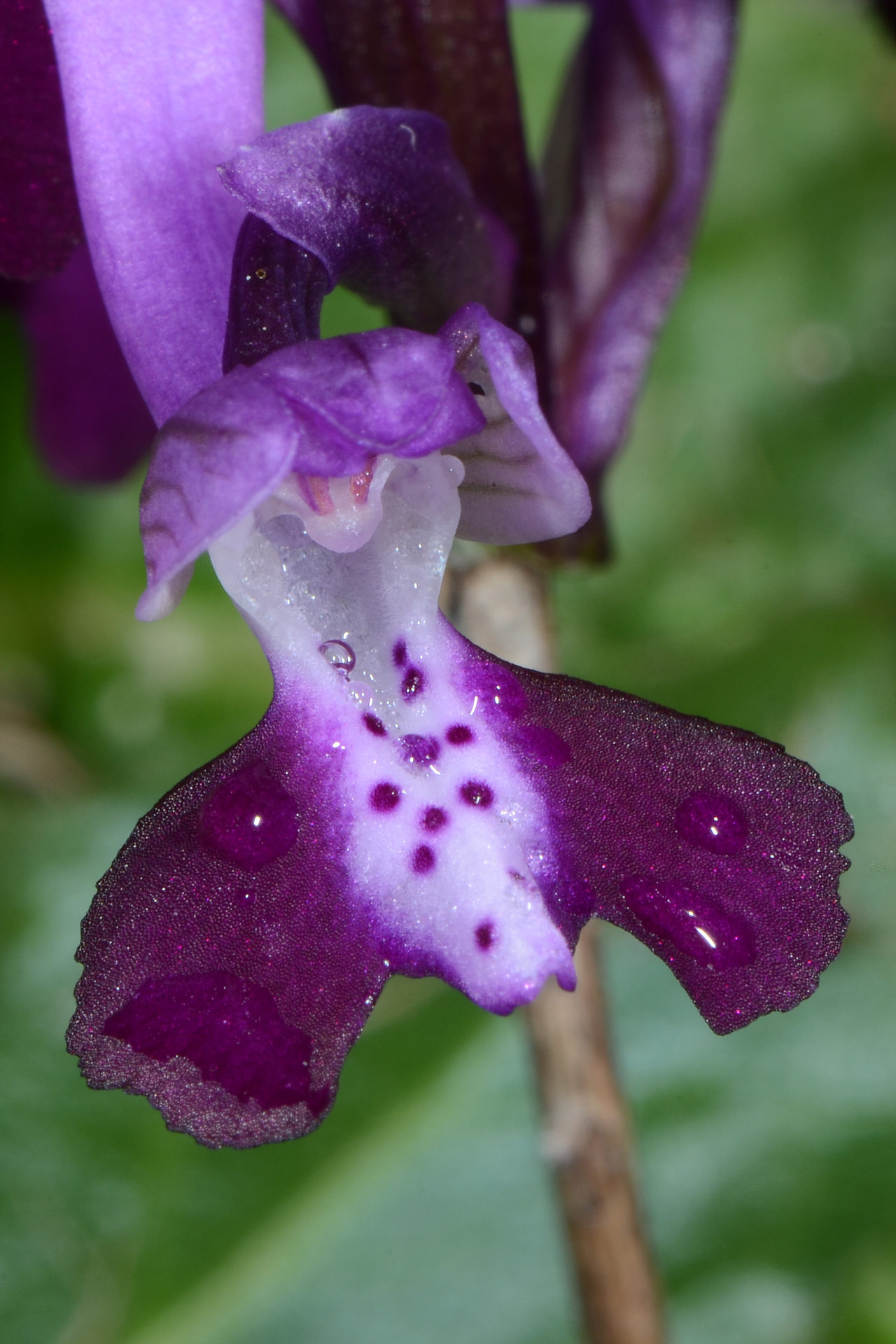 infiorescenza più lassa, di solito con meno di 15-20 fiori dai colori fortemente contrastati tra il bianco e il rosso molto scuro; casco tepalico da roseo a violaceo, con striature longitudinali porporine (non verdi), molto più chiaro del violetto scuro (fino al rosso nerastro) dei lobi laterali del labello piegati all’indietro; il labello è un po’ più corto rispetto ad A. morio (6-8 × 12-18 mm), la sua base biancastra presenta 3-6 grossi punti porporini spesso disposti in 2 file; il grosso sperone è più lungo dell’ovario (15-17 mm), con apice allargato (spatolato). Numero cromosomico: 2n = 36.