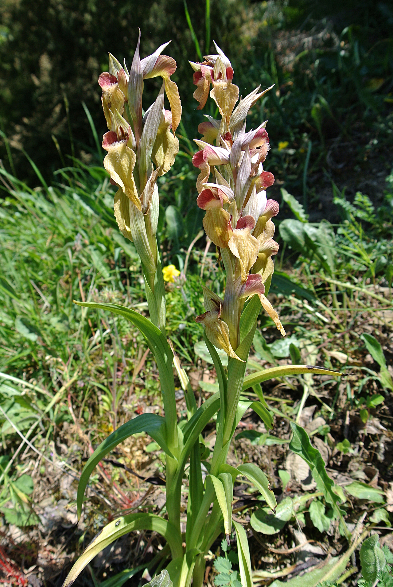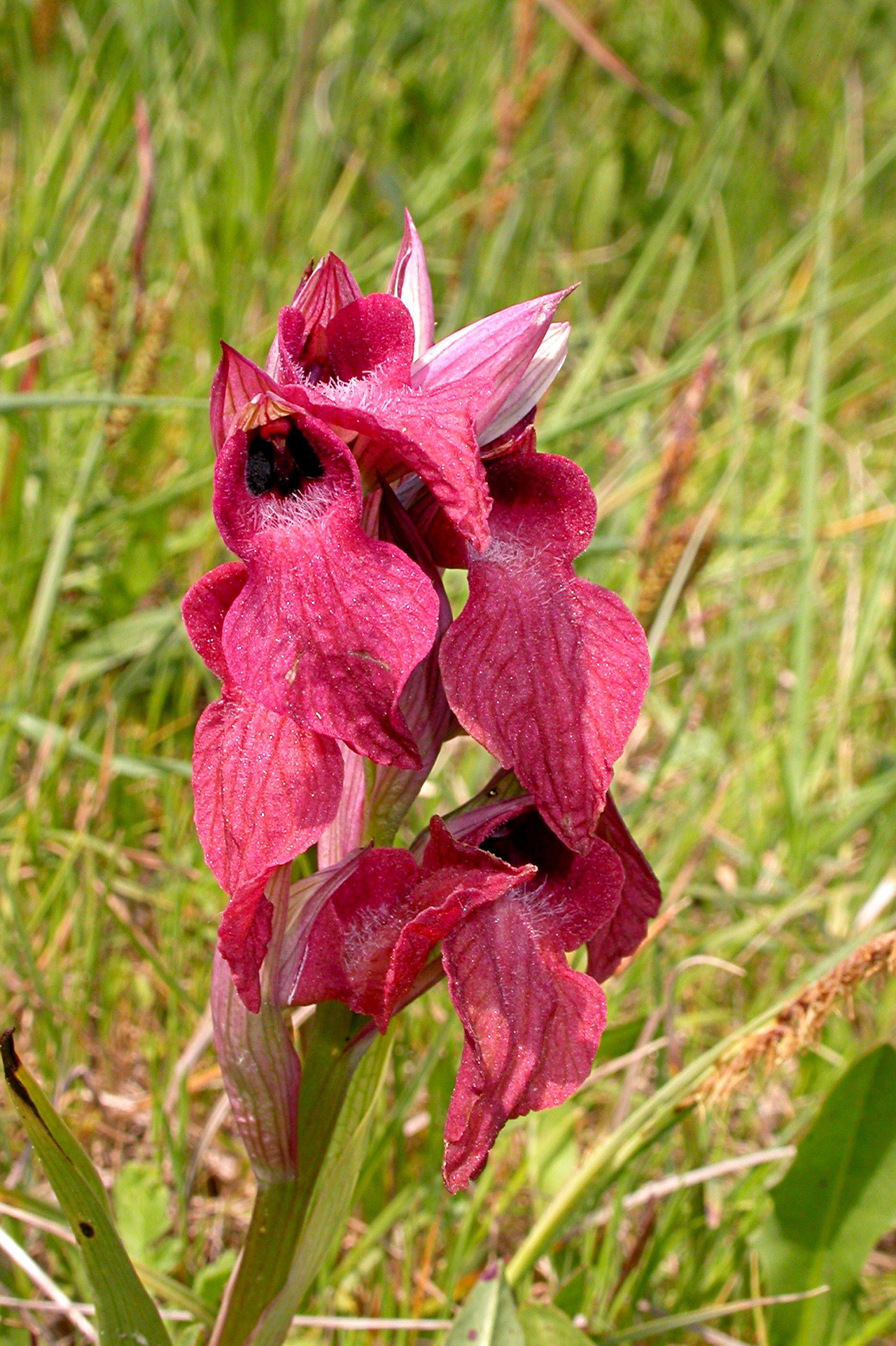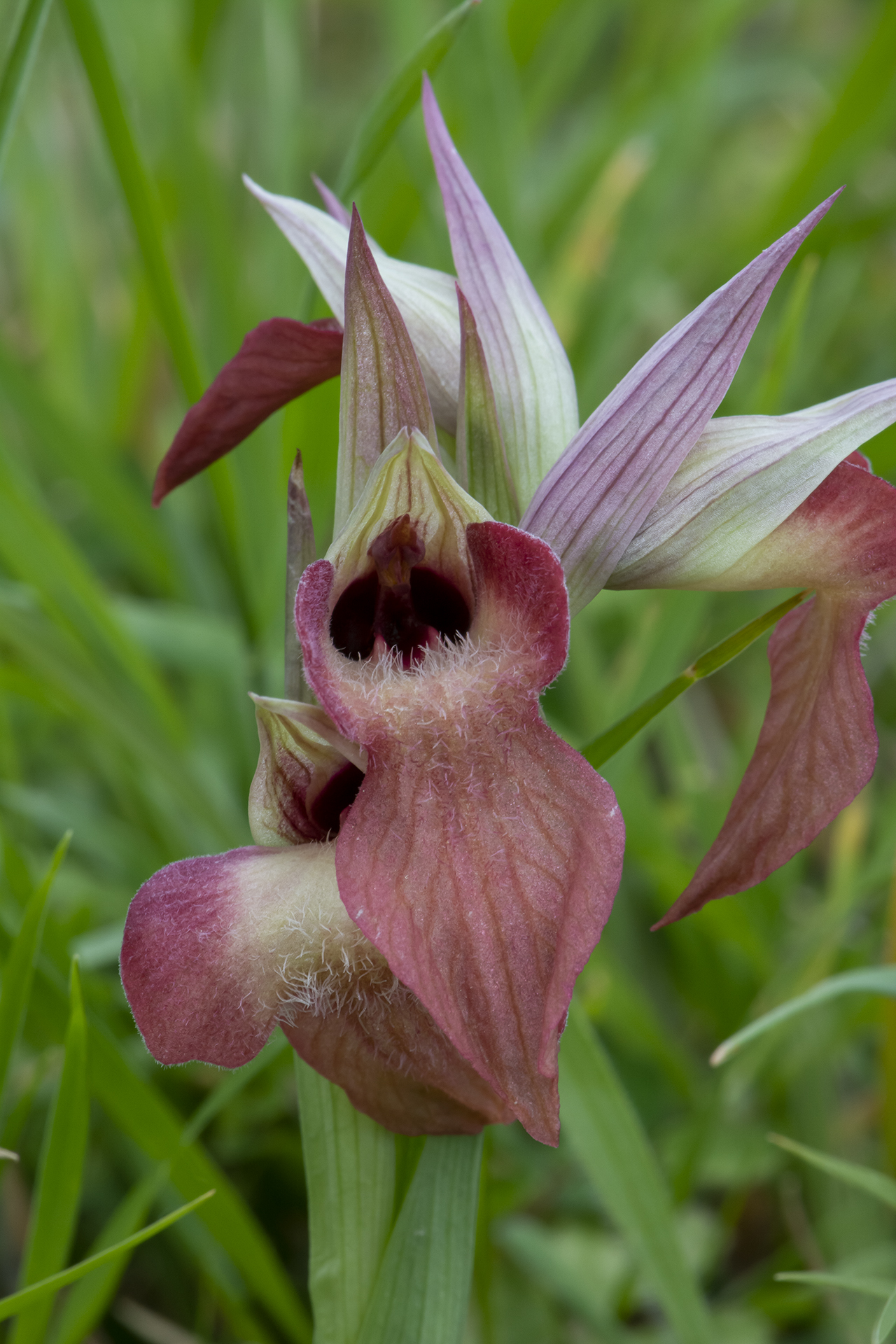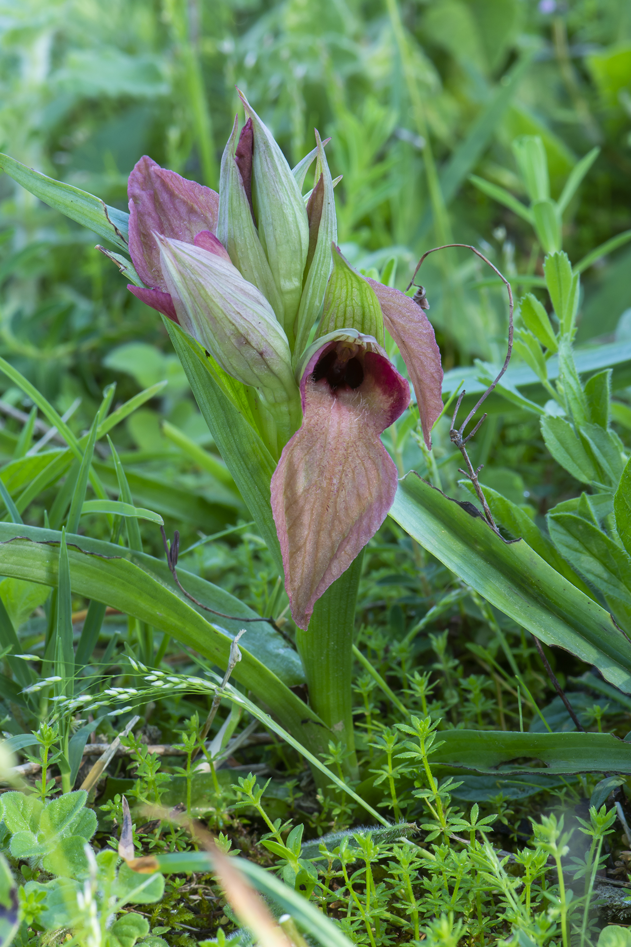 Pianta robusta e di solito non molto alta (15-30 cm), senza arrossamenti o macule nemmeno alla base delle foglie e del caule; 4-8 foglie lanceolate, suberette, carenate, arcuate, lunghe 5,5-11 cm; brattee più corte del casco, ovato-lanceolate, grigio-verdastre con sfumature violacee e striature più scure. Infiorescenza densa e corta, largamente ovoide-cilindrica con 4-9 fiori chiari, profumati, di solito a colori rosa-rossastri non accesi. Casco tepalico breve e allargato, orizzontale o rivolto leggermente verso l’alto, grigio-argenteo con striature rossastre, più o meno come le brattee; sepali un po’ più stretti rispetto a S. cordigera (20-28 × 6,75 mm), un po’ più lunghi dei petali (18-24 × 6-8 mm), che hanno base larga e bruno-violacea, e schiariscono verso l’apice. Labello grande come in S. cordigera (lungo 33-45 mm), porporino chiaro, rosso vivo o rosa salmone, piano o appena ripiegato ai lati, ipochilo ed epichilo con margini parzialmente e chiaramente sovrapposti (se distesi); lobi laterali in gran parte emergenti dal casco, rossastri, ipochilo molto largo (14-18,5 × 15-22 mm), più chiaro al centro, con spalle orizzontali o molto lievemente ricadenti, con lamelle basali parallele, rosso-brunastre e lucide; epichilo largo più o meno come l’ipochilo (20-30 × 15-22 mm), comunque grande e più o meno cordiforme come in S. cordigera, roseo o rossastro chiaro, a volte giallastro, pendulo o proiettato obliquamente in avanti, con abbondante pelosità biancastra al centro; ginostemio giallo-rossastro, pollinii olivastri.