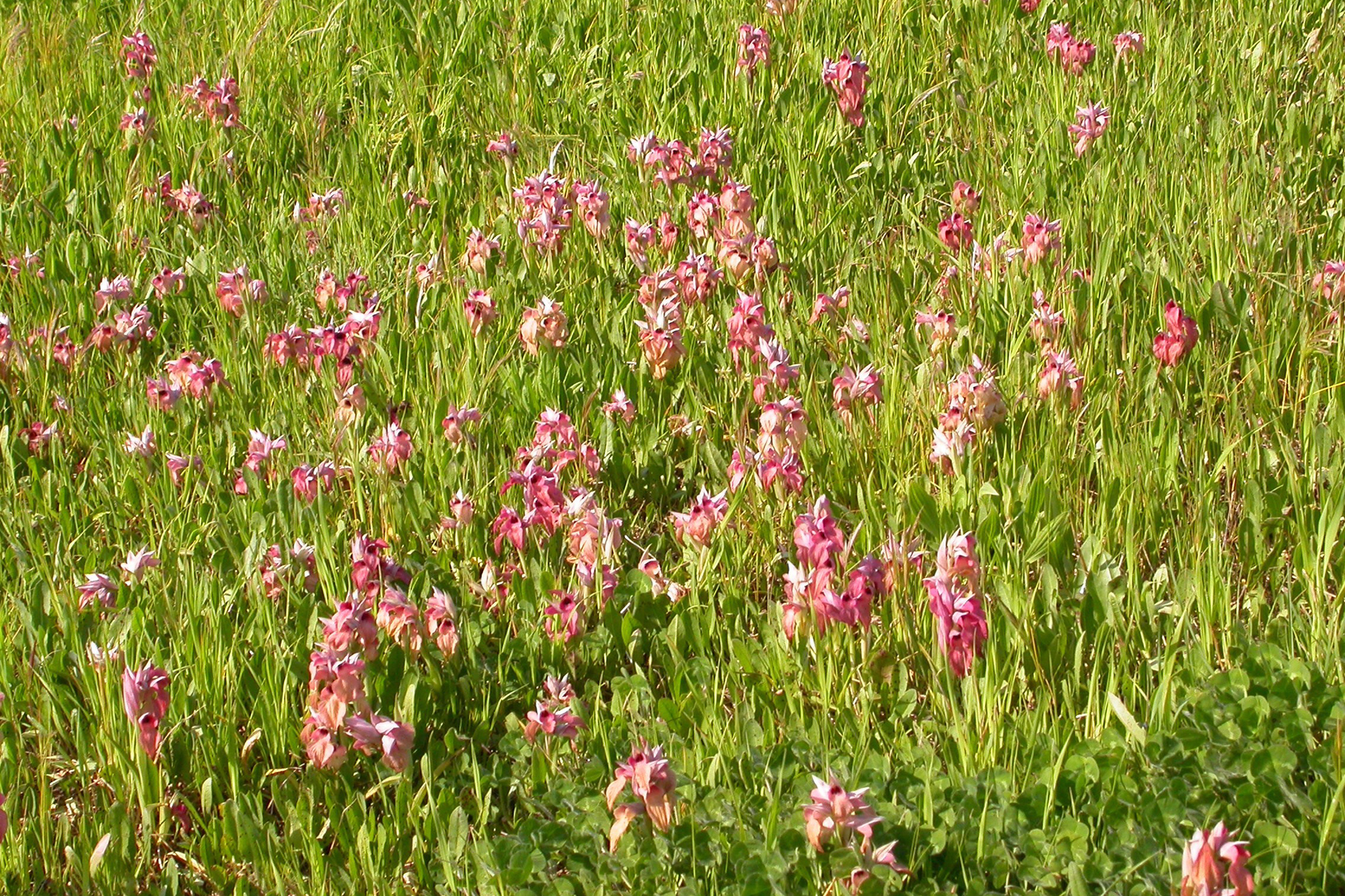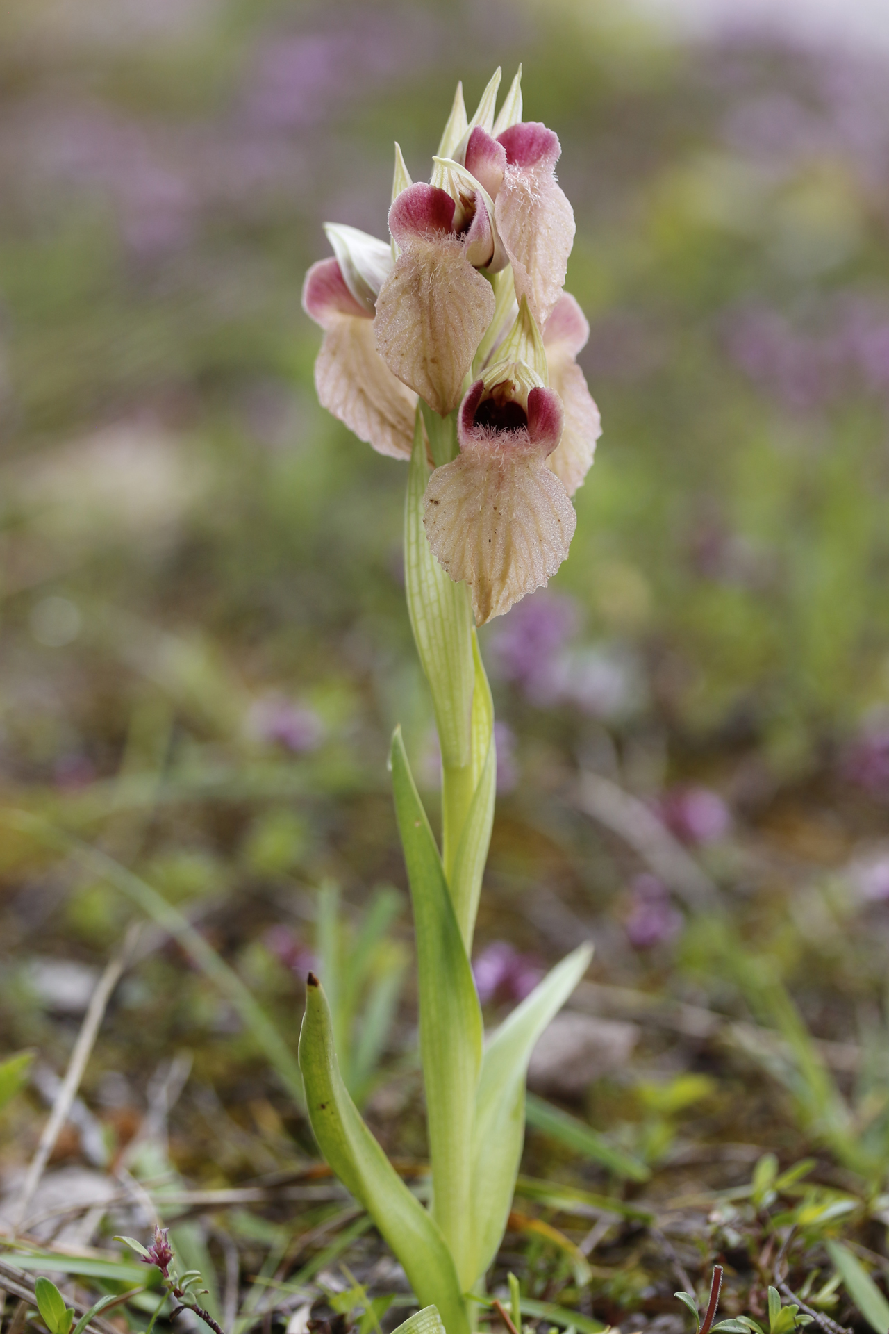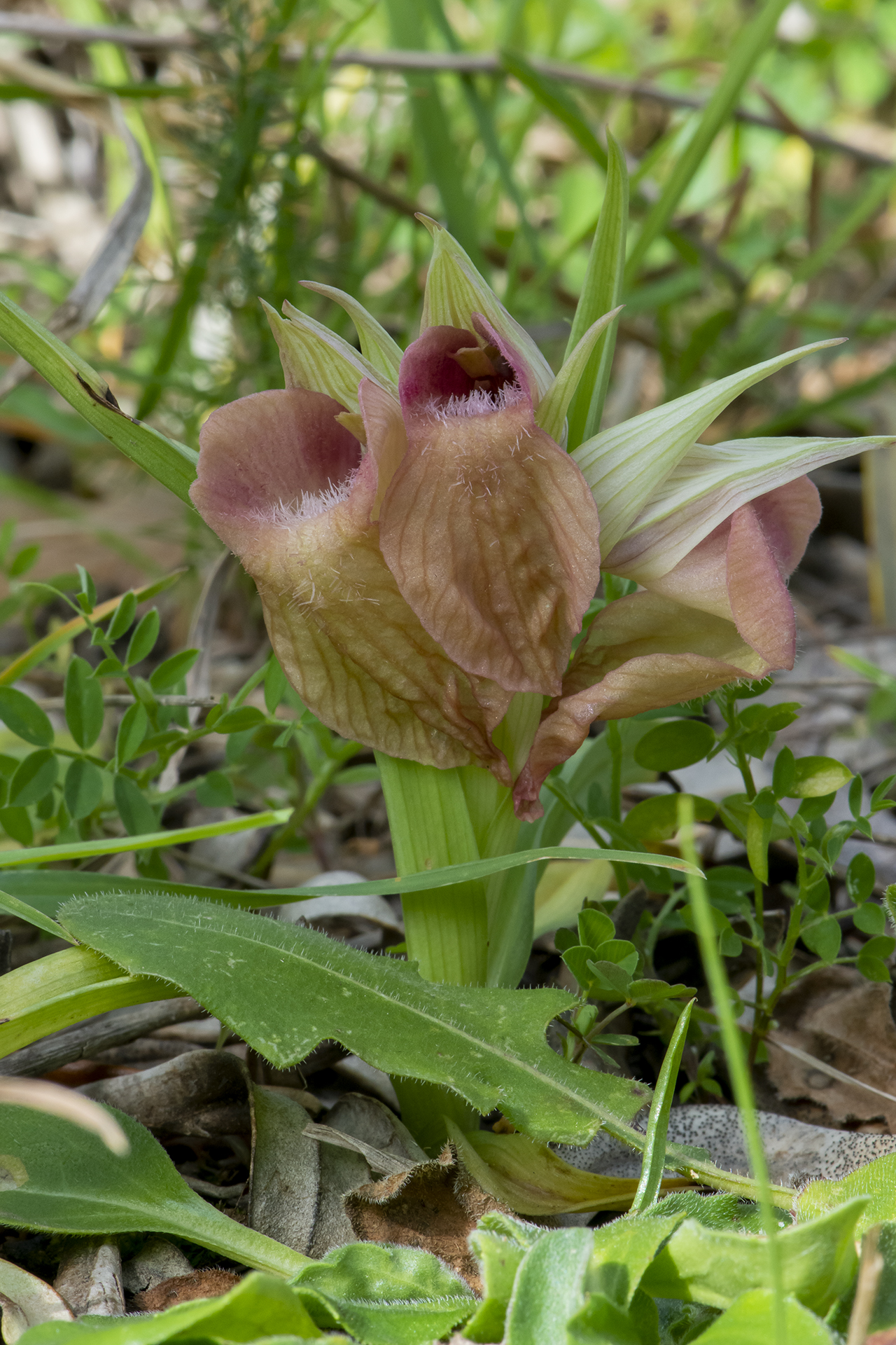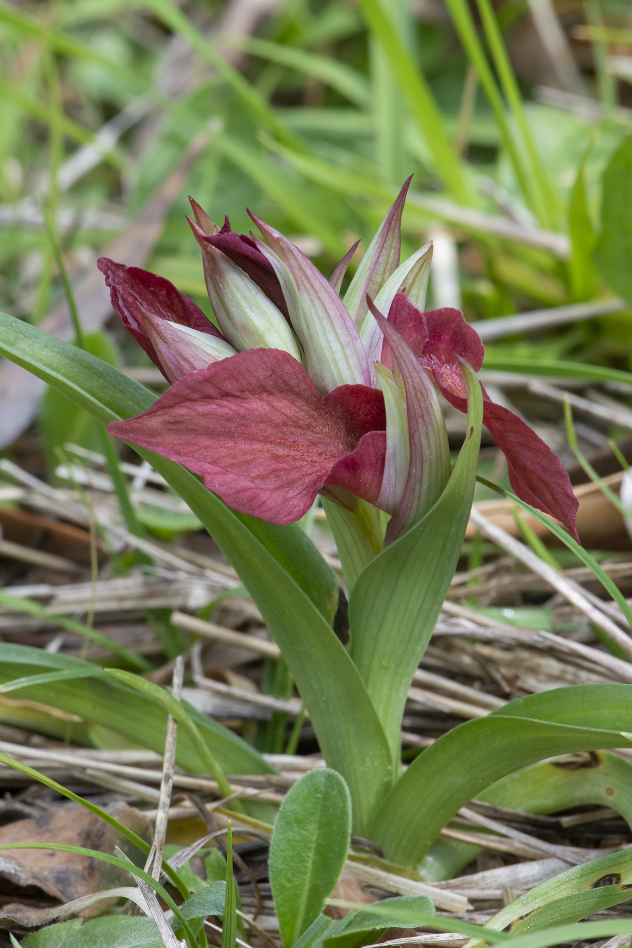 Pianta robusta e di solito non molto alta (15-30 cm), senza arrossamenti o macule nemmeno alla base delle foglie e del caule; 4-8 foglie lanceolate, suberette, carenate, arcuate, lunghe 5,5-11 cm; brattee più corte del casco, ovato-lanceolate, grigio-verdastre con sfumature violacee e striature più scure. Infiorescenza densa e corta, largamente ovoide-cilindrica con 4-9 fiori chiari, profumati, di solito a colori rosa-rossastri non accesi. Casco tepalico breve e allargato, orizzontale o rivolto leggermente verso l’alto, grigio-argenteo con striature rossastre, più o meno come le brattee; sepali un po’ più stretti rispetto a S. cordigera (20-28 × 6,75 mm), un po’ più lunghi dei petali (18-24 × 6-8 mm), che hanno base larga e bruno-violacea, e schiariscono verso l’apice. Labello grande come in S. cordigera (lungo 33-45 mm), porporino chiaro, rosso vivo o rosa salmone, piano o appena ripiegato ai lati, ipochilo ed epichilo con margini parzialmente e chiaramente sovrapposti (se distesi); lobi laterali in gran parte emergenti dal casco, rossastri, ipochilo molto largo (14-18,5 × 15-22 mm), più chiaro al centro, con spalle orizzontali o molto lievemente ricadenti, con lamelle basali parallele, rosso-brunastre e lucide; epichilo largo più o meno come l’ipochilo (20-30 × 15-22 mm), comunque grande e più o meno cordiforme come in S. cordigera, roseo o rossastro chiaro, a volte giallastro, pendulo o proiettato obliquamente in avanti, con abbondante pelosità biancastra al centro; ginostemio giallo-rossastro, pollinii olivastri.