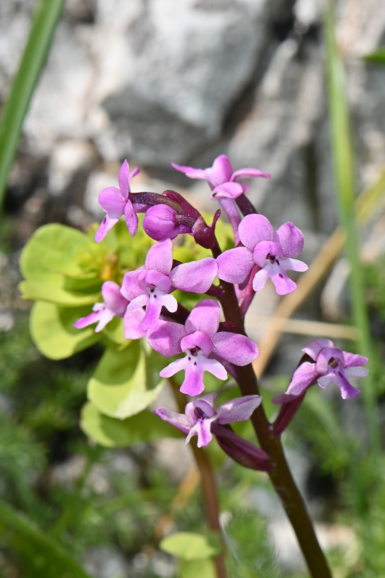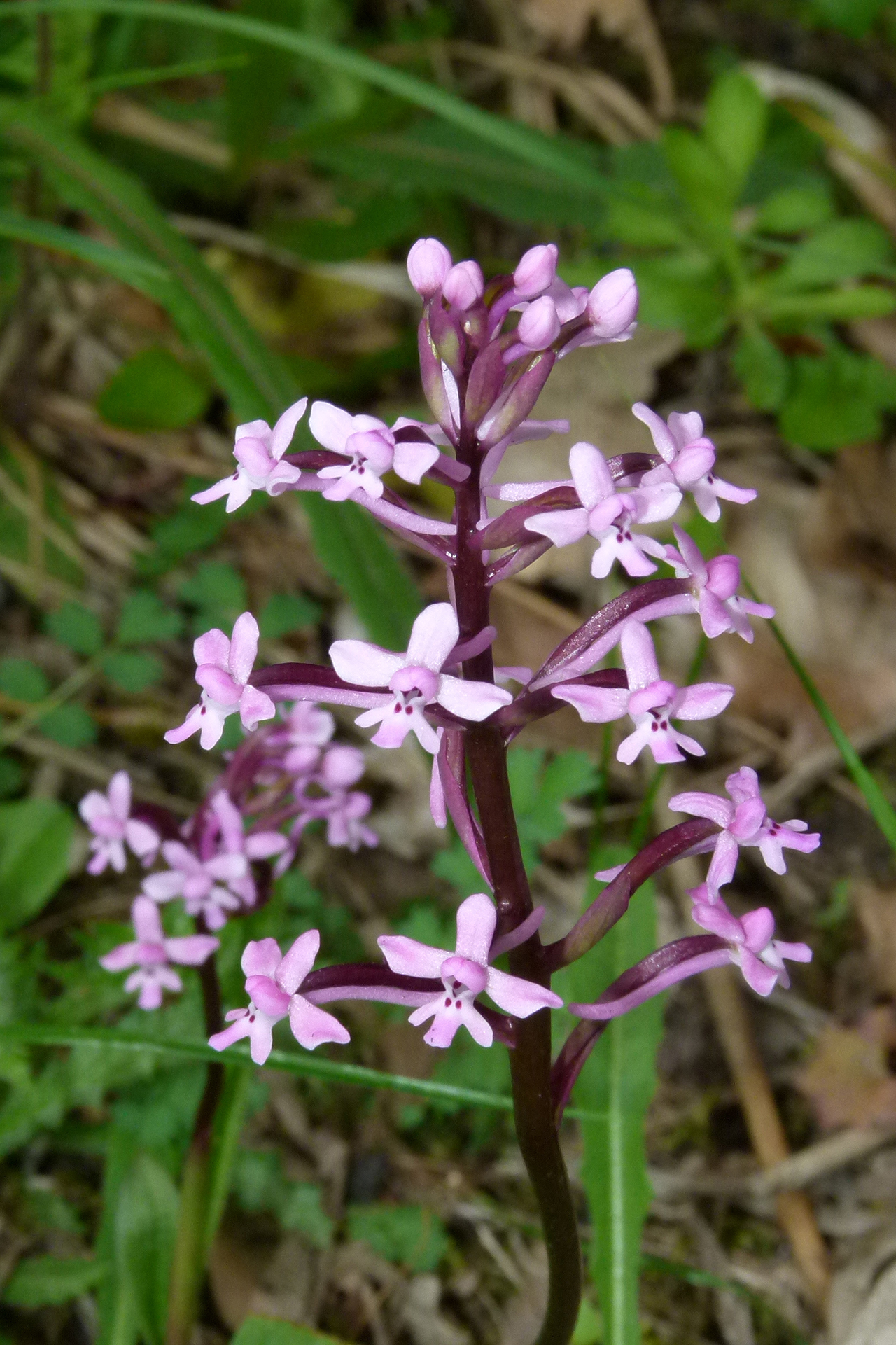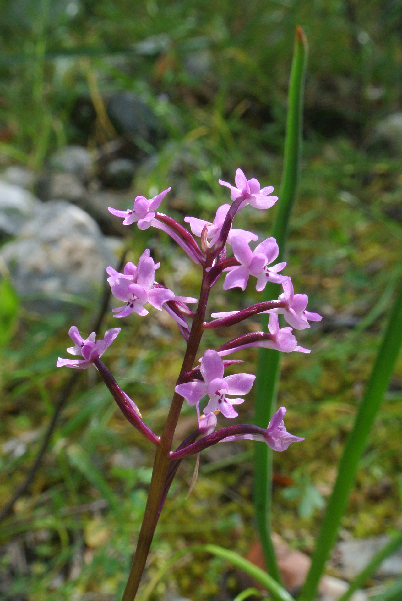 Pianta piccola e gracile, alta 10-25 cm; 2-4 foglie basali mai maculate, da oblunghe a strettamente lanceolate (6-10 × 1-1,5 cm), le cauline più piccole e guainanti il fusto. Infiorescenza più lassa e pauciflora, con 3-25 fiori molto piccoli di colore rosa più o meno intenso. Sepali liberi, tutti lunghi 3-5 mm, i petali ancora più piccoli e conniventi a casco. Anche il labello molto piccolo (lungo 3-5 mm, in genere più ridotto dei sepali), con piccole macchie porporine, (1)2 verso la base e altre (1)2 nella fauce dello sperone; lobi laterali lineari, ottusi e fortemente divergenti, poco più corti e stretti del lobo centrale, che appare quadrangolare con angoli arrotondati.