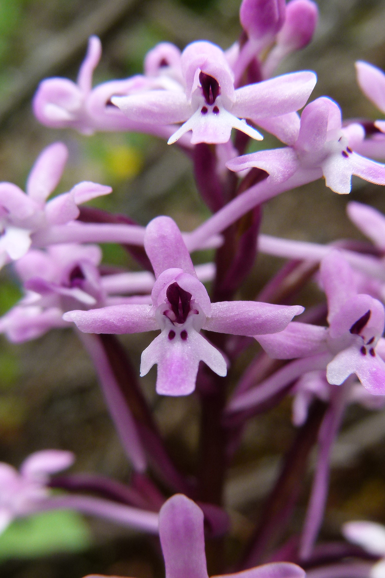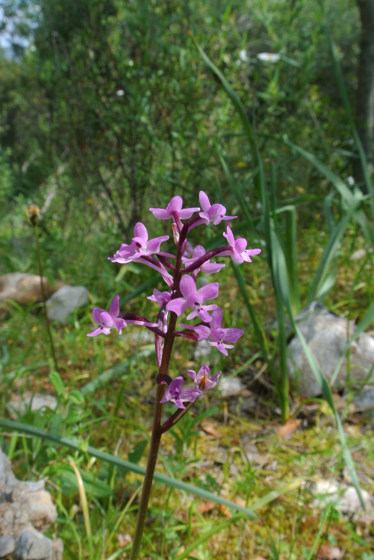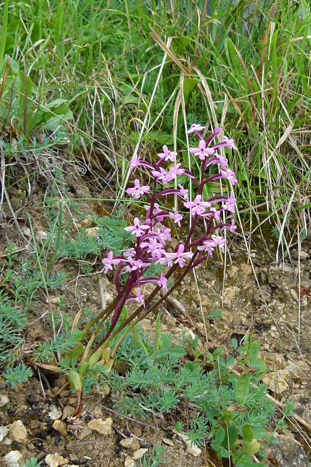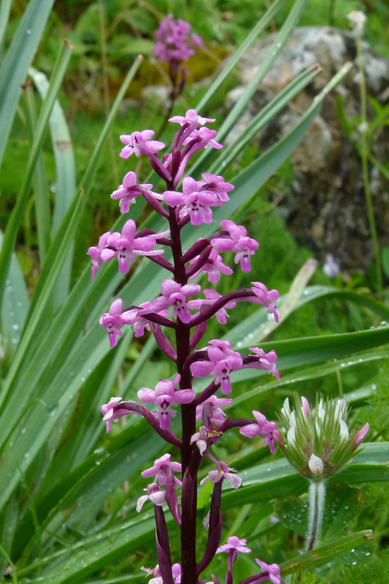 Pianta piccola e gracile, alta 10-25 cm; 2-4 foglie basali mai maculate, da oblunghe a strettamente lanceolate (6-10 × 1-1,5 cm), le cauline più piccole e guainanti il fusto. Infiorescenza più lassa e pauciflora, con 3-25 fiori molto piccoli di colore rosa più o meno intenso. Sepali liberi, tutti lunghi 3-5 mm, i petali ancora più piccoli e conniventi a casco. Anche il labello molto piccolo (lungo 3-5 mm, in genere più ridotto dei sepali), con piccole macchie porporine, (1)2 verso la base e altre (1)2 nella fauce dello sperone; lobi laterali lineari, ottusi e fortemente divergenti, poco più corti e stretti del lobo centrale, che appare quadrangolare con angoli arrotondati.