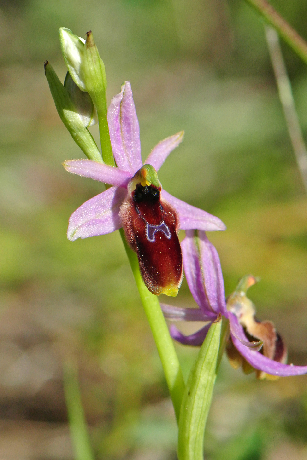 Sepali biancastri, rosei o rossastri, ovato-lanceolati (11-16 × 4,5-7 mm), con nervature verdi, a margini incurvati, i laterali diretti obliquamente verso il basso, il mediano arcuato in avanti; petali molto stretti, lineari-lanceolati, concolori ai sepali e lunghi circa 2/3 di questi (8-11 × 2-3 mm), con margini non ondulati. Labello subtrilobo, pendulo, che appare stretto e allungato per la forte convessità longitudinale (in realtà disteso è meno lungo che largo (10-14 × 13-18 mm), da rossastro scuro a bruno-nerastro, vellutato al centro e con pelosità submarginale lunga, folta, da arancio a bruno-rossastra chiara; lobo mediano bruno-rossastro, a margine giallo e glabro più o meno ampio, lobi laterali in posizione basale, villosi all’esterno, prolungati in avanti in due gibbosità poco marcate; macula relativamente piccola e più o meno centrale, con disegni semplici e variabili (a forma di mezzaluna o a grossolana H o U rovesciata, oppure ridotta a due gocce), da grigio-bluastra a rossastra, glabra, lucida, munita a volte di un sottile bordo bianco; apicolo grosso, per lo più triangolare, giallo-verdastro, variamente orientato; cavità stigmatica stretta, senza area centrale più chiara, pseudo-occhi spostati verso l’interno, neri e globosi, lucidi; ginostemio allungato e a volte leggermente sinuoso, formante un angolo aperto (retto o quasi) con il labello. Impollinata da Osmia kohli.