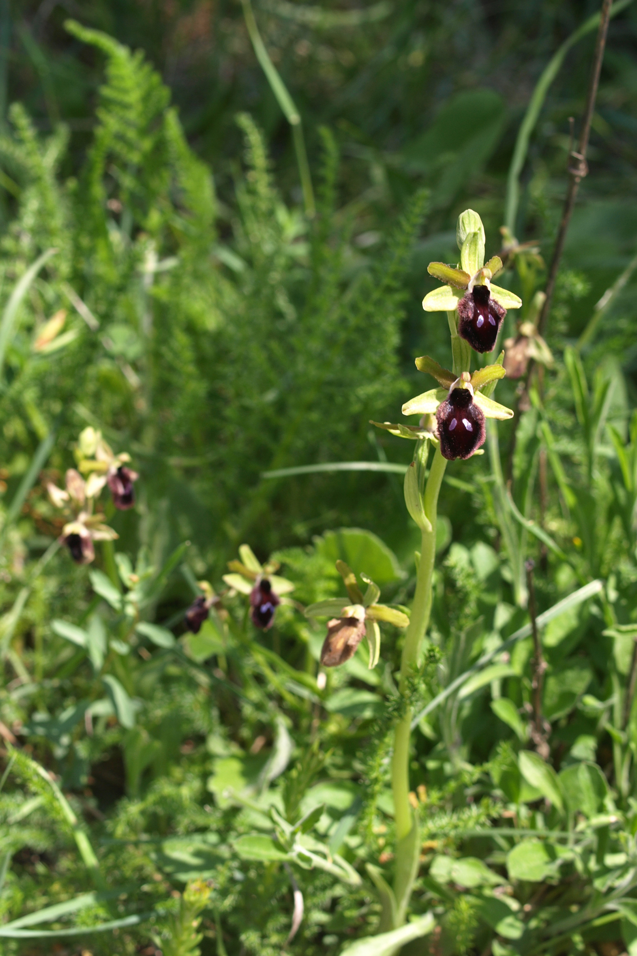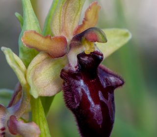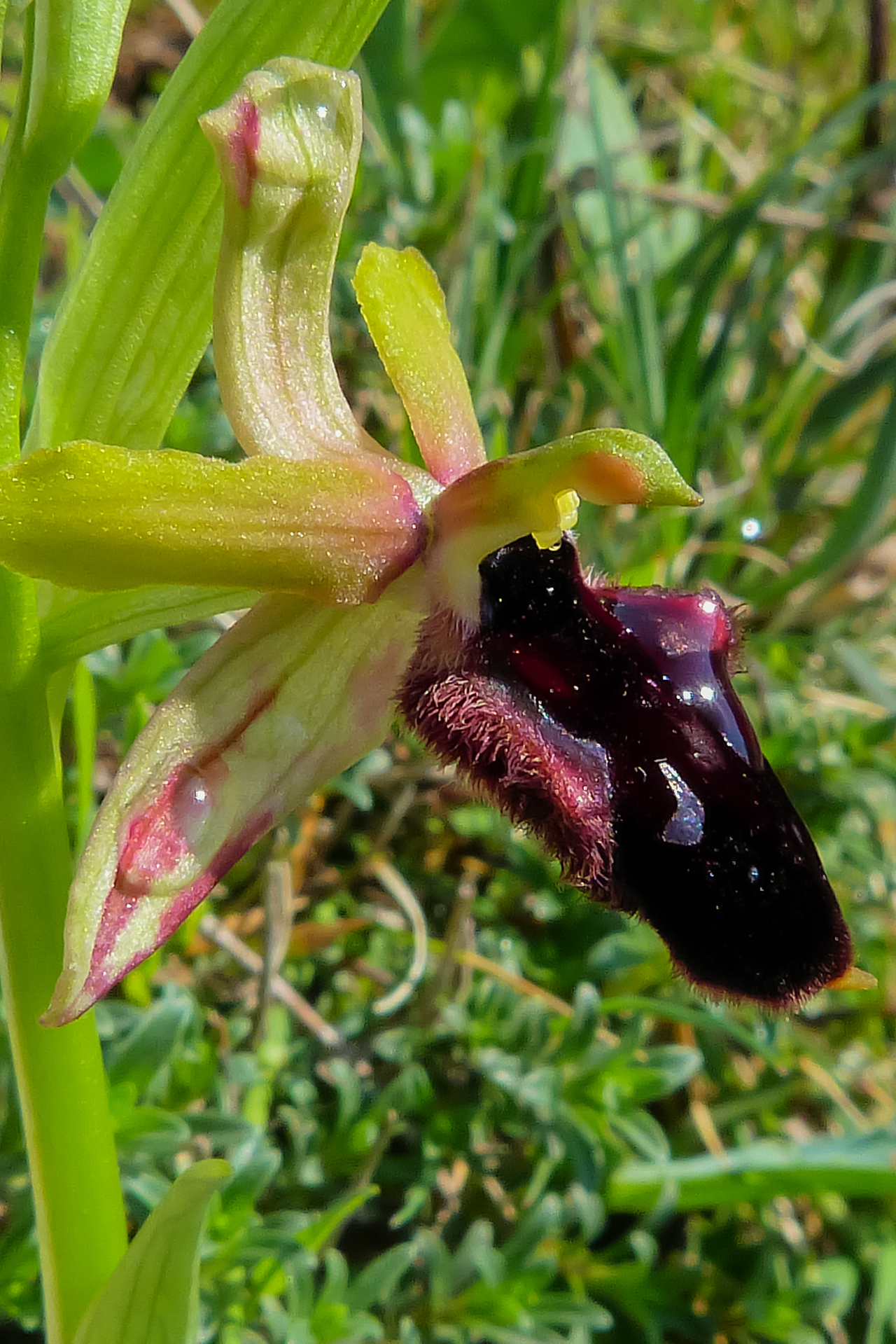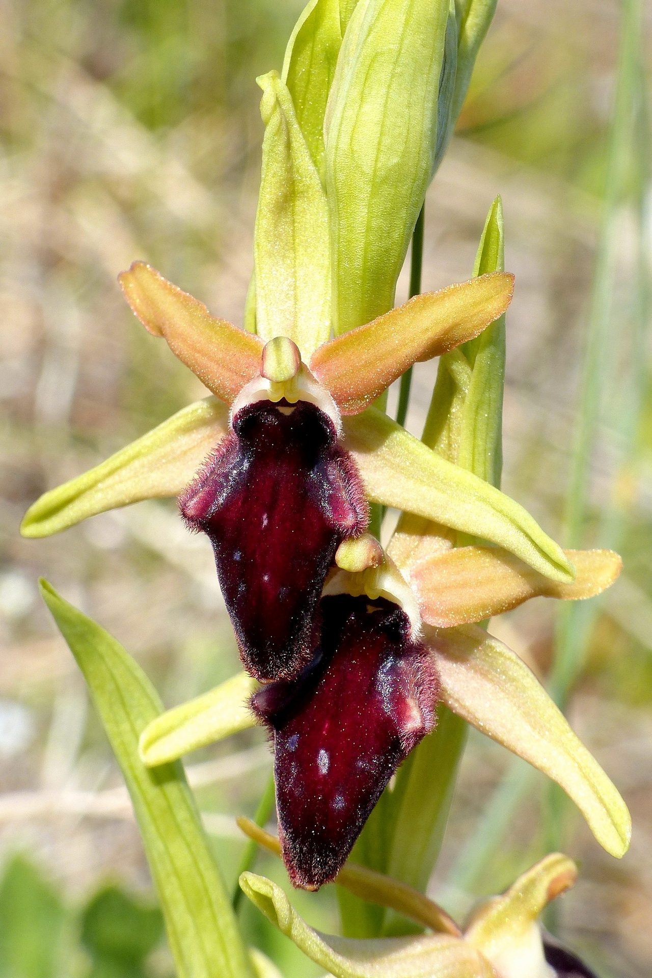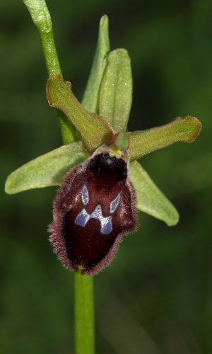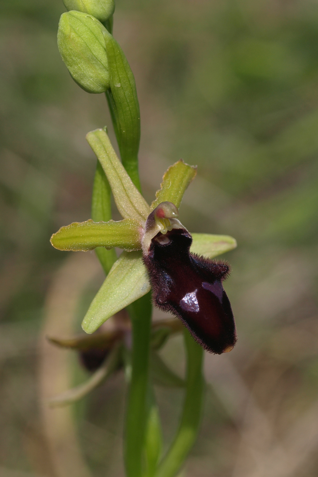 pianta più bassa (fino a 30 cm). Infiorescenza assai lassa e pauciflora (2-7 fiori grandi). Tepali un po’ più lunghi (i sepali 11,5-17 × 4-6 mm, i petali anche più larghi: 8-12 × 4-6 mm), i primi di color verde chiaro, spesso con toni bianco-giallastri o sfumati di rosa o bruno, i secondi regolarmente più scuri dei sepali e spesso a margini ondulati e ciliati. Labello intero, da suborbicolare a obcordiforme (9,5-15 × 10-15 mm), convesso e per questo a volte apparentemente ovoide-allungato, la parte distale spesso ripiegata all’indietro, senza margine giallo; densa e lunga pelosità submarginale bruno-rossastra, il resto del labello è bruno molto scuro; gibbosità spesso importanti; macula piccola e centrale, di forma variabile, spesso due piccole gocce anche allungate e unite a forma di U o V rovesciata (‘a occhiali’), qualche volta scutiforme o perfino assente, bluastra o violacea o anche nerastra; apicolo piccolo ma evidente, triangolare; cavità stigmatica molto larga e arrotondata; pseudo-occhi piccoli, non sempre ben visibili; ginostemio formante un angolo retto con il labello. Impollinata da Osmia mustelina.