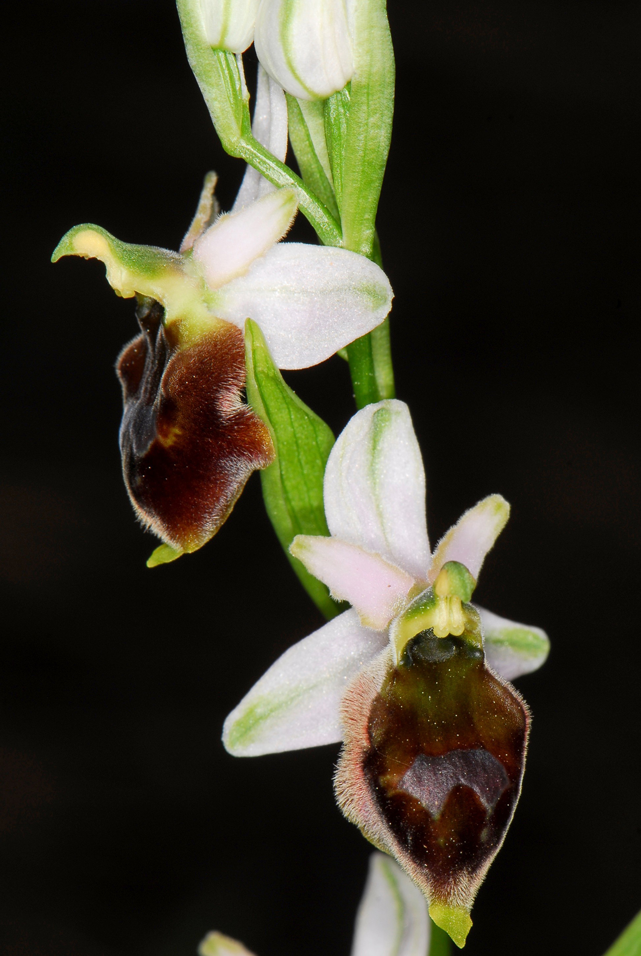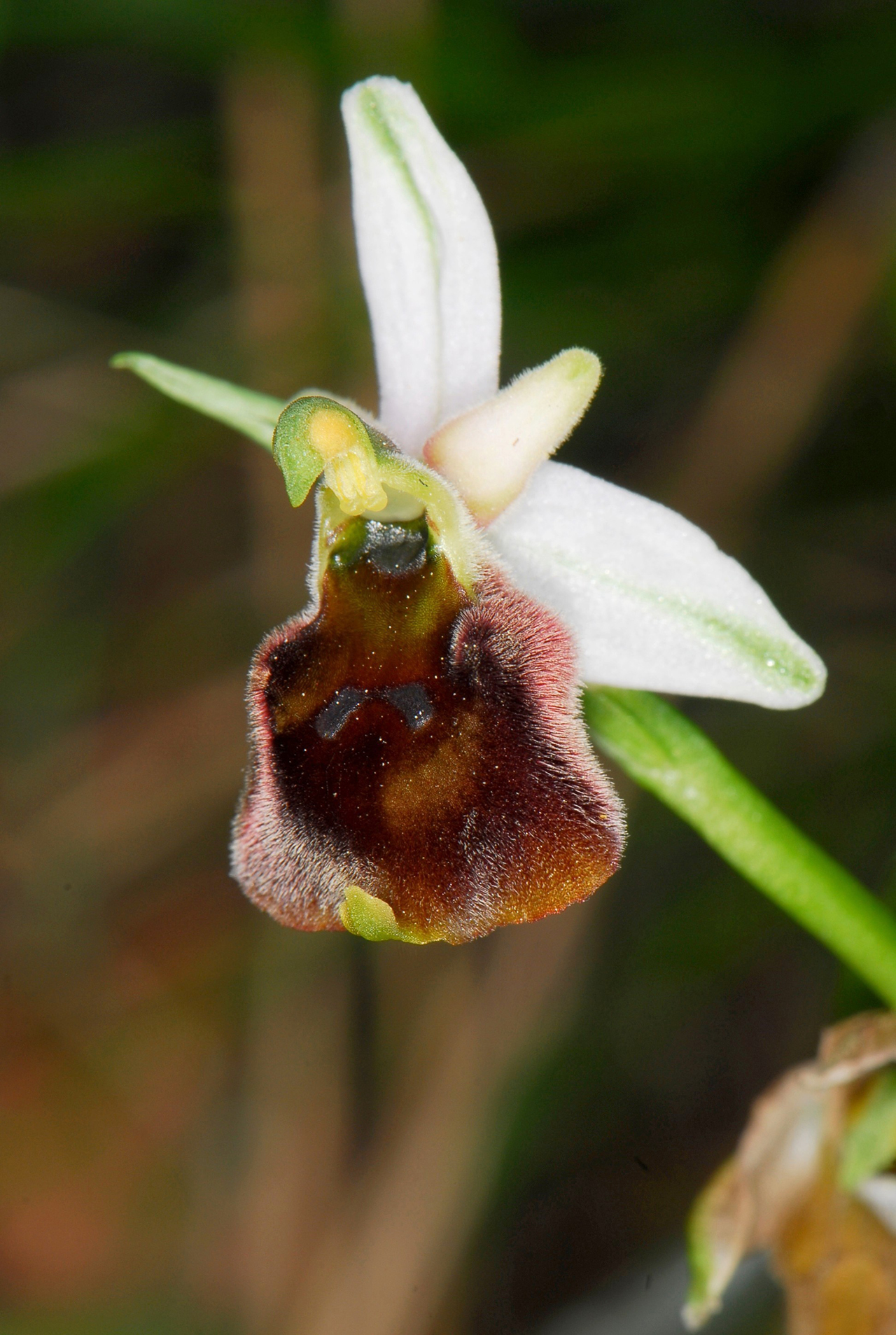 Pianta robusta e slanciata, alta fino a 70 cm, con 3-10 fiori grandi; brattee più lunghe dell’ovario. Tepali da biancastri a rosei fino a rosso-violacei, raramente verdastri, di solito con linea mediana verde, i sepali 12-17 × 6-8,5 mm, distesi o un po’ inclinati all’indietro, i petali lunghi circa 2/3 dei sepali (4-10 × 2,5-4,5 mm), subtriangolari o a margini subparalleli, ad apice arrotondato e bordi non ondulati, vellutati, raramente auricolati. Labello grande (11-15 × 13-19 mm), convesso, subgloboso-subovoide, gibbosità basali solitamente assenti, spesso con parte basale verdastra o aranciata e parti laterali e distale rosso-brunastre più scure; pelosità submarginale ampia, fitta, bruno-rossastra più o meno chiara; macula semplice, a volte poco visibile, a forma di U rovesciata o divisa in due parti separate talvolta ridotte a due gocce o losanghe, lucida e piccola, in posizione centrale o anche spostata verso l’apice; apicolo evidente ma non molto grande rispetto al labello, giallo-verdastro, da triangolare a tridentato, rivolto in basso o in avanti; ginostemio a rostro allungato, formante un angolo ottuso col labello; campo basale spesso non delimitato, un po’ più chiaro o concolore alla parte basale del labello; cavità stigmatica bassa e larga, a forma di campana, spesso con pareti laterali leggermente divergenti; pseudo-occhi poco marcati, verdastri. Impollinata da Anthophora plumipes.