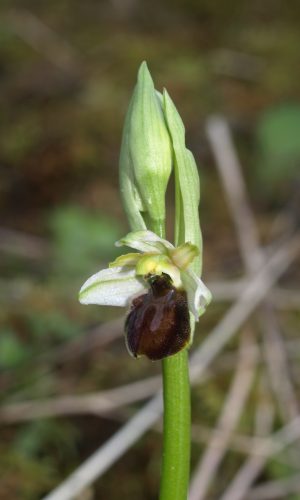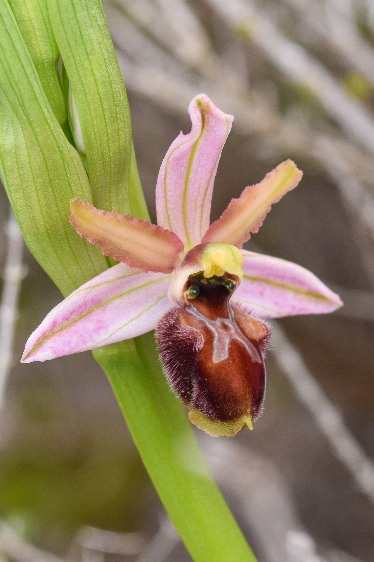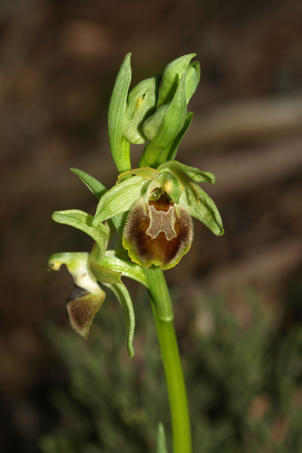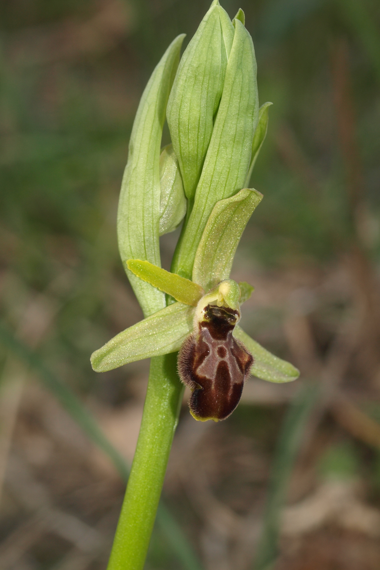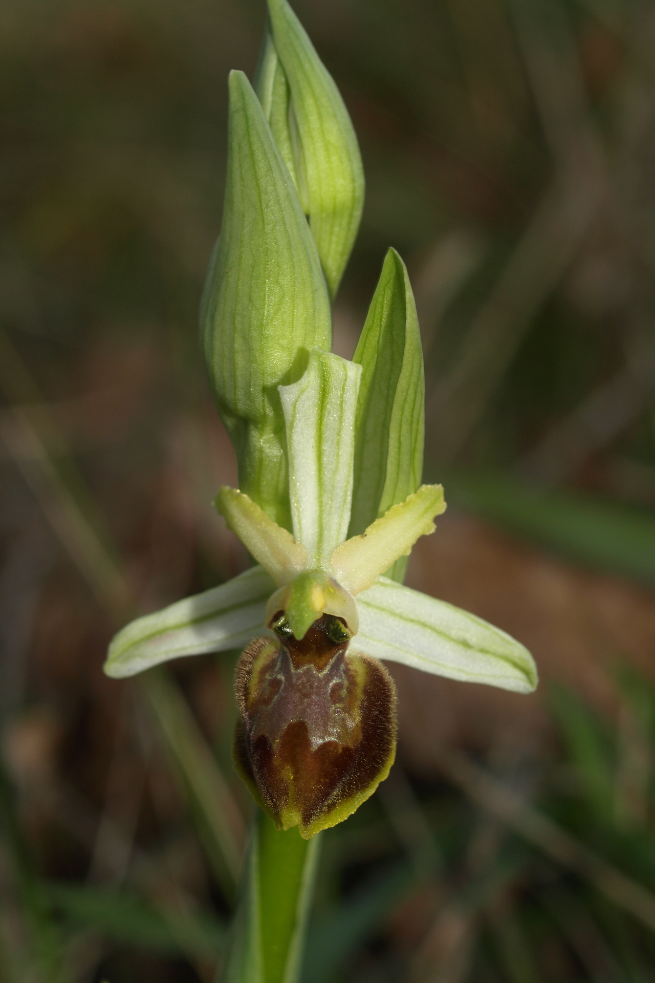 Pianta robusta e slanciata alta fino a 50-60 cm, con 4-15 fiori medio-grandi, brattee più lunghe dell’ovario. Sepali ovati-lanceolati (10-15 × 5,5-9 mm), da bianco-verdastri a rosati a lilla, a volte con toni intensi e con sfumature o nervature verdastre, il dorsale pressoché verticale, formante un angolo ottuso (>110°) con i laterali; petali grandi, relativamente lunghi e stretti (7-11,5 × 2-3,5 mm), glabri, più scuri dei sepali, a volte rossastri, con margine ondulato o dritto. Labello subintero, convesso trasversalmente e relativamente piccolo (9-15 × 10-16 mm), ovoide o a losanga, bruno-marrone-rossastro, con gibbe molto attenuate, pelosità importante submarginale, a volte con bordo glabro più chiaro. Macula basale solitamente semplice, a forma di H o X, a volte ornata di bianco o anche più elaborata e vistosa, estesa dalla parte basale fino a metà o a 2/3 del labello. Campo basale piccolo e concolore al labello, come la cavità stigmatica a base più o meno strozzata; pseudo-occhi grandi, grigi e spesso con cerchiatura chiara. Apicolo molto ridotto, in incisura profonda, rivolto in basso. Impollinata da Colletes cunicularius subsp. infuscatus.