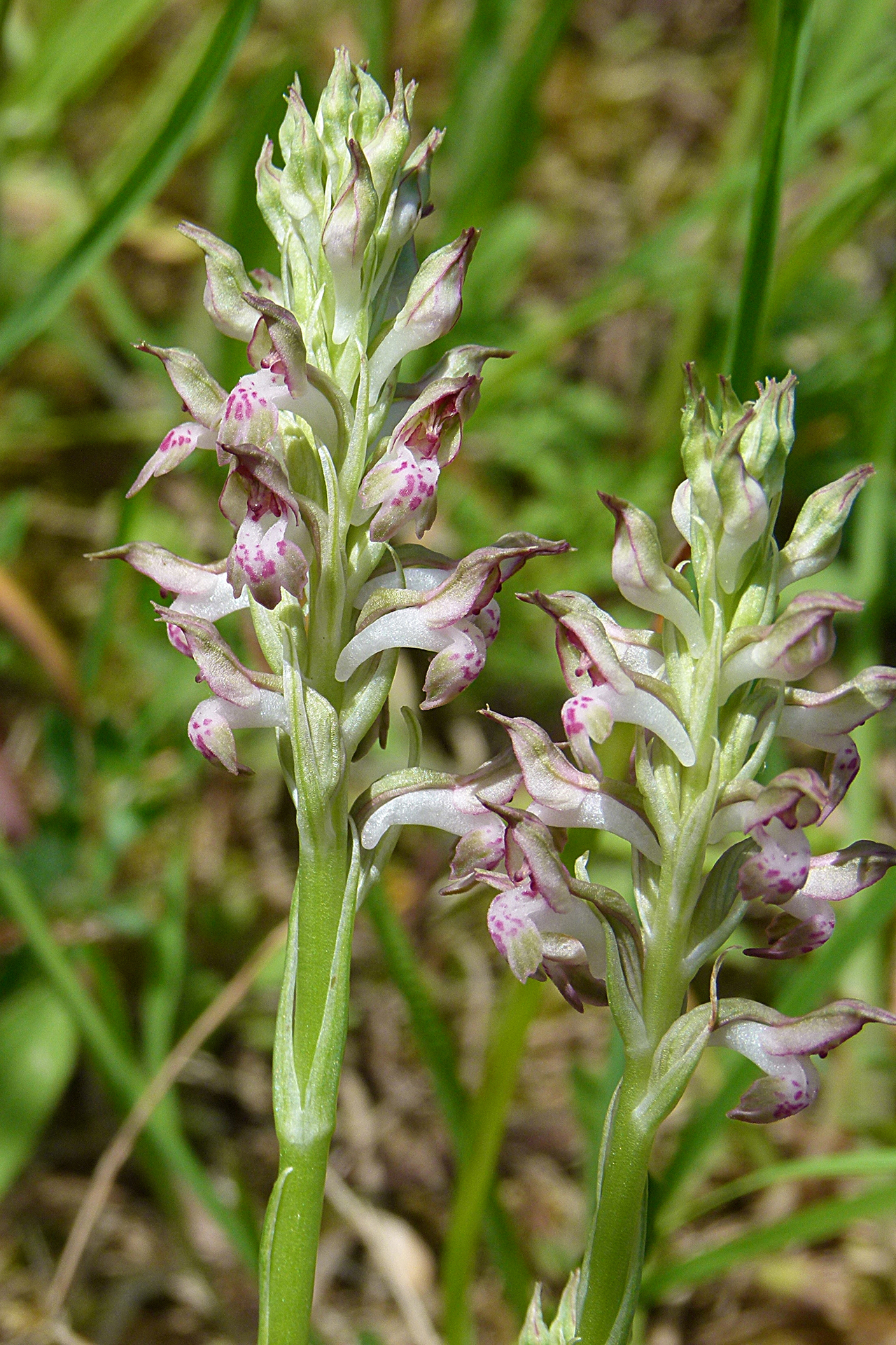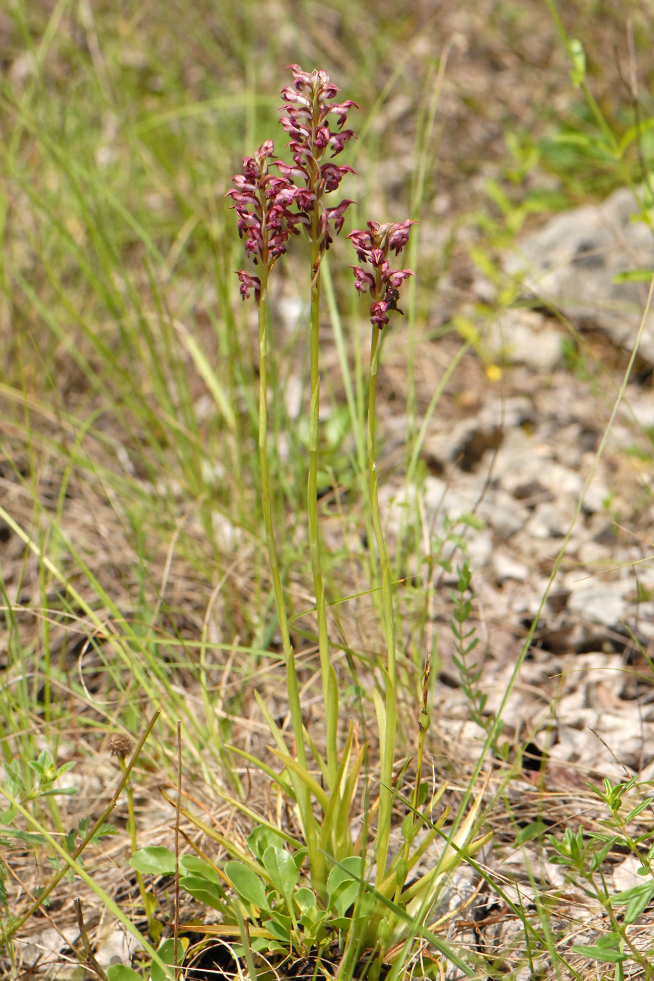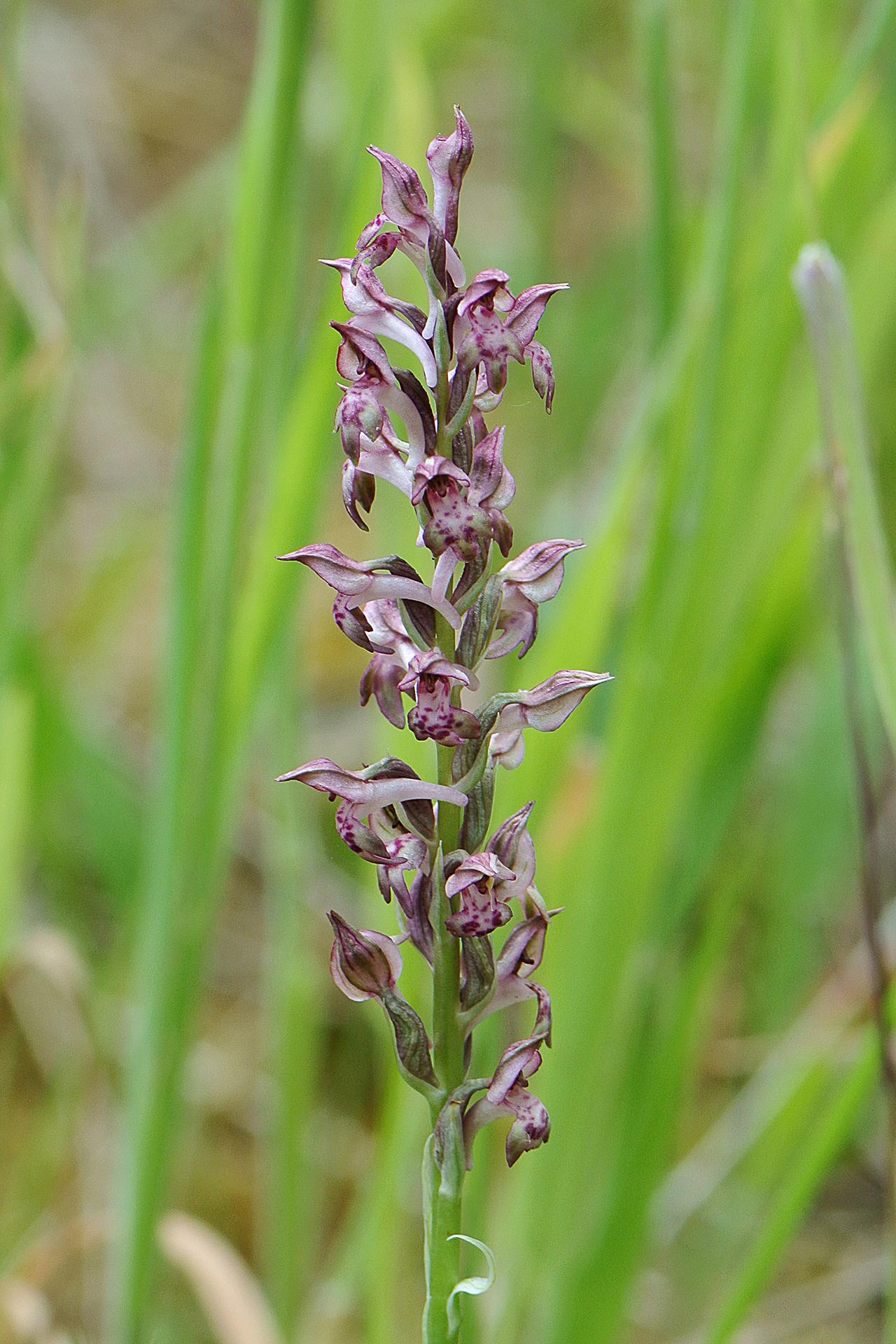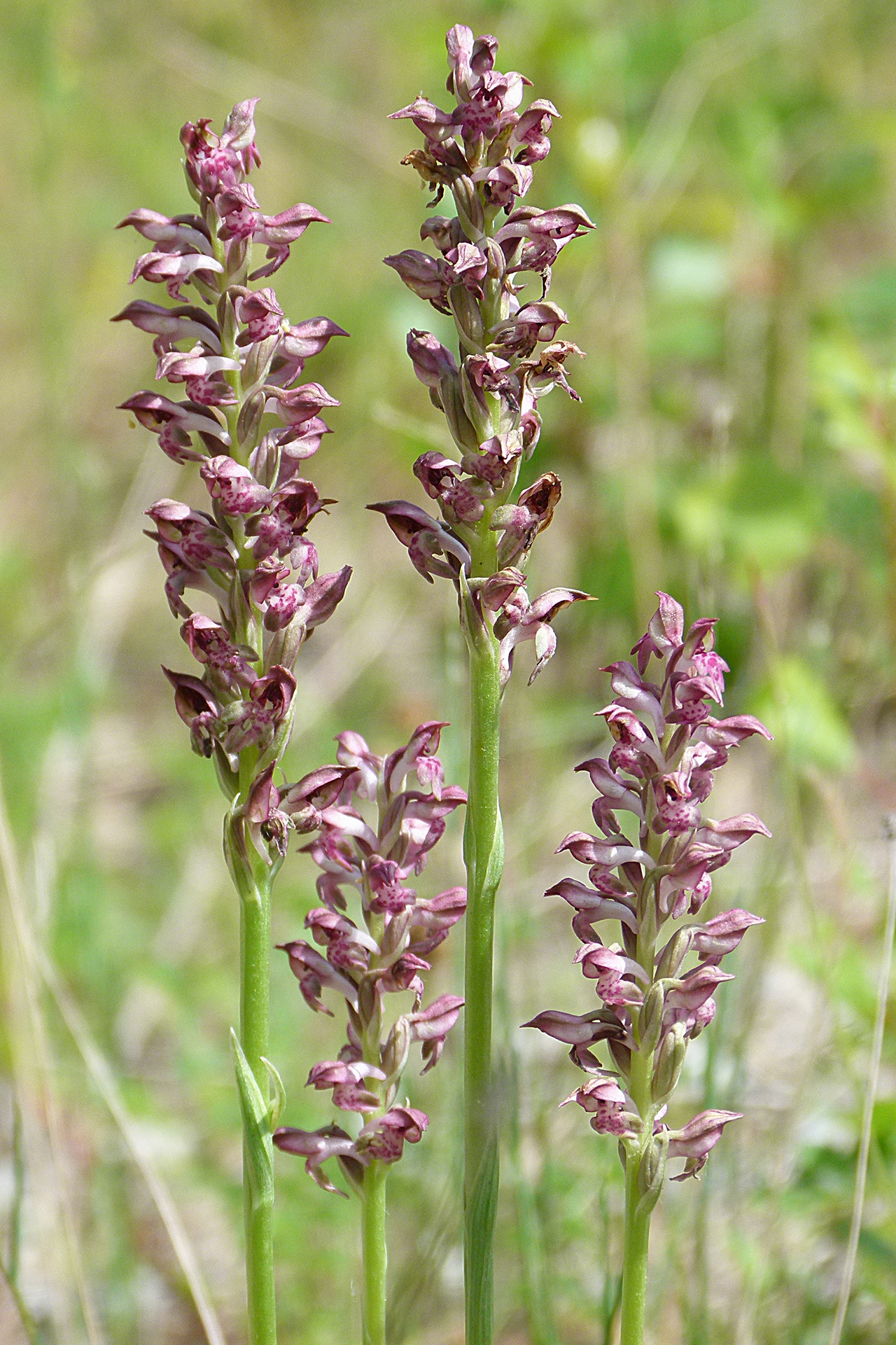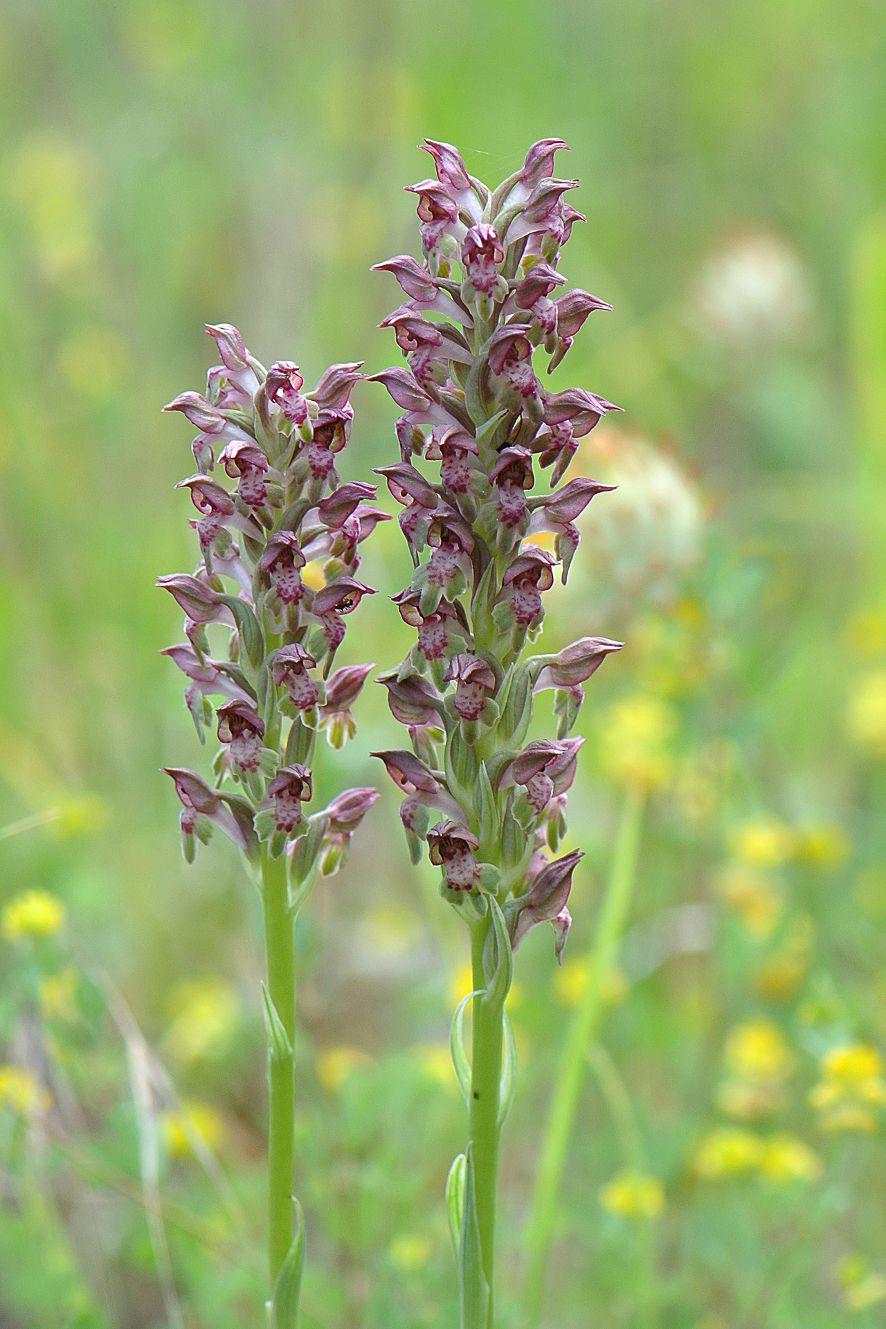Caratteri essenziali e distintivi rispetto ad Anacamptis coriophora: pianta mediamente più variabile per taglia e colori, un po’ più gracile e slanciata, a volte più alta di 40 cm; foglie basali quasi lineari, quelle cauline più piccole e meno numerose; brattee lanceolate, carenate, biancastre con evidente nervature longitudinale verdi. Infiorescenza più densa, allungata e multiflora (fino a 100 fiori); fiori bruno-rossastri, di solito chiari, a volte biancastri con casco verdastro, leggermente profumati o inodori. Casco più acuminato e allungato, labello solitamente piuttosto chiaro, da biancastro fino a rossastro, con lobo mediano più lungo dei laterali e spesso meno incurvato all’indietro; sperone sempre più chiaro del labello e in genere della stessa lunghezza. Numero cromosomico: 2n = 36.