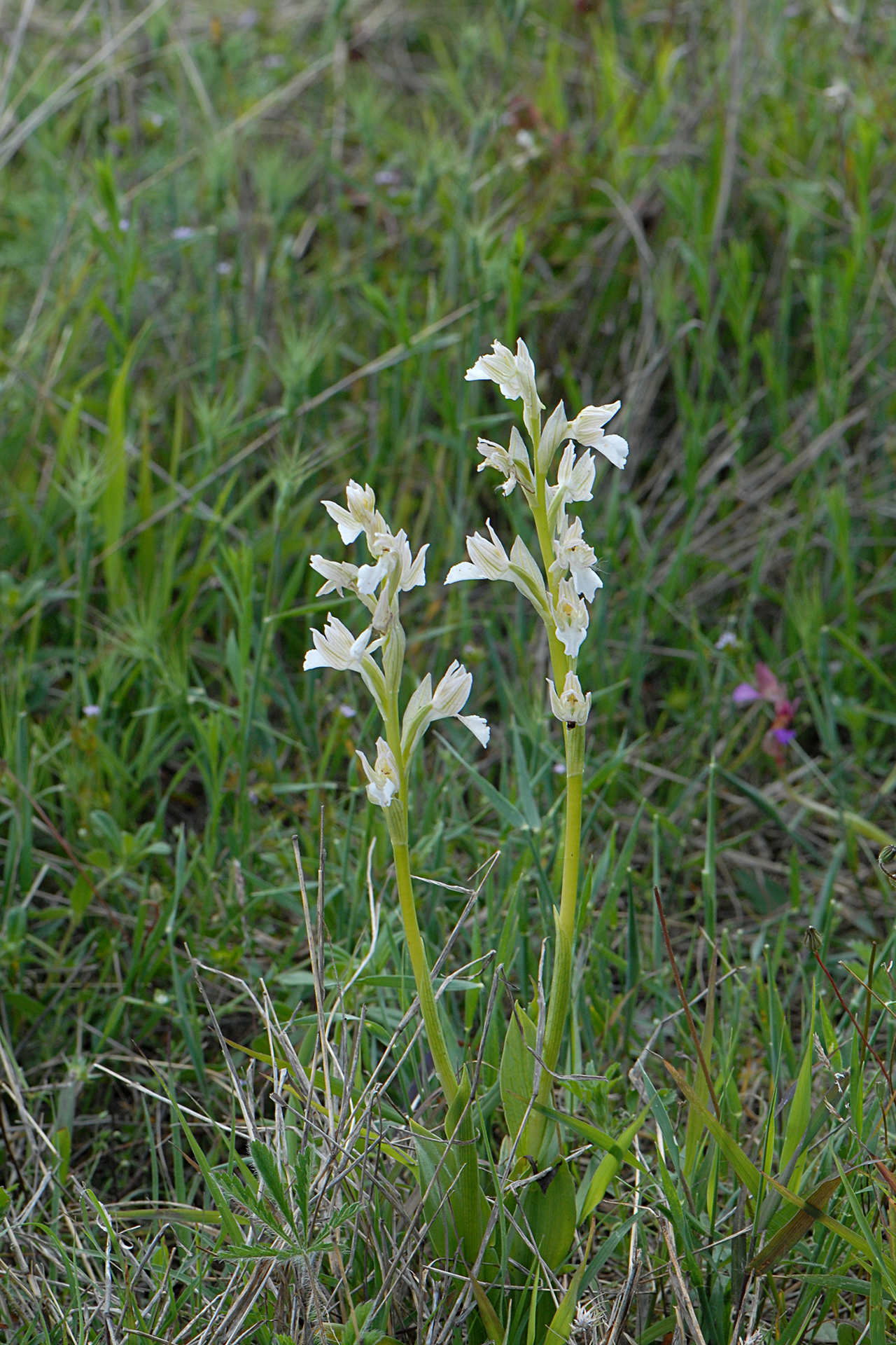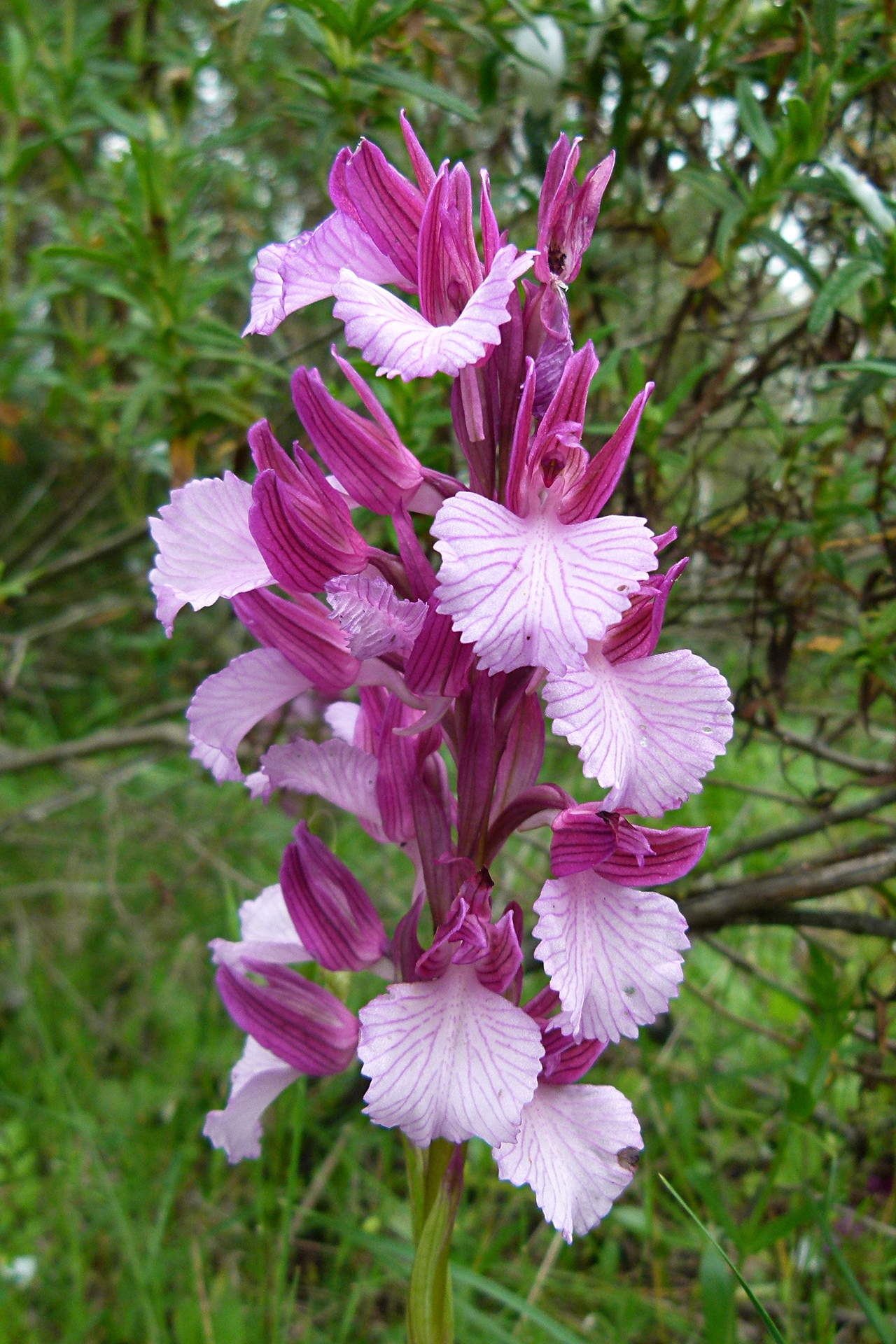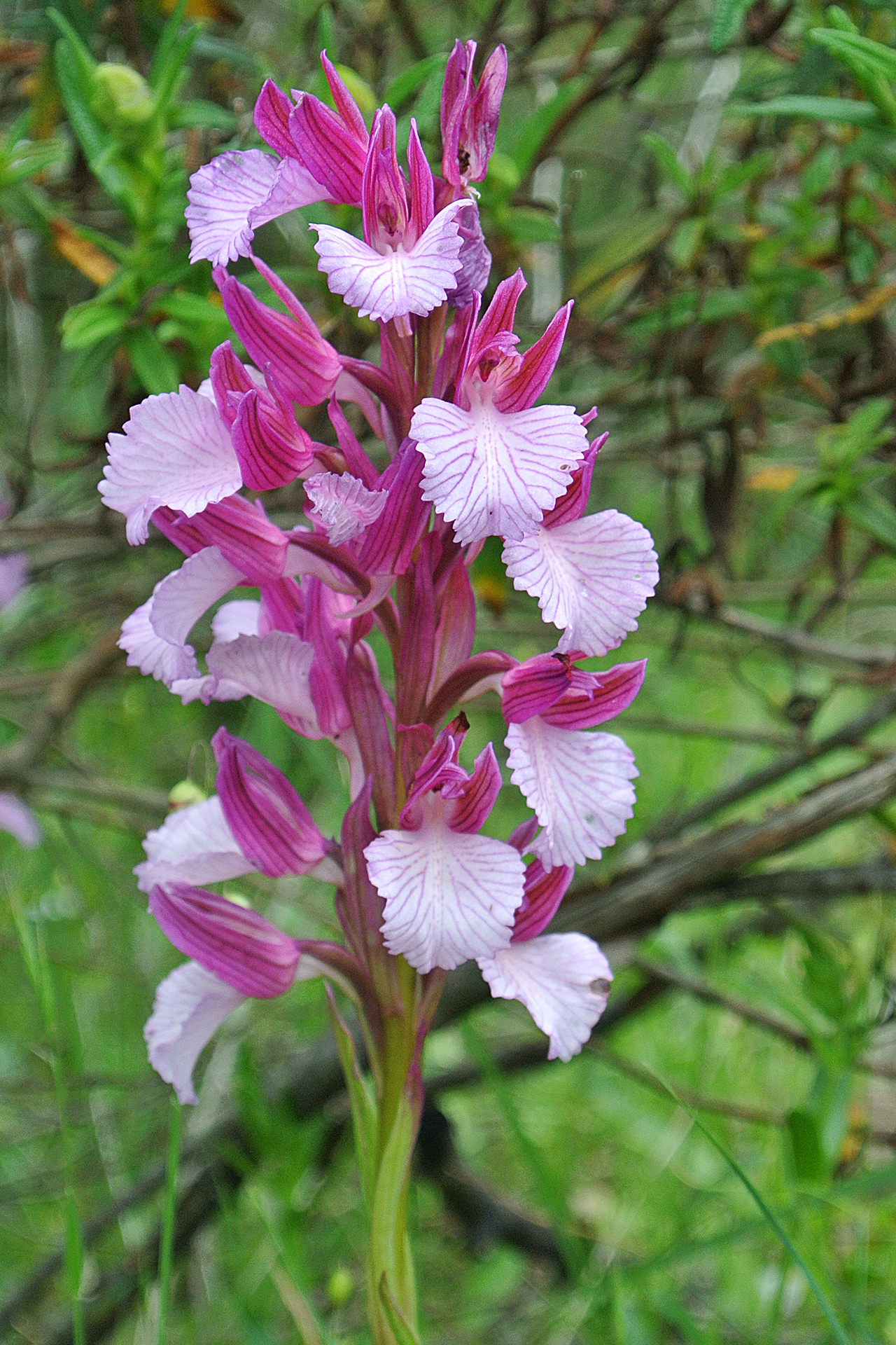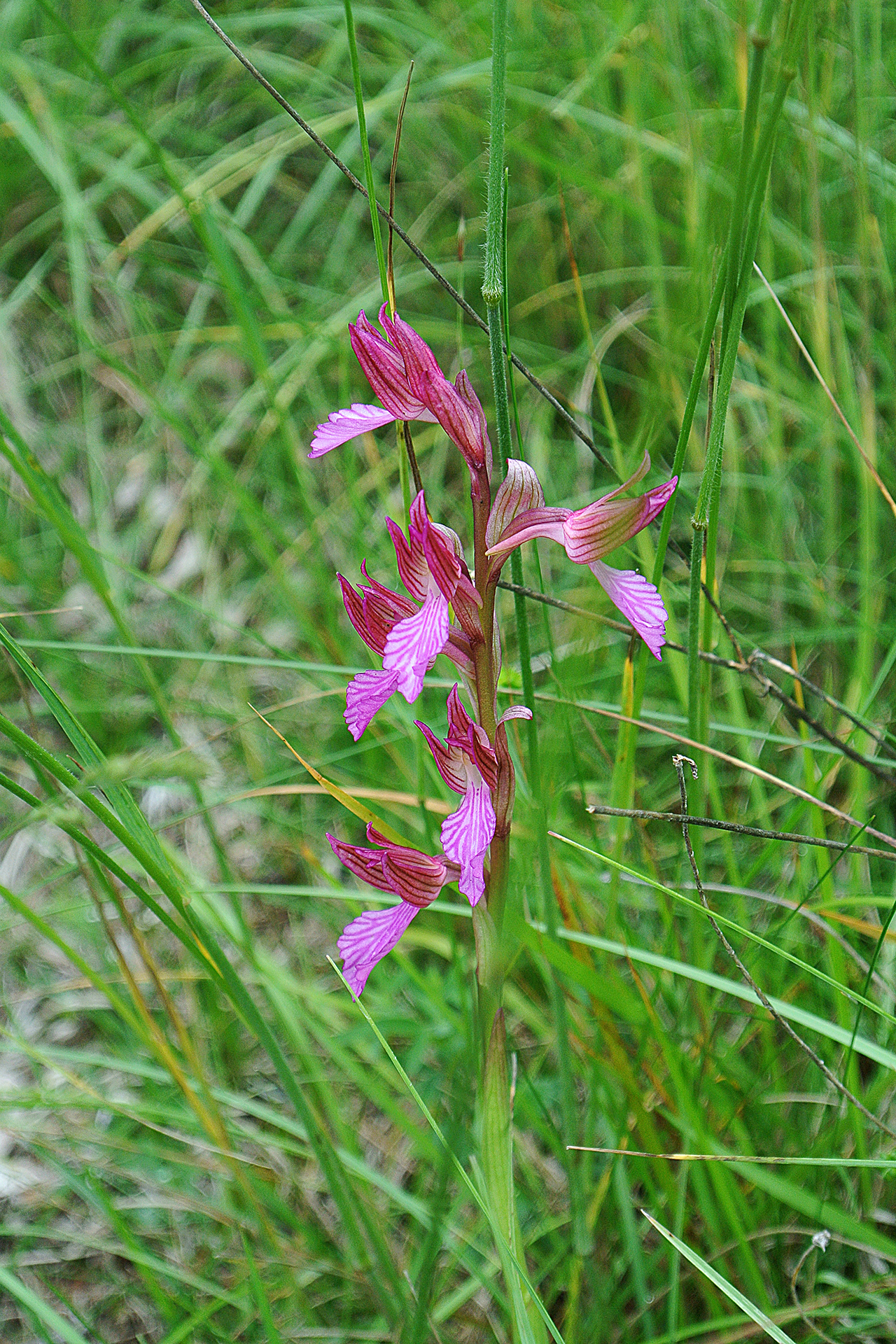 Descrizione del tipo (var. papilionacea): pianta alta 15-30(40) cm; scapo cilindrico, angoloso, in alto sfumato di rosso; fino a 9 foglie basali lineari-lanceolate 3-18 × 0,5-2 cm), distese o suberette, carenate, acute, le basali di color verde-glauco, le cauline più piccole e sfumate di rosso, lungamente guainanti il fusto, di grandezza decrescente verso l’alto, fino a diventare bratteiformi; brattee porporine, con evidenti nervature brunastre, ovato-lanceolate, acute o subottuse. Infiorescenza con 6-10(20) fiori medio-grandi, prima ovoide e densa, in seguito cilindrica e lassa. Tepali conniventi tra loro a formare un casco (molto) lasso; sepali ovato-lanceolati subacuti (8-22 × 4-7,5 mm), i laterali asimmetrici e volti in avanti, i petali più stretti e corti; labello a forma di ventaglio (ristretto alla base e allargato nella parte apicale, 8,5-24 × 7-25 mm), con margini spesso rialzati, crenulati e ondulati (per i colori di casco e labello vedi Osservazioni); ginostemio porporino, molto corto; sperone conico, leggermente arcuato verso il basso, lungo 8-14 mm, poco meno dell’ovario sessile e verde con sfumature violacee. Numero cromosomico: 2n = 32.
