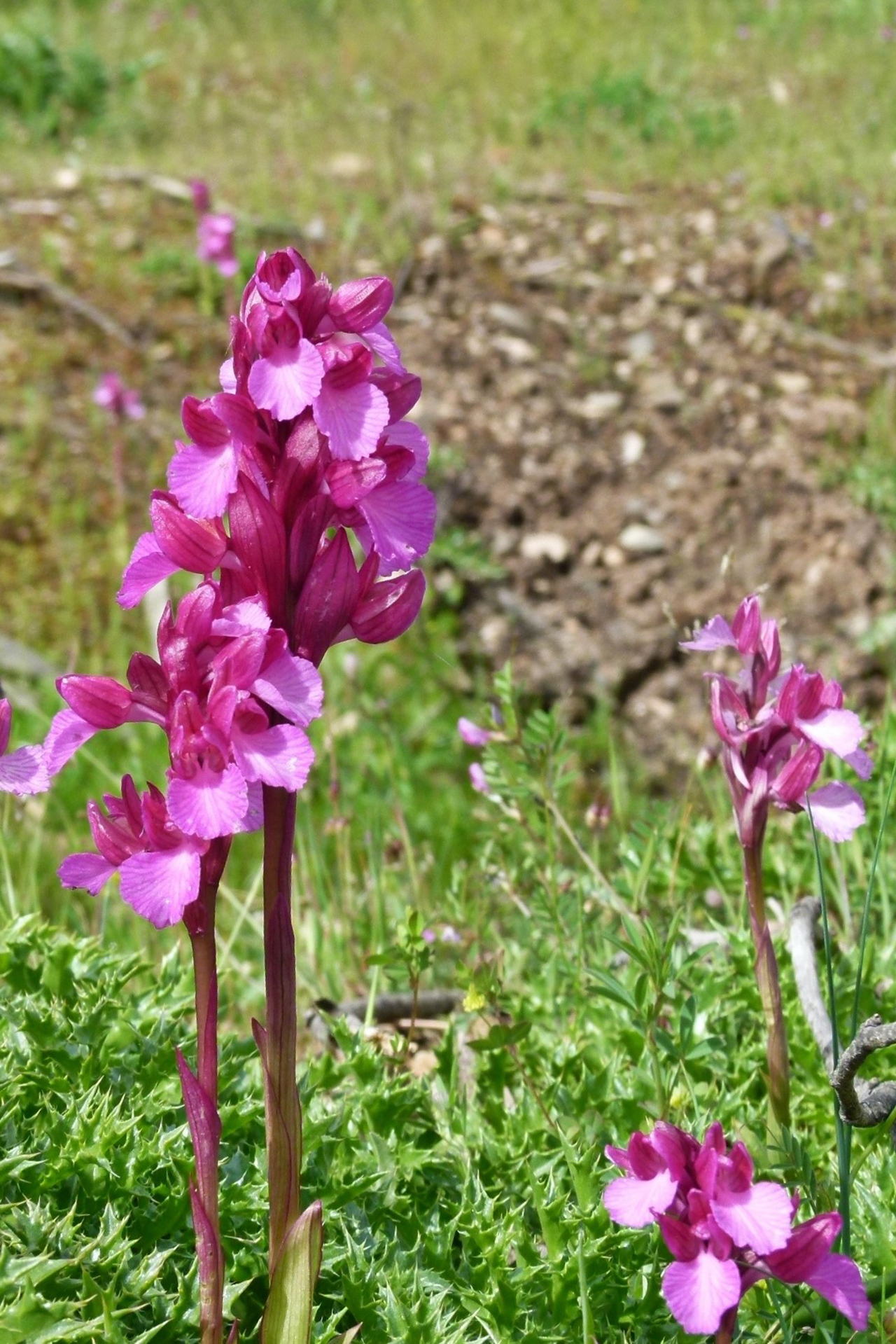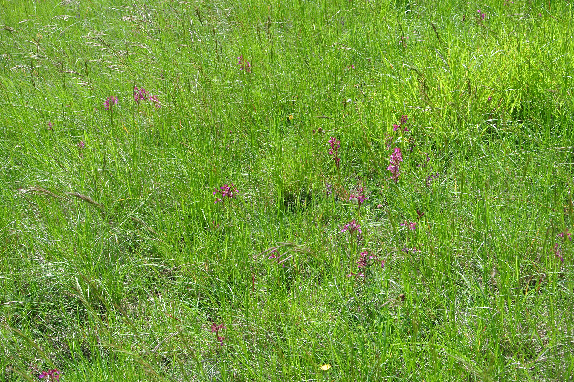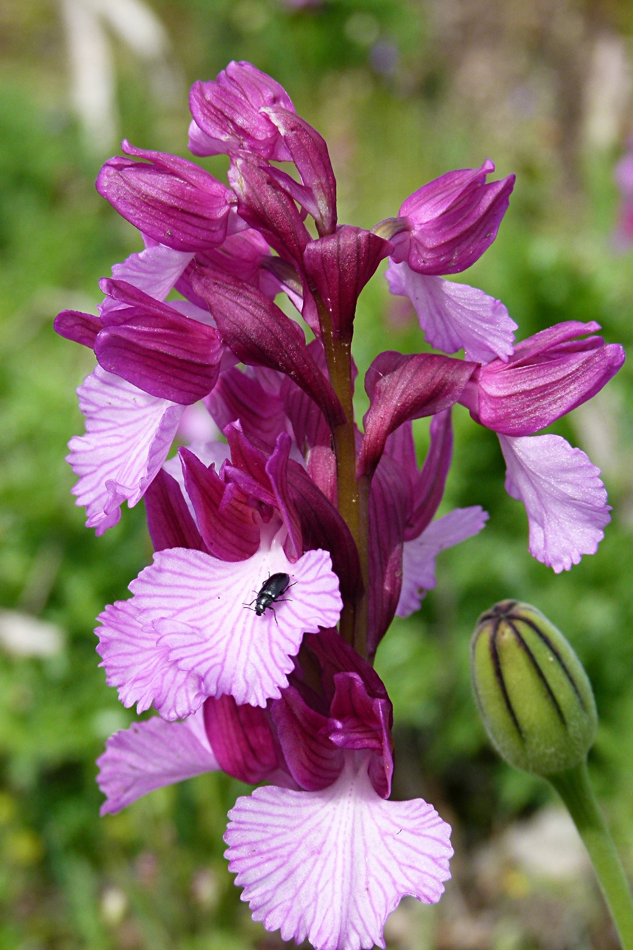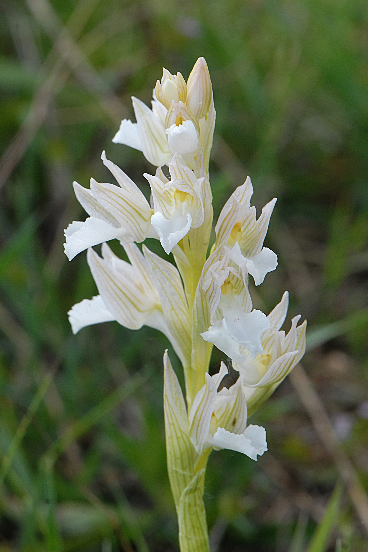 Descrizione del tipo (var. papilionacea): pianta alta 15-30(40) cm; scapo cilindrico, angoloso, in alto sfumato di rosso; fino a 9 foglie basali lineari-lanceolate 3-18 × 0,5-2 cm), distese o suberette, carenate, acute, le basali di color verde-glauco, le cauline più piccole e sfumate di rosso, lungamente guainanti il fusto, di grandezza decrescente verso l’alto, fino a diventare bratteiformi; brattee porporine, con evidenti nervature brunastre, ovato-lanceolate, acute o subottuse. Infiorescenza con 6-10(20) fiori medio-grandi, prima ovoide e densa, in seguito cilindrica e lassa. Tepali conniventi tra loro a formare un casco (molto) lasso; sepali ovato-lanceolati subacuti (8-22 × 4-7,5 mm), i laterali asimmetrici e volti in avanti, i petali più stretti e corti; labello a forma di ventaglio (ristretto alla base e allargato nella parte apicale, 8,5-24 × 7-25 mm), con margini spesso rialzati, crenulati e ondulati (per i colori di casco e labello vedi Osservazioni); ginostemio porporino, molto corto; sperone conico, leggermente arcuato verso il basso, lungo 8-14 mm, poco meno dell’ovario sessile e verde con sfumature violacee. Numero cromosomico: 2n = 32.