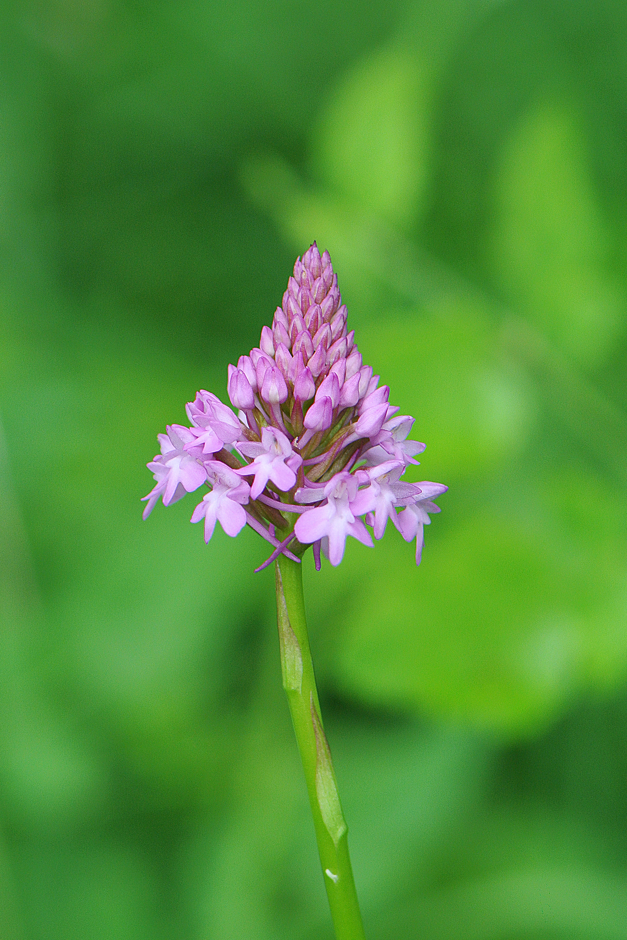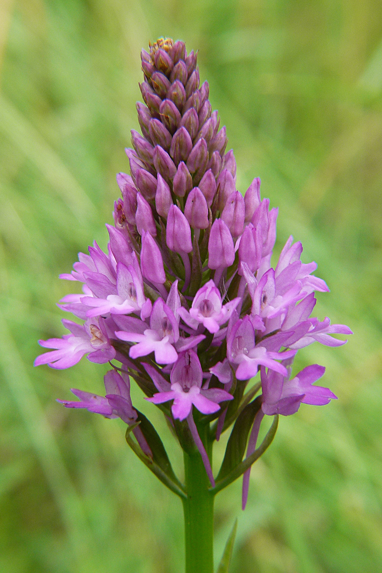 Pianta slanciata, alta fino a 60 cm, con scapo flessuoso e verde come le foglie strettamente lanceolate, arcuate, suberette, le basali 8-25 × 0,7-2 cm, le cauline più corte, in alto bratteiformi; brattee con sfumature rossastre più o meno marcate, lanceolate, acute, lunghe come o poco più dell’ovario.