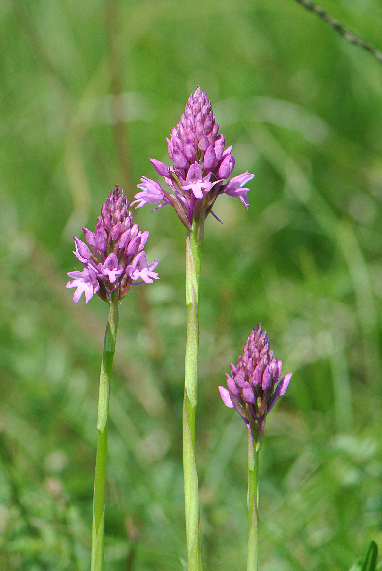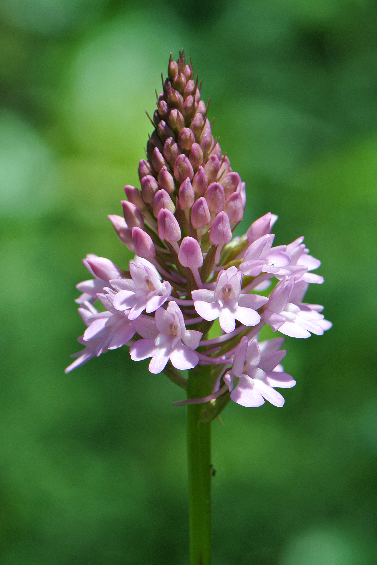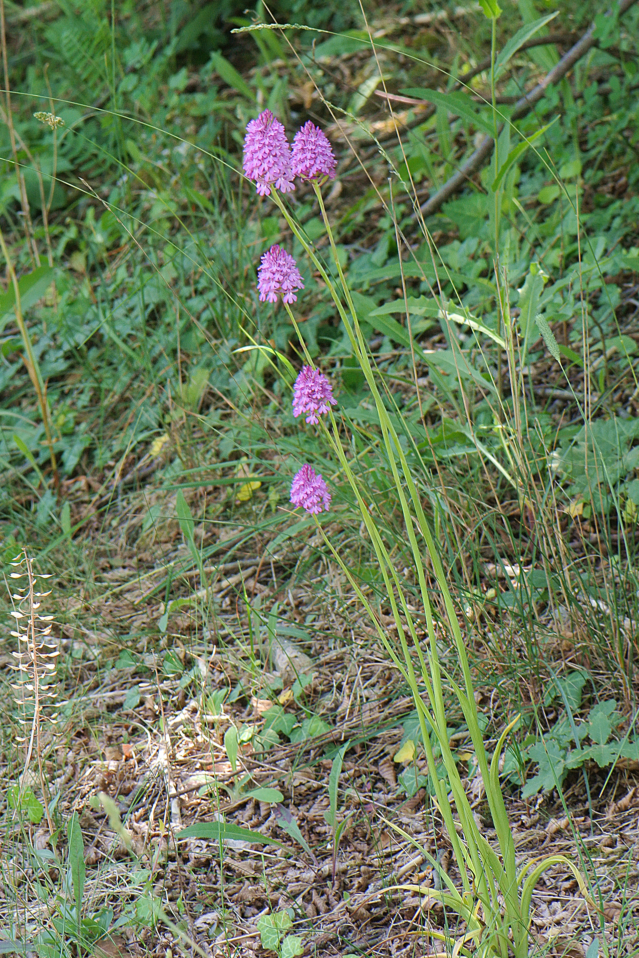 Tepali ovato-lanceolati, acuti e in genere rosati, il sepalo dorsale connivente con i petali a formare un casco lasso (lungo 3,5-6 mm), i sepali laterali distesi, diretti leggermente in avanti, lunghi 4-8 mm. Labello trilobato (raramente subintero) lungo 6-9 mm, con lobi subeguali, il mediano un po’ più stretto; base provvista di due lamelle longitudinali subparallele o leggermente divaricate; sperone filiforme lungo 10-15 mm, lievemente arcuato verso il basso; ginostemio corto, ottuso, con pollinii verdastri e con un unico retinacolo; ovario sessile.