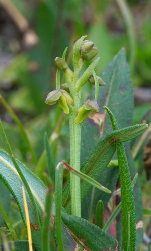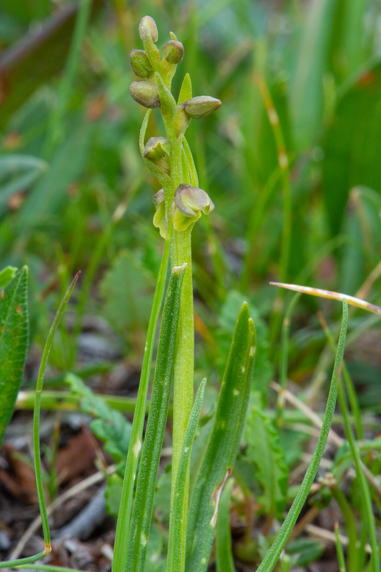 Apparato radicale costituito da 2 rizotuberi, da ovoidi allungati a ellissoidali; piante molto piccole, alte appena 4-7(12) cm, interamente verdi, scapo eretto, glabro e angoloso; rosetta di 5-11 foglie strettamente lineari, glabre e canalicolate, erette, con apici lievemente cucullati che possono anche superare la sommità dell’infiorescenza; brattee lesiniformi, ben più lunghe dei fiori. Infiorescenza densa, breve (lunga non più di 4 cm), con 5-12(15) fiori piccolissimi, verdi-giallognoli con sfumature bruno-violacee nelle parti esterne. Sepali ovati lunghi appena 3-4 mm, conniventi a formare un caschetto chiuso con i petali, lineari e ancora più corti (2-3 mm). Labello da subintero a subtrilobo (appena 3-4,5 × 3 mm), verdastro o giallastro più o meno sfumato di bruno, con 2 callosità basali che formano una fossetta nettarifera che si prolunga in un piccolo solco verso il centro del labello; sperone assente; ginostemio breve, con 2 retinacoli contigui e borsicola rudimentale; ovario subsessile; capsula eretta, piriforme (più grossa in alto). Numero cromosomico: 2n = 42.