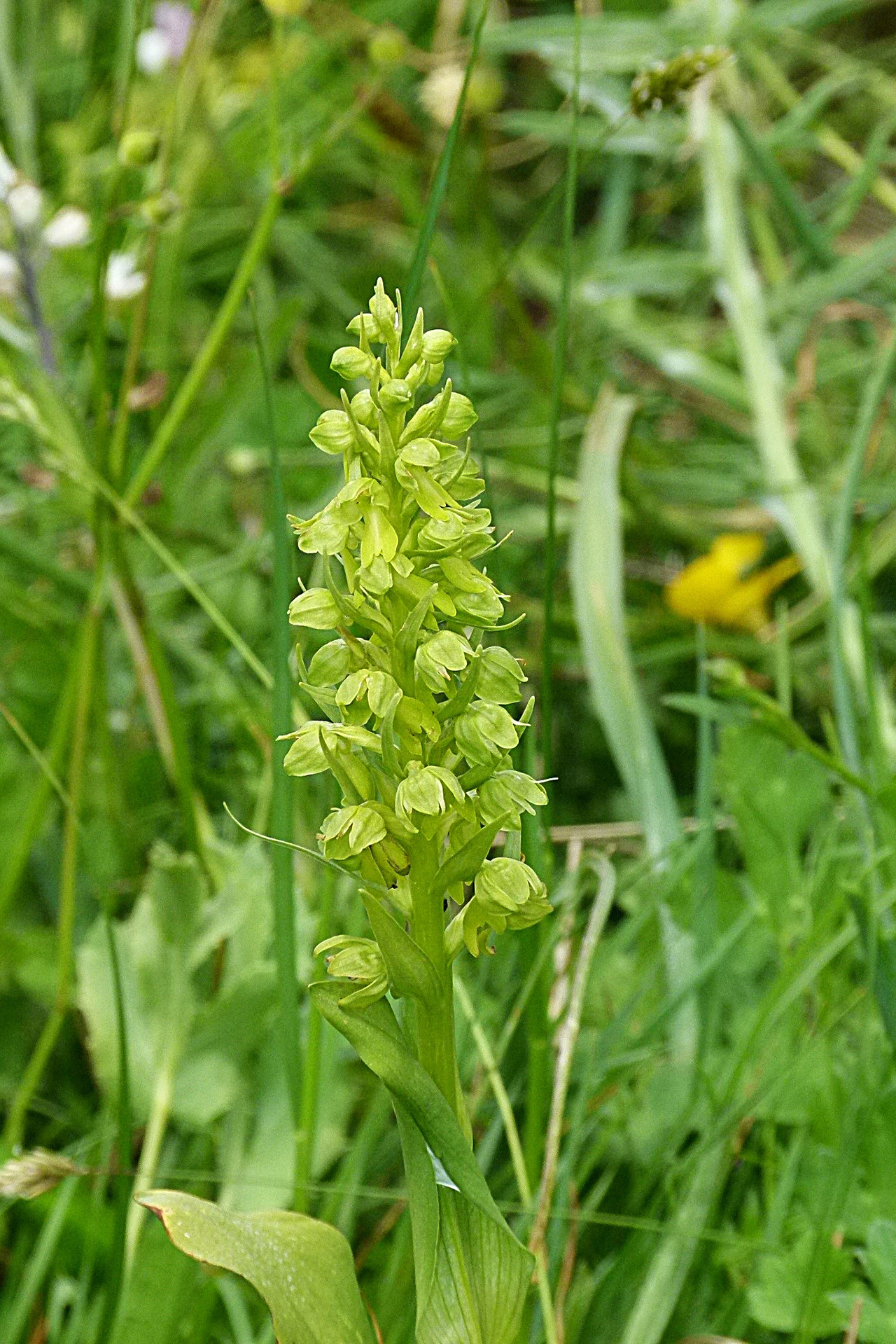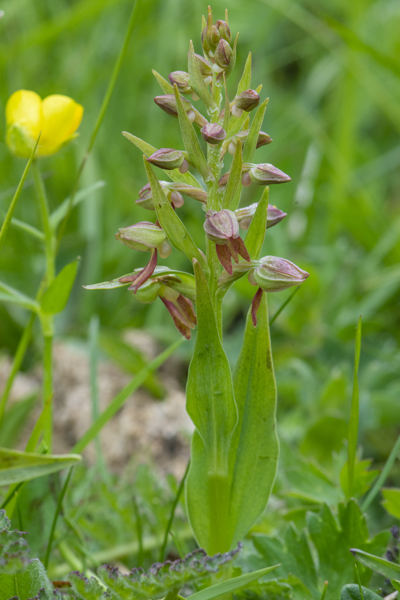 Apparato radicale composto da 2 rizotuberi palmati; pianta piuttosto robusta ma non molto alta (in condizioni favorevoli raramente supera i 25-30 cm di altezza); scapo verde, eretto, in alto angoloso-scanalato; foglie verdi non maculate, 2-3 alla base, ovato-ellittiche e ottuse (2-10 × 1-5 cm), altre lungo lo scapo, lanceolate, acute e in parte guainanti; brattee lanceolate e acute, le inferiori più lunghe dei fiori. Infiorescenza sublassa, cilindrica, alta fino a 10 cm, con 5-25 fiori piccoli, da verdi a giallastri fino a bruno-rossastri. Sepali ovato-lanceolati (3,5-6,5 × 2-3 mm), a volte con bordo porporino, i laterali asimmetrici, conniventi in avanti con i petali lineari, appena più piccoli, a formare un caschetto ottuso di solito semiaperto. Labello piano a forma di lingua, pendulo o leggermente rivolto all’indietro (5-10 × 2-3 mm), incavato alla base con 2 fossette nettarifere, trifido all’estremità per un piccolo lobo mediano dentiforme nettamente più corto dei lobi laterali triangolari e acuti; sperone nettarifero molto corto, subgloboso (lungo quanto largo, 2-3 mm). Ginostemio corto, pollinii divergenti in basso, borsicola rudimentale; ovario sessile, capsule erette. Numero cromosomico: 2n = 40.