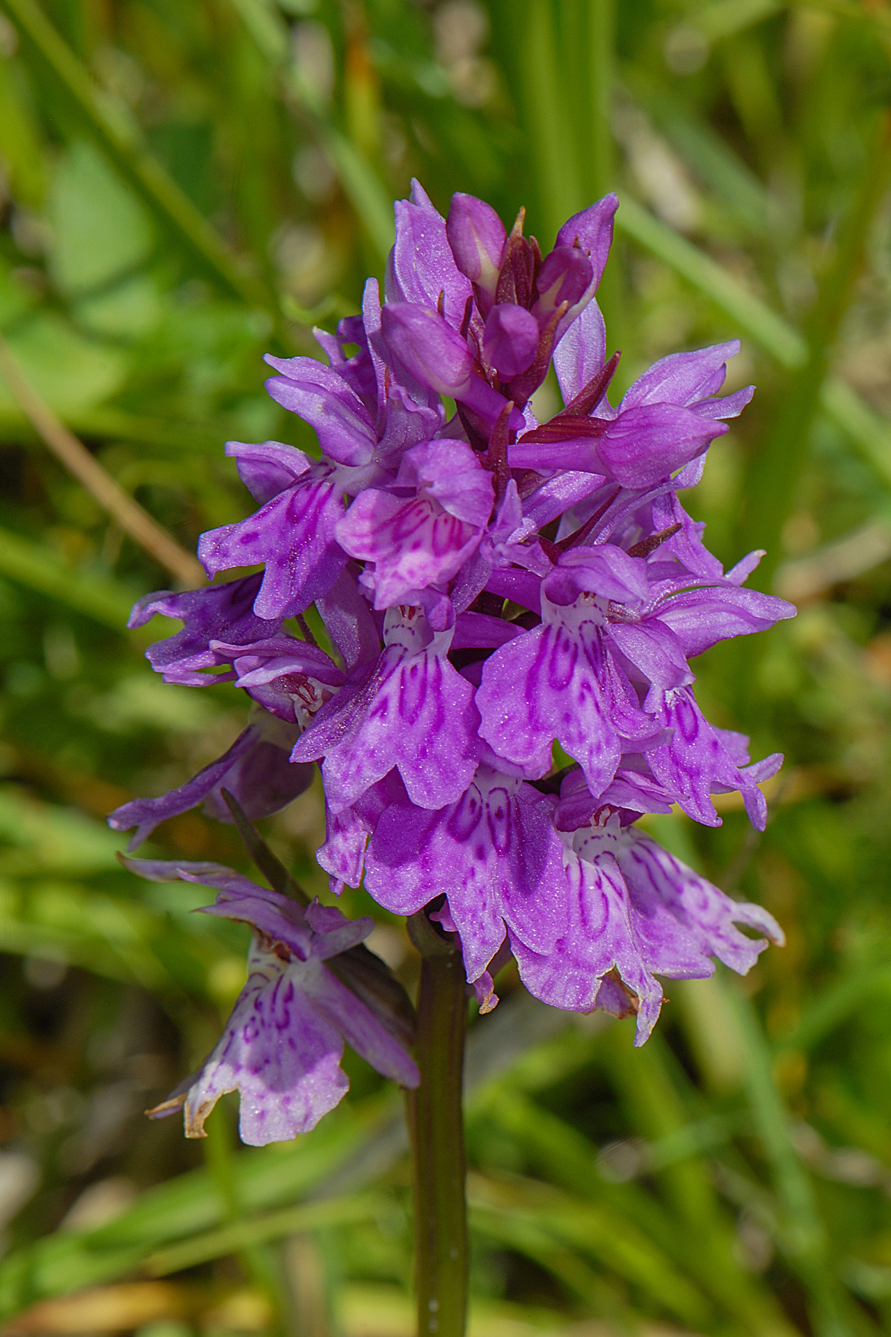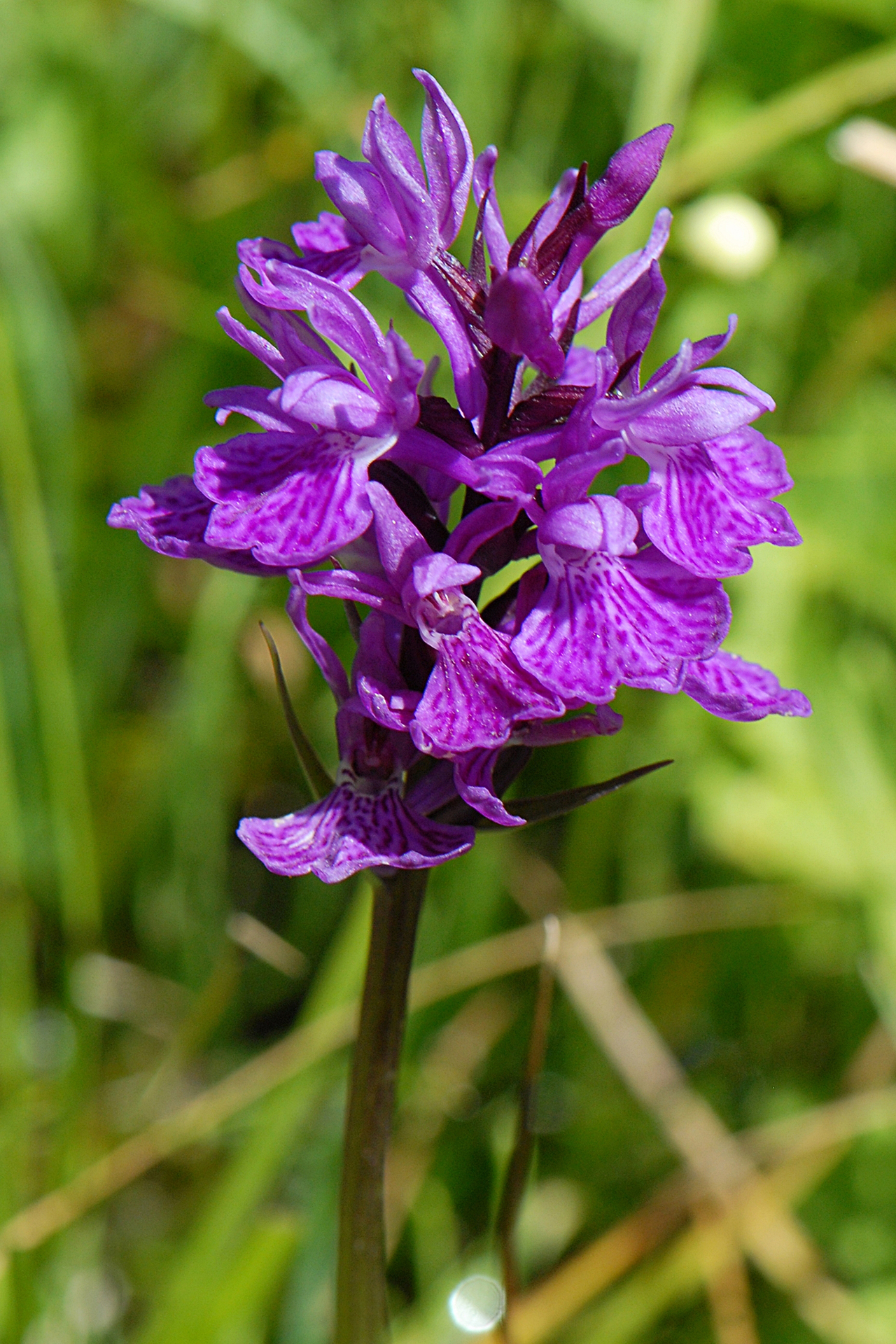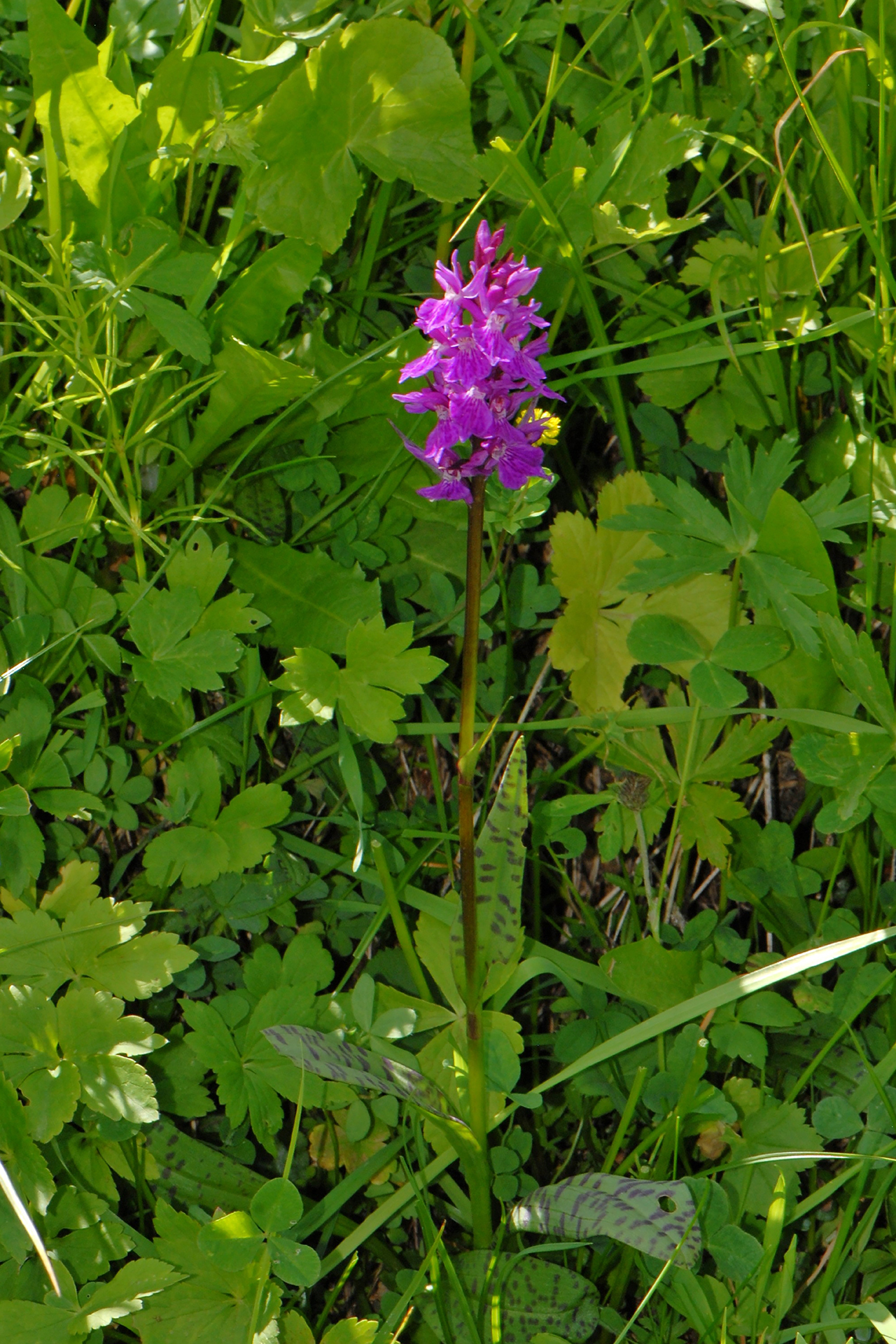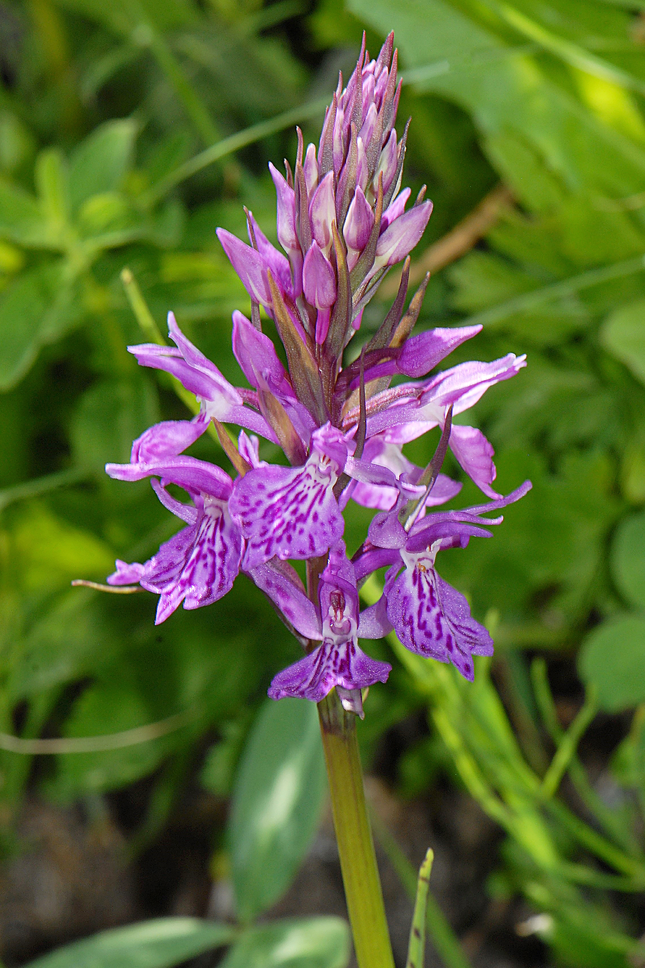 Pianta alta fino a 50 cm, con scapo pieno; 3-5 foglie lunghe fino a 15 cm, gradualmente decrescenti, lineari-lanceolate, debolmente carenate, maculate sulla pagina superiore, le superiori più piccole fino a bratteiformi; brattee lanceolate, di solito più corte dei fiori, talvolta appena più lunghe.