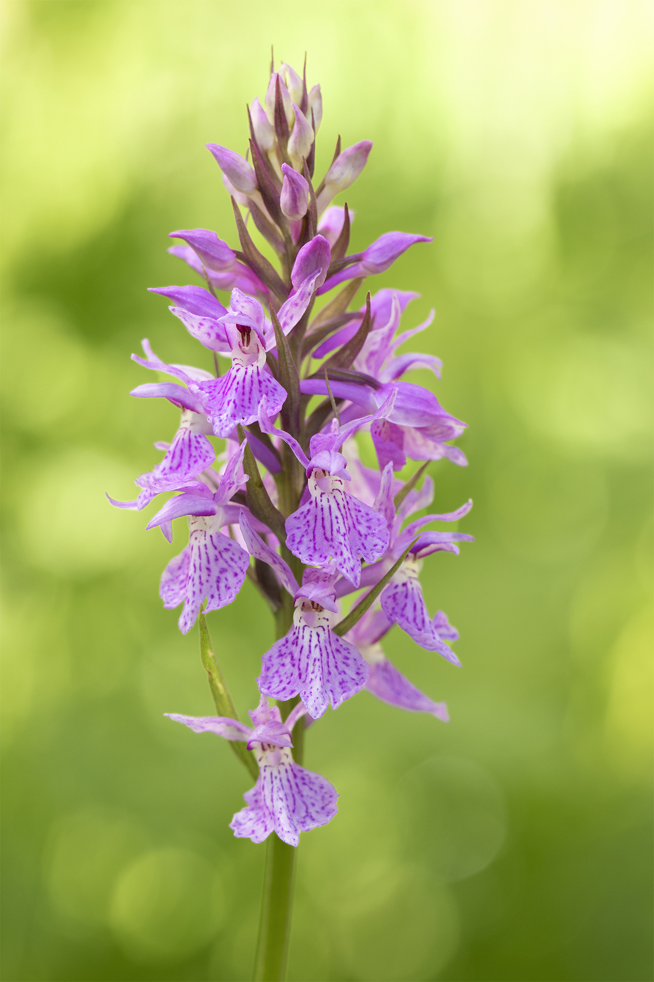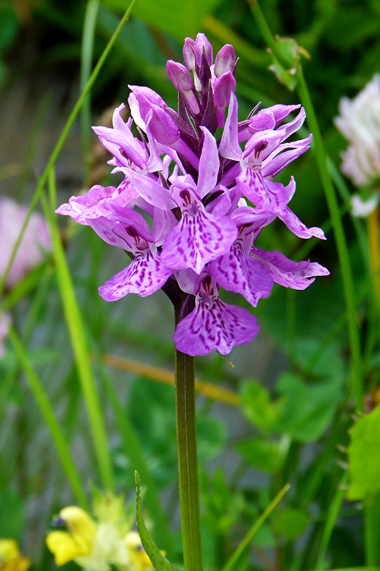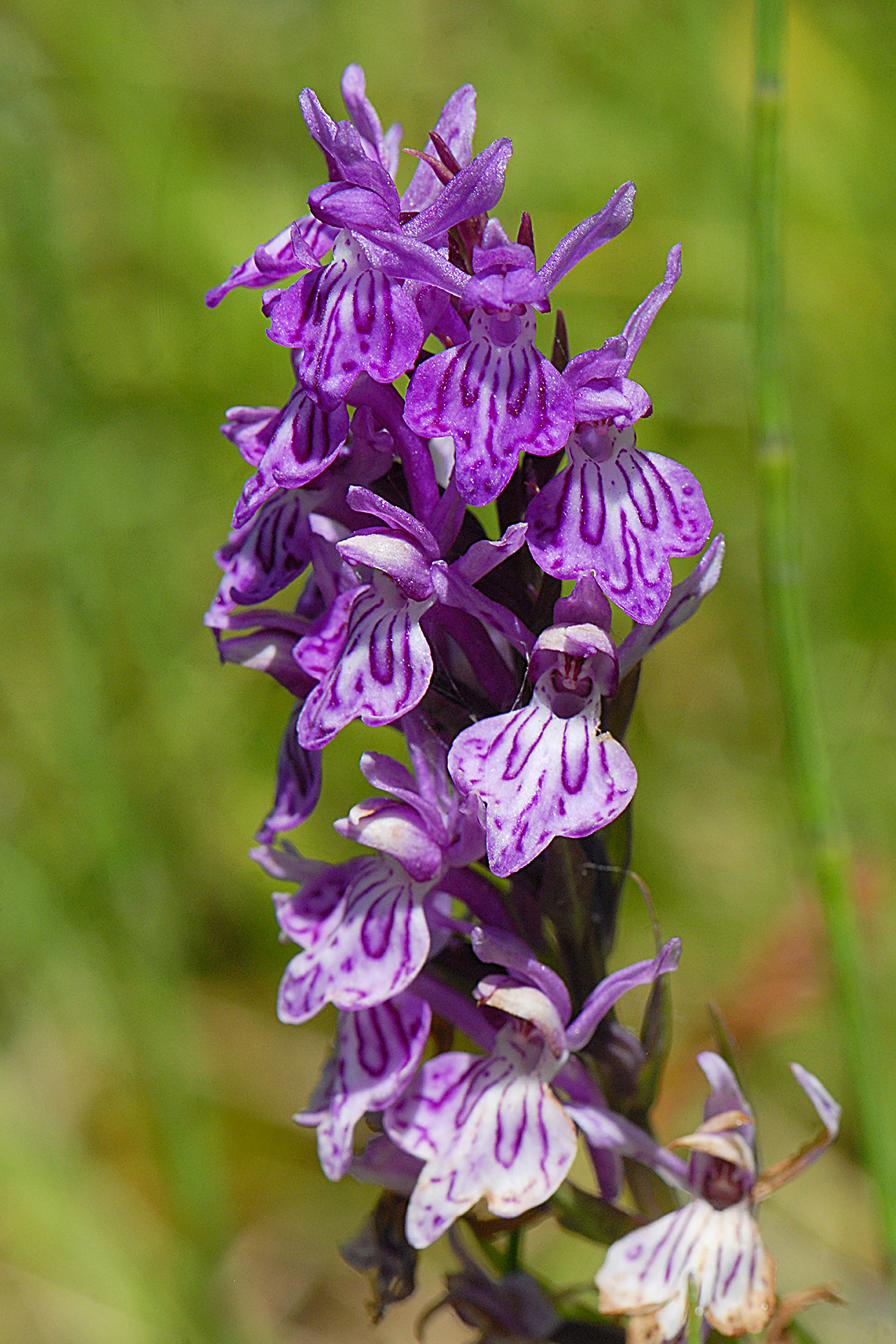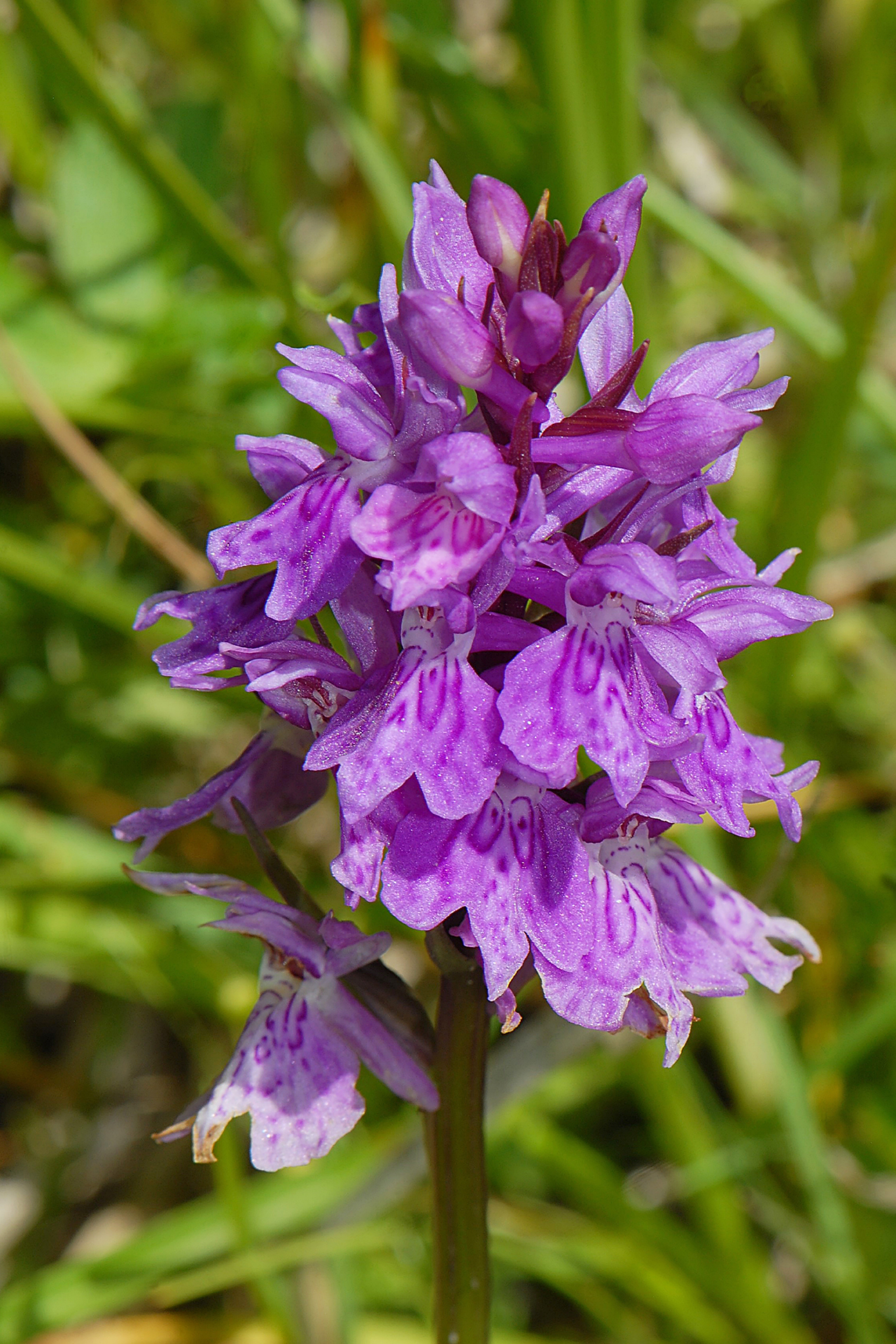 Pianta alta fino a 50 cm, con scapo pieno; 3-5 foglie lunghe fino a 15 cm, gradualmente decrescenti, lineari-lanceolate, debolmente carenate, maculate sulla pagina superiore, le superiori più piccole fino a bratteiformi; brattee lanceolate, di solito più corte dei fiori, talvolta appena più lunghe.