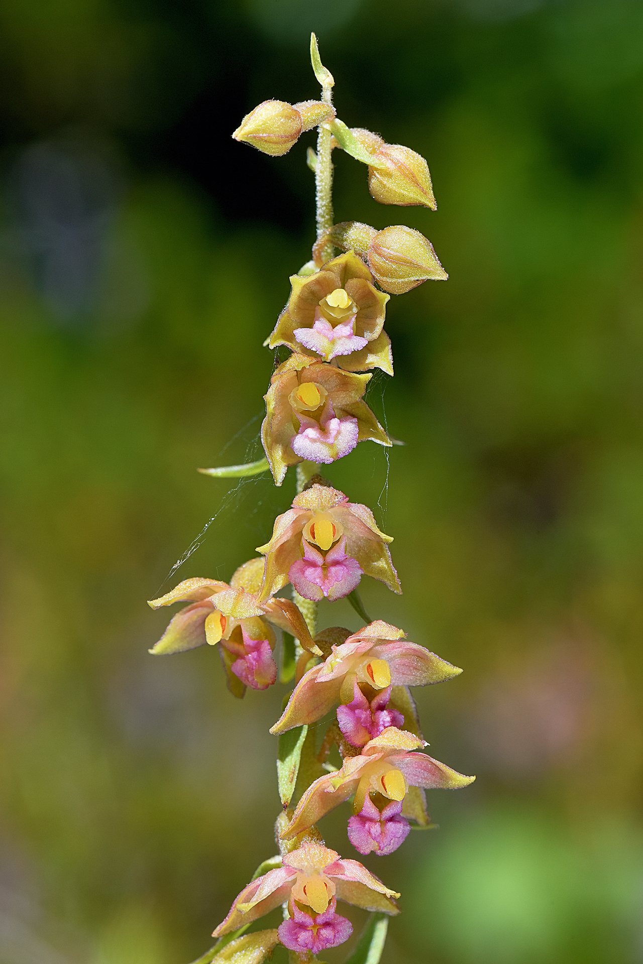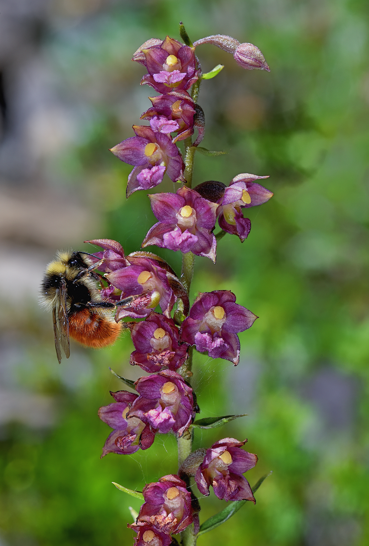 Pianta raramente cespitosa, alta 20-60(80) cm, con scapo robusto, eretto, verde-grigiastro con sfumature rossastre, con base glabra e violacea, in alto con fitta peluria grigiastra; 5-11 foglie da ovate a ovato-lanceolate, acute, in genere distiche, orizzontali o leggermente ascendenti, a margine ondulato, le inferiori spesso con sfumature porporine, 4-12 × 1-5 cm); brattee inferiori più lunghe del fiore. Infiorescenza sublassa e subunilaterale, con 7-50(60) fiori allogami di taglia media, suborizzontali, rosso-porporini o violacei, talora a colori più tenui, campanulati, odorosi di vaniglia. Tepali ovati (5-10 × 2,5-4,5 mm), acuti, carenati, roseo-porporini, esternamente pubescenti. Labello con giunzione ipo-epichilo a V stretta; ipochilo cupoliforme, lungo 4-6 mm, nettarifero, rosso-brunastro; epichilo cordiforme (2,5-4 × 4-5 mm), rosso violaceo, a margine sfrangiato, con callosità basali di forma cordata e vistosamente rilevate e increspate; colonna corta e tozza; antera sessile; clinandrio sviluppato; viscidio efficace; pollinii compatti; stigma quadrangolare; ovario pubescente, grigio-rossastro; pedicello arcuato, dello stesso colore dell’ovario. Impollinata soprattutto da bombi.