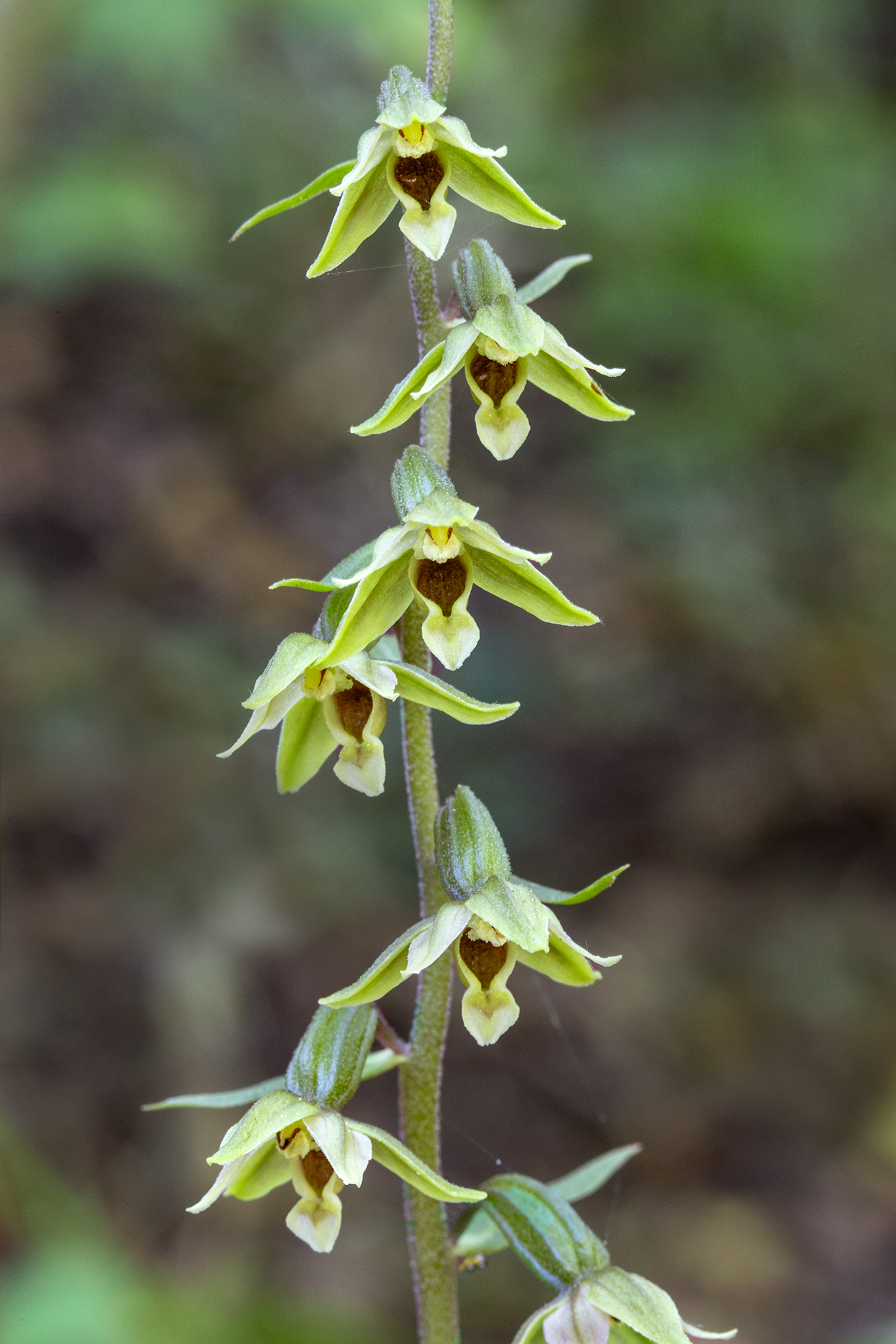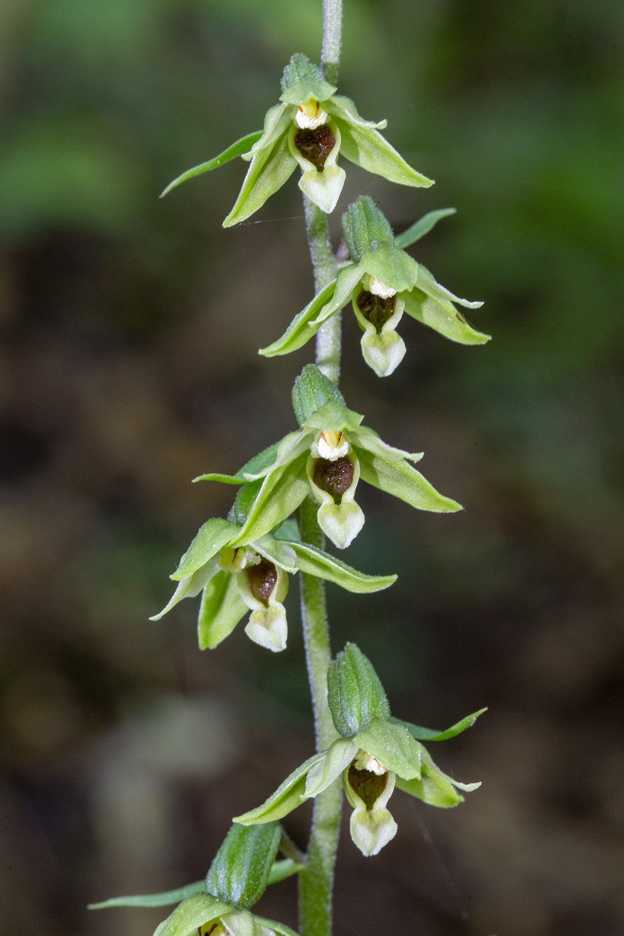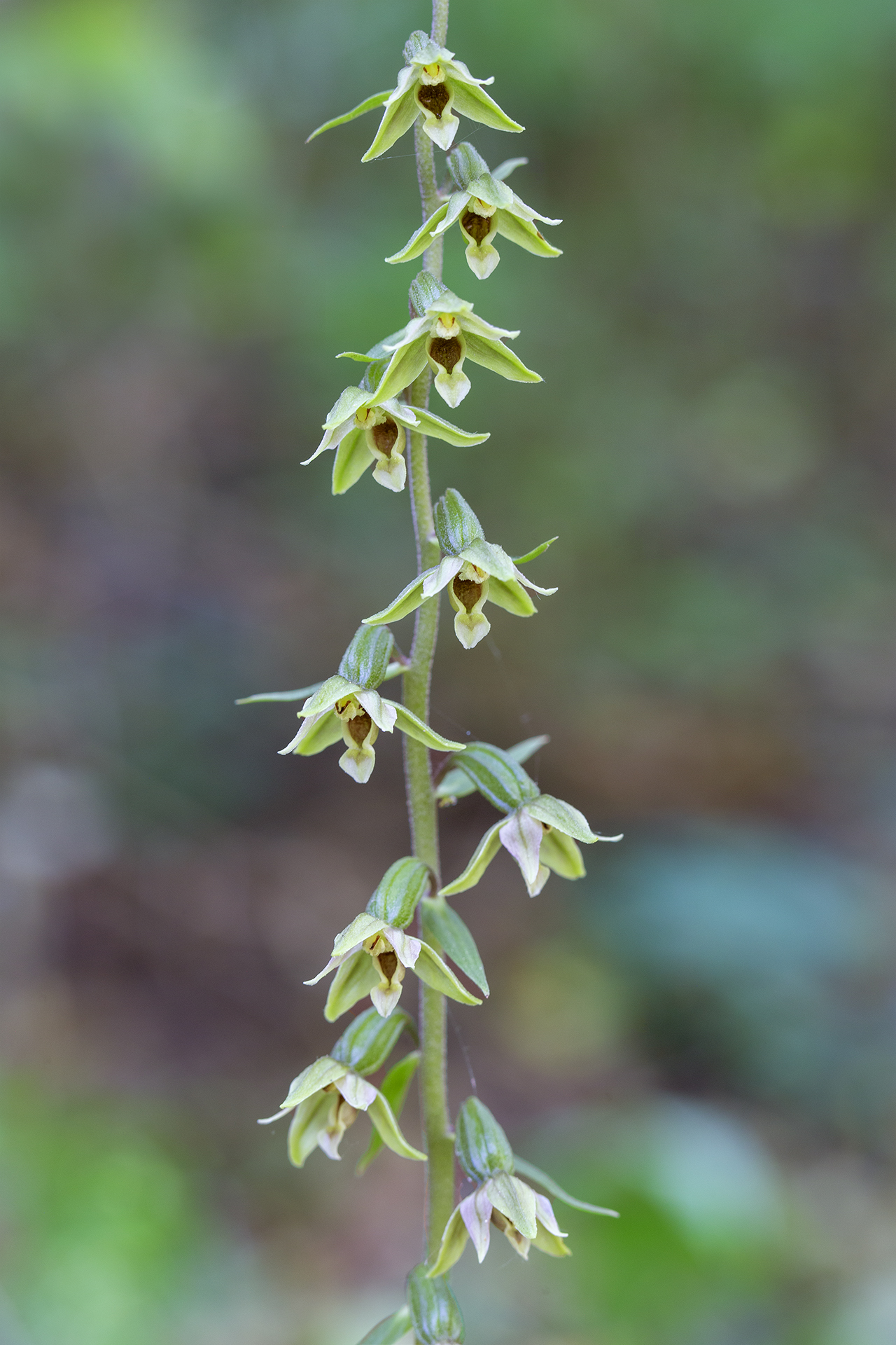 Infiorescenza lassa, tendenzialmente unilaterale, portante 2-30 fiori autogami, prima suborizzontali poi penduli, sempre bene aperti. Tepali ovato-lanceolati, sepali 9 × 4,5 mm, verdi con sfumature più chiare, petali 8 × 4,2 mm, biancastri, raramente rosei. Labello con giunzione ipo-epichilo larga; ipochilo a coppa (4 × 4 mm), nettarifero, esternamente bianco-verdastro, brunastro sul fondo; epichilo cordato o triangolare (3,4 × 3,4 mm), da bianco a verdastro, raramente sfumato di rosa; callosità basali poco pronunciate, verdi, di rado sfumate di rosa; colonna robusta, verde-biancastra; antera tozza brevemente peduncolata; clinandrio sviluppato; staminodi poco sviluppati; viscidio rudimentale e mai funzionante; pollinii incoerenti; stigma verdastro, incavato, a estremità laterali arrotondate; ovario verde, affusolato; pedicello arrossato lungo 4-6 mm. Fioritura estivo-autunnale.