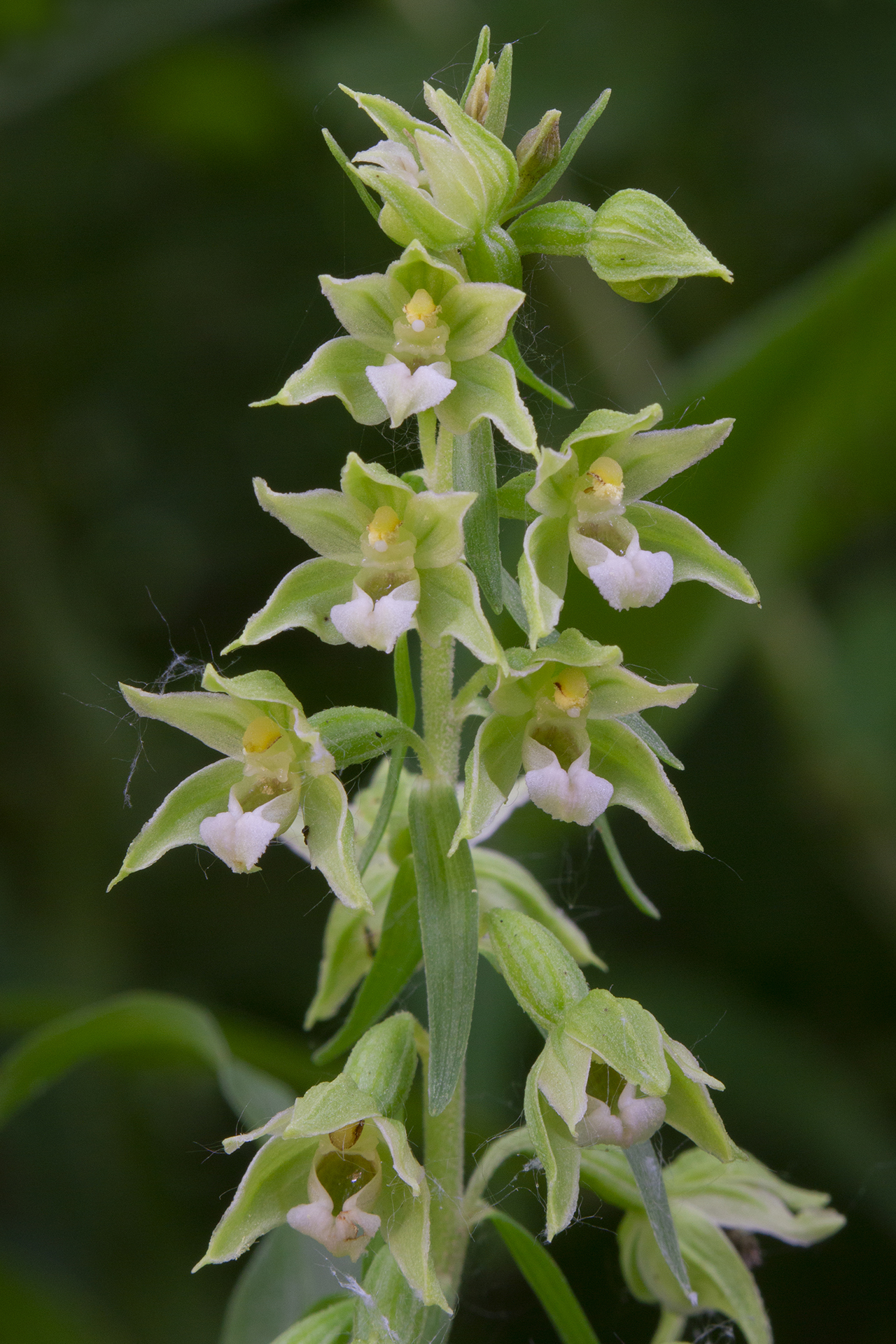 Sepali verdi all’esterno, verde-giallastri all’interno; petali più chiari, talvolta a leggerissime sfumature rosee. Labello con giunzione ipo-epichilo stretta e corta; ipochilo nettarifero, poco profondo e piuttosto allungato, verde-biancastro all’esterno, bruno più o meno scuro sul fondo; epichilo triangolare o cordato 3,5-5 × 3,5-5 mm), spesso ad apice ripiegato all’indietro, bianco-verdastro sfumato di rosa, con callosità roseo-violacee non molto sviluppate; colonna tozza; antera più o meno peduncolata, clinandrio sviluppato e incavato, staminodi spessi, viscidio presente ma efficace solo a inizio antesi; pollinii granulosi e sfarinantesi sullo stimma incavato, in basso arrotondato e sporgente; ovario affusolato e leggermente pubescente; pedicello allungato verde chiaro, con base a sfumature bronzee.