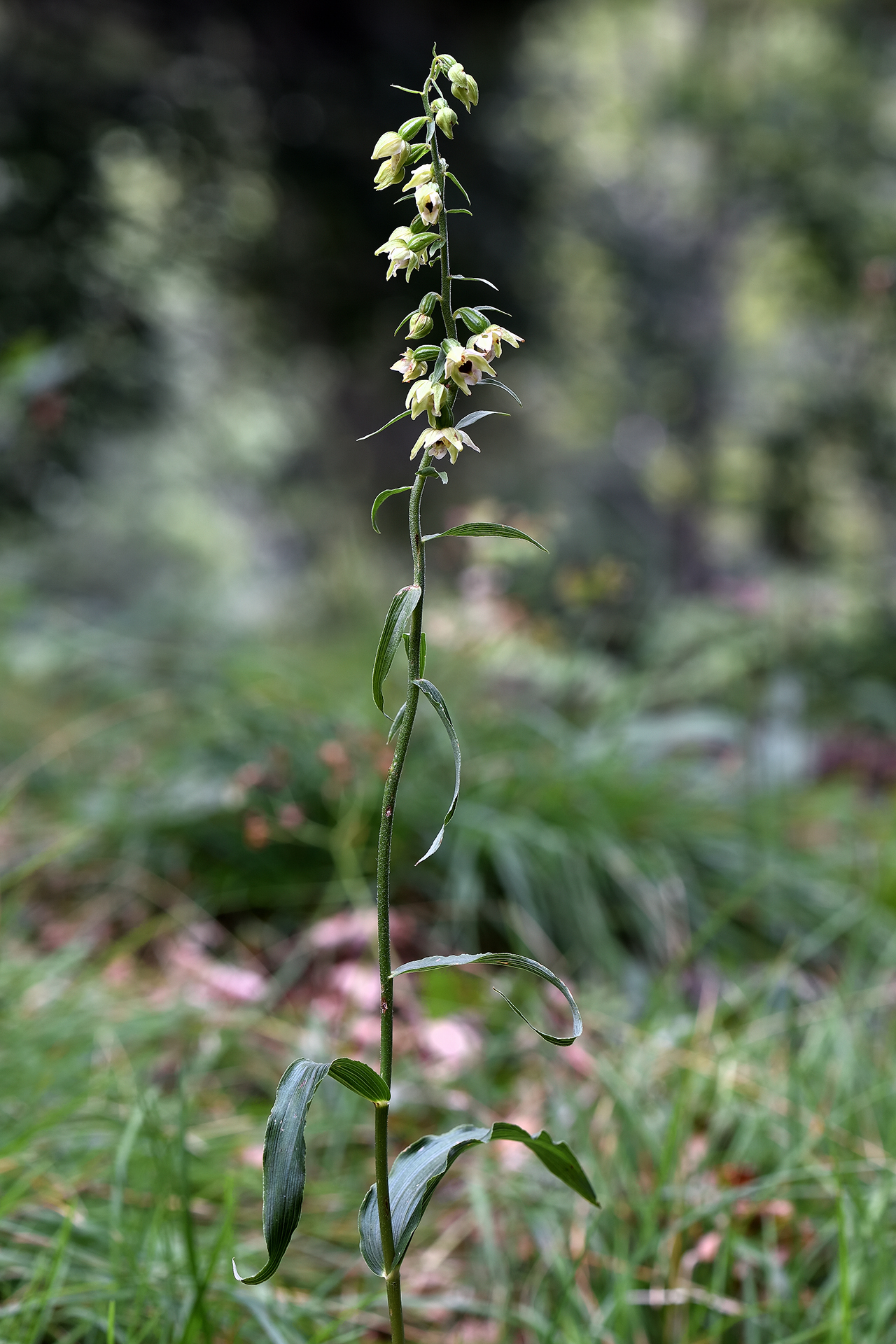 Pianta in genere singola o in coppia, alta fino a 60(70) cm, con scapo gracile e flessuoso, in basso quasi glabro e verde-giallo-violaceo, verde-grigiastro e pubescente in alto; 5-10 foglie a margini ondulati, di colore verde carico o anche verde-giallastro, le mediane ovato-lanceolate o lanceolate (5-10 × 2-4 cm), le altre lanceolate, le superiori bratteiformi, spesso distiche e carenate, obliquamente ascendenti e di solito arcuate, più lunghe degli internodi; brattea inferiore più lunga dei fiori (fino 4,5 cm), quelle superiori decrescenti. Infiorescenza sublassa, subunilaterale, con 4-40 fiori autogami di media grandezza, verde-giallo-biancastri, penduli e spesso campanulati e di solito non molto aperti. Tepali ovato-lanceolati, i sepali 7-12 × 3,5-5 mm, verdastri e leggermente carenati, i petali subuguali, ovati e acuminati, biancastri, raramente sfumati di rosa. Labello con giunzione ipo-epichilo larga o molto larga; ipochilo cupoliforme nettarifero, bianco-roseo all’esterno, bruno-rossastro e lucente all’interno; epichilo cordato o triangolare, di solito lungo quanto largo (4-5 × 2,5-4 mm), talvolta a margini fortemente rialzati, biancastro o più spesso verde-biancastro o anche parzialmente roseo (di rado totalmente roseo o bianco), ad apice ottuso non o poco ribattuto all’indietro, munito di callosità basali poco marcate e spesso rosate; colonna biancastra; antera brevemente peduncolata; clinandrio molto ridotto o assente; staminodi ben sviluppati; viscidio assente o rudimentale; pollinii penduli sullo stigma quadrangolare; ovario affusolato, quasi glabro; pedicello verde-giallognolo. Numero cromosomico: 2n = 38, 40.