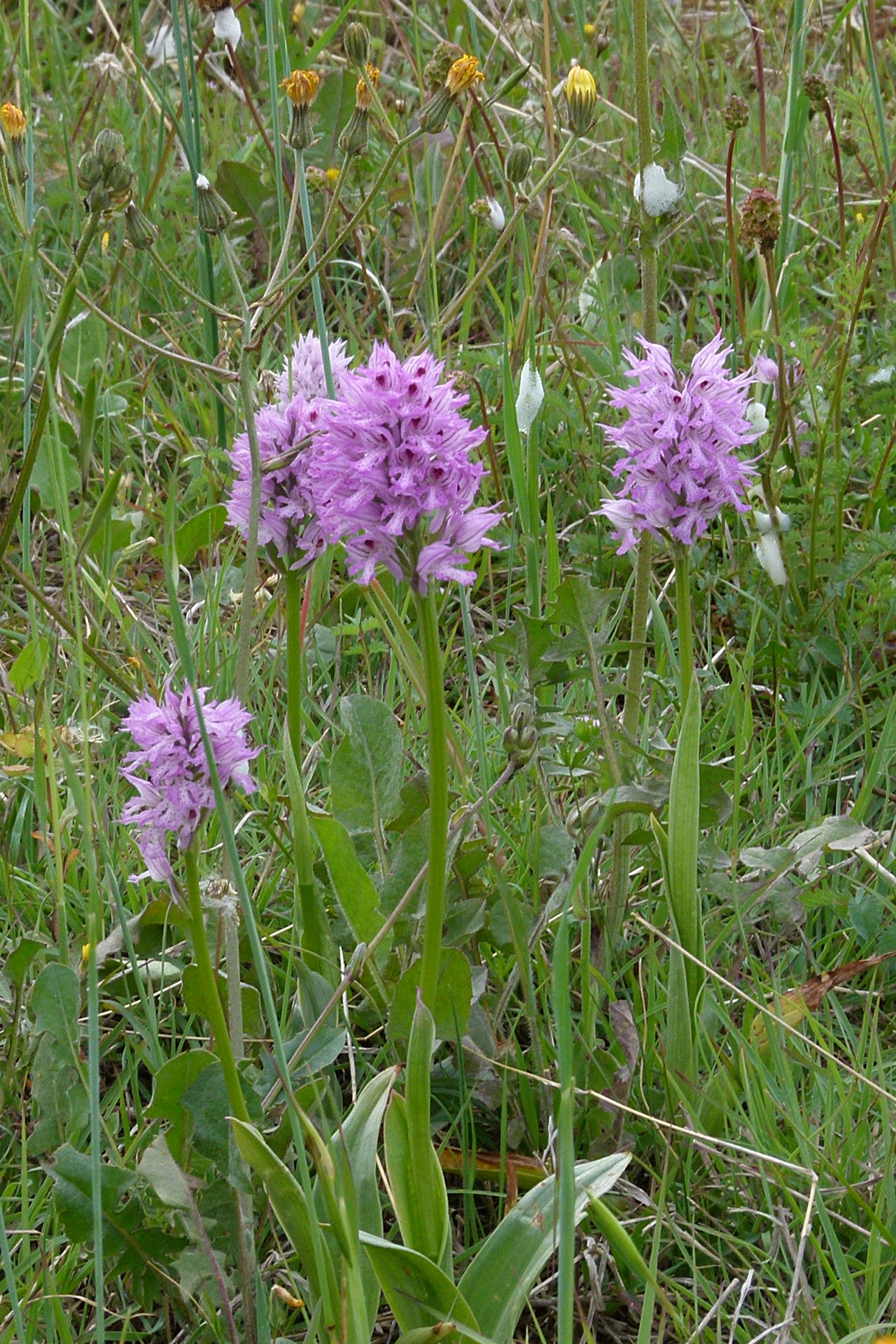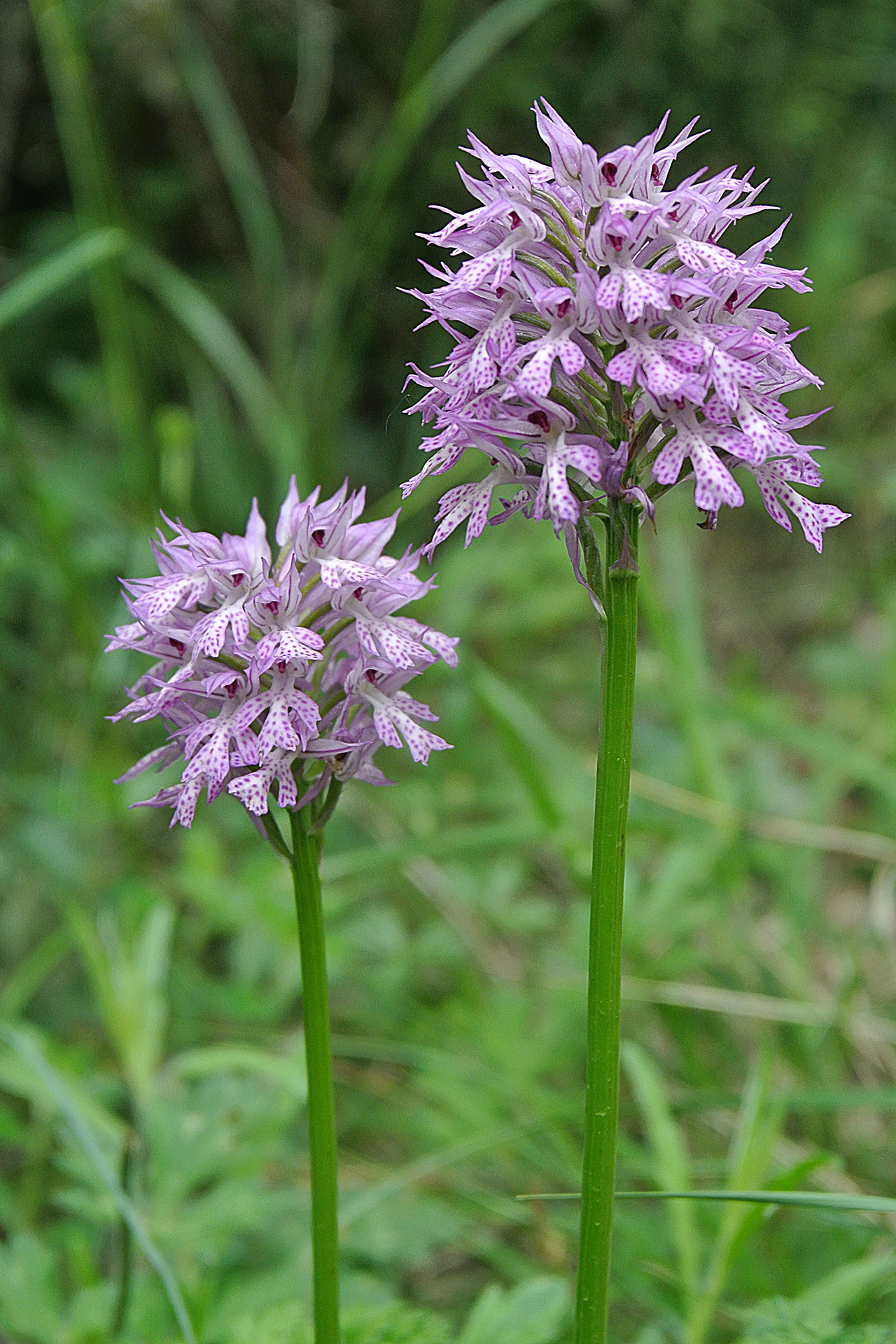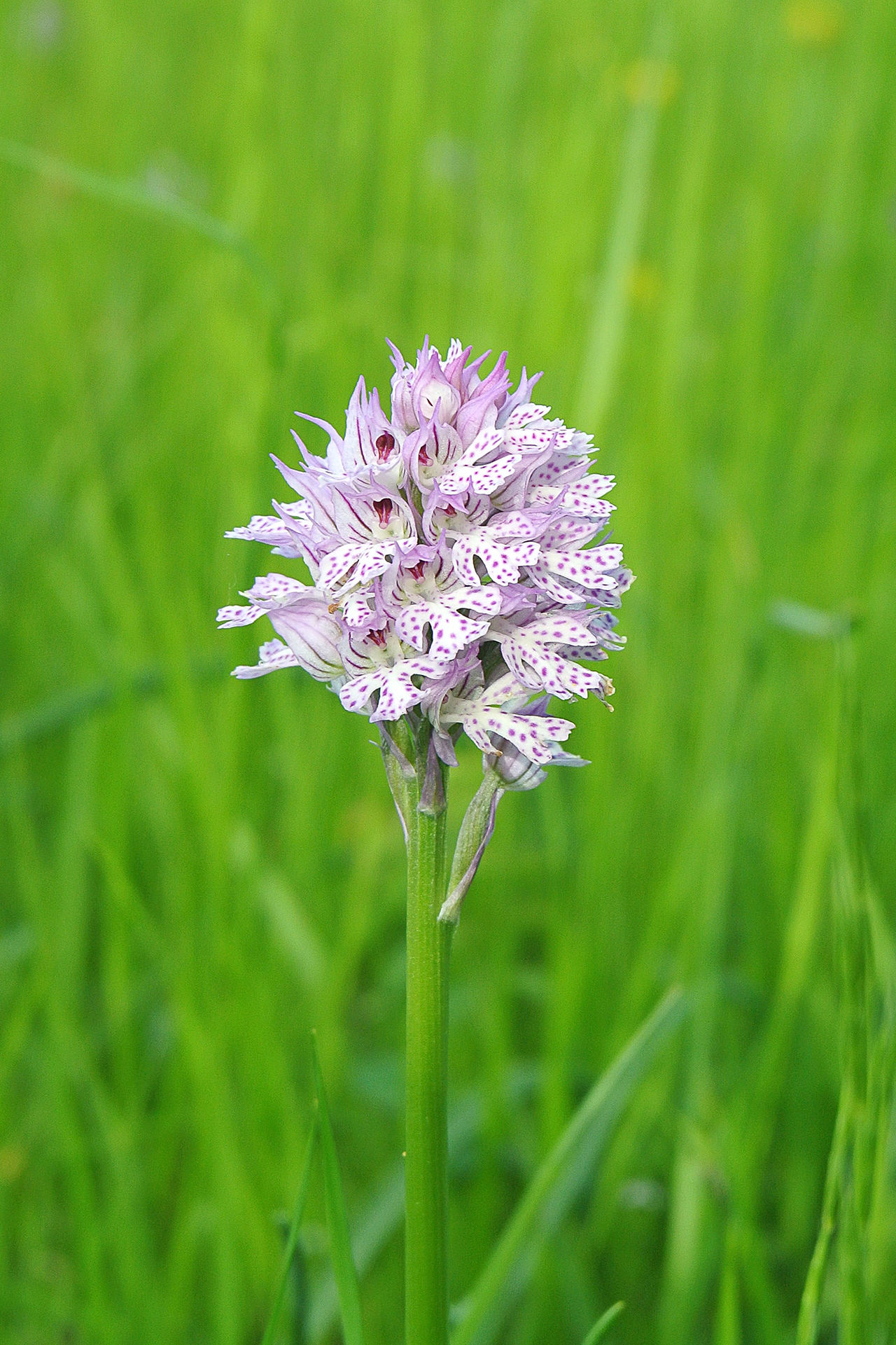Infiorescenza densa, da subovoide fino a globosa, multiflora; fiori piuttosto piccoli, bianco-rosati, lievemente profumati. Sepali ovato-lanceolati, conniventi con i petali strettamente lanceolati a formare un casco chiuso di colore roseo-violaceo con striature porporine, che appare a 3 punte per la forma acuminata degli apici dei sepali, separati tra loro. Labello da bianco a roseo con macchie irregolari roseo-porporine, nettamente trilobo, con lobo mediano allargato e spesso appena bilobato (a volte subintero o denticolato); lobi laterali più corti, piuttosto stretti e divaricati; sperone lungo come l’ovario o poco più corto (5-10 mm), cilindrico, incurvato in basso; ginostemio molto corto e ottuso, stigma subcordiforme, antera violetto-porporina con logge parallele, separate da una piccola piega rostellare (riproduzione allogama); masse polliniche verdastre; ovario sessile verde pallido; capsula ovoide allungata. Entità diploide (numero cromosomico: 2n = 42).