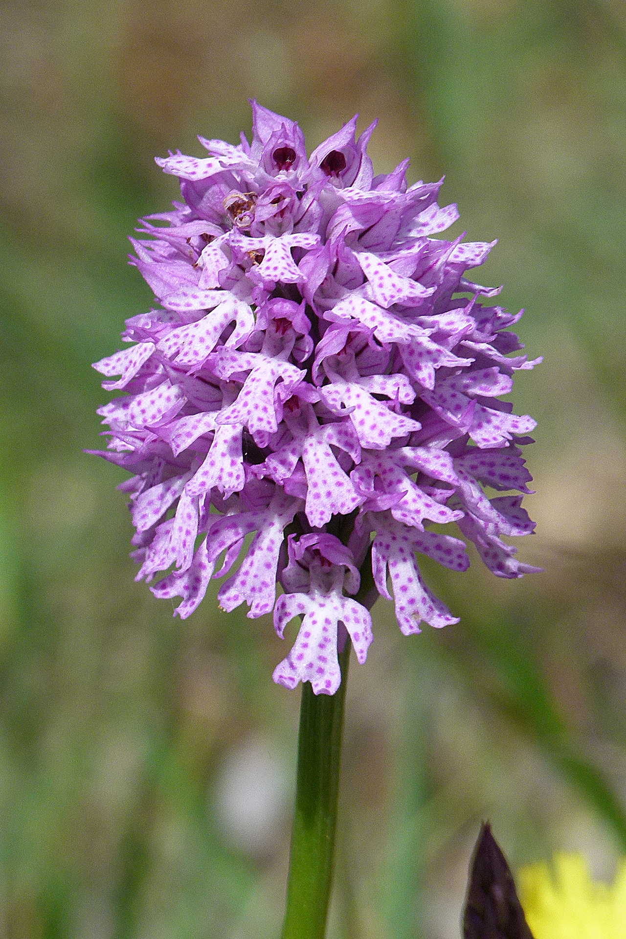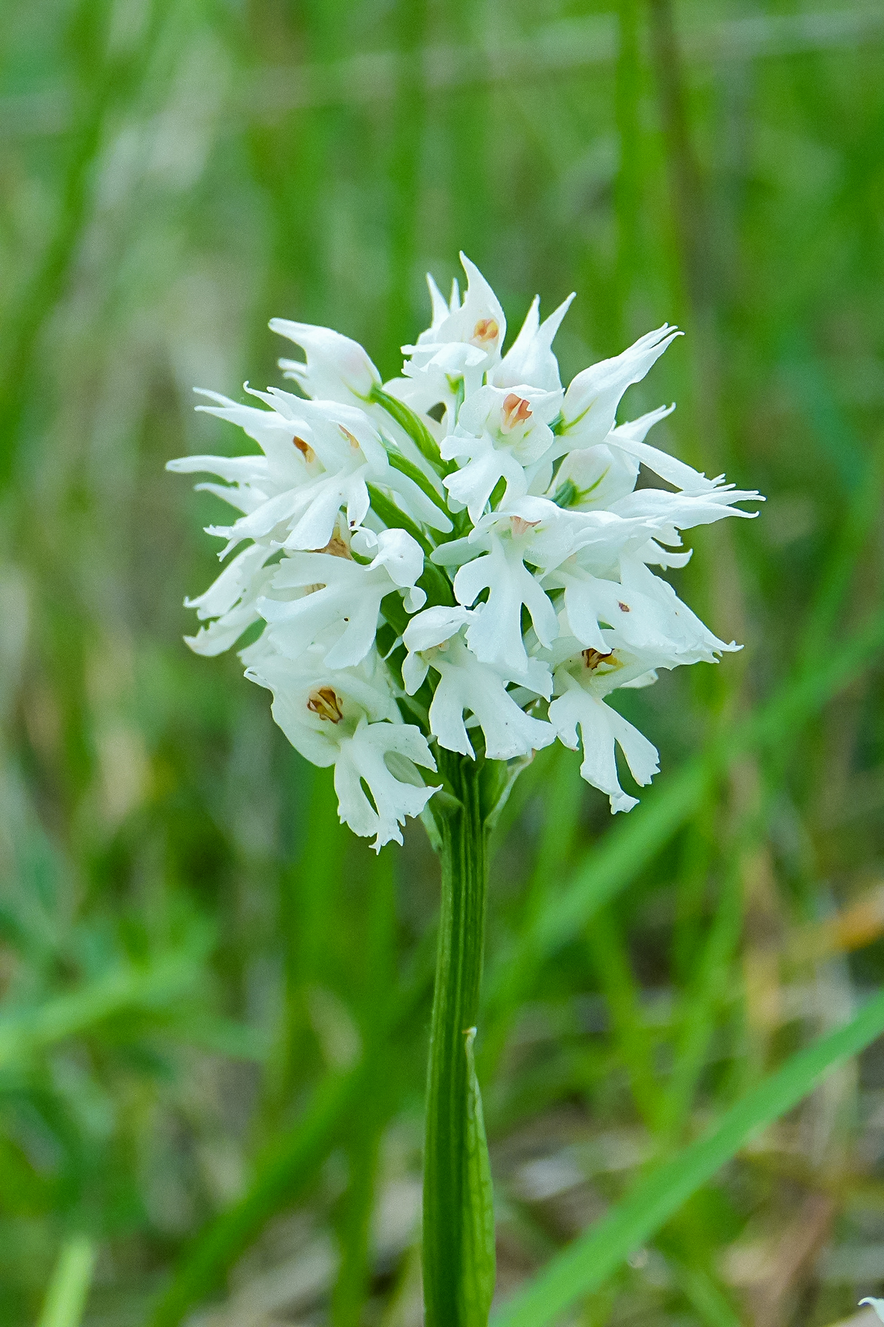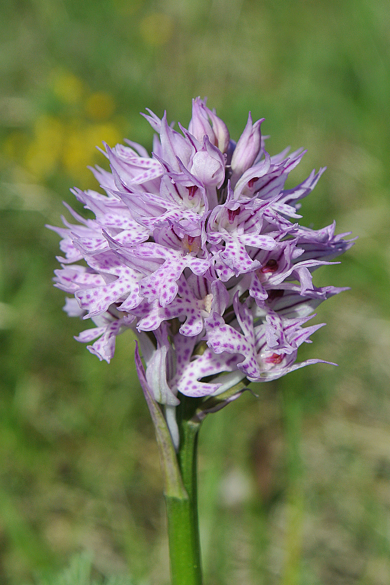 Infiorescenza densa, da subovoide fino a globosa, multiflora; fiori piuttosto piccoli, bianco-rosati, lievemente profumati. Sepali ovato-lanceolati, conniventi con i petali strettamente lanceolati a formare un casco chiuso di colore roseo-violaceo con striature porporine, che appare a 3 punte per la forma acuminata degli apici dei sepali, separati tra loro. Labello da bianco a roseo con macchie irregolari roseo-porporine, nettamente trilobo, con lobo mediano allargato e spesso appena bilobato (a volte subintero o denticolato); lobi laterali più corti, piuttosto stretti e divaricati; sperone lungo come l’ovario o poco più corto (5-10 mm), cilindrico, incurvato in basso; ginostemio molto corto e ottuso, stigma subcordiforme, antera violetto-porporina con logge parallele, separate da una piccola piega rostellare (riproduzione allogama); masse polliniche verdastre; ovario sessile verde pallido; capsula ovoide allungata. Entità diploide (numero cromosomico: 2n = 42).