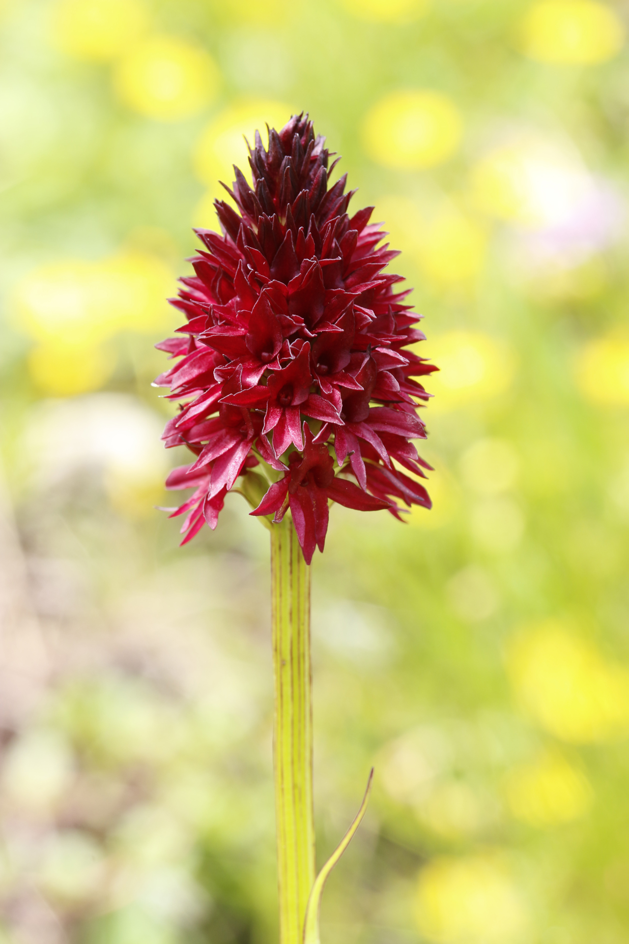 Infiorescenza densa, dapprima conica, poi ovoide-globosa, infine più allungata (rapporto altezza/larghezza 1,0-1,3), con fiori allogami profumati di vaniglia o cioccolato, di colore per lo più bruno-purpureo scuro o rosso-nerastro, a volte le infiorescenze sono variamente colorate (dall’arancio al rosa al giallastro e fino al bianco).