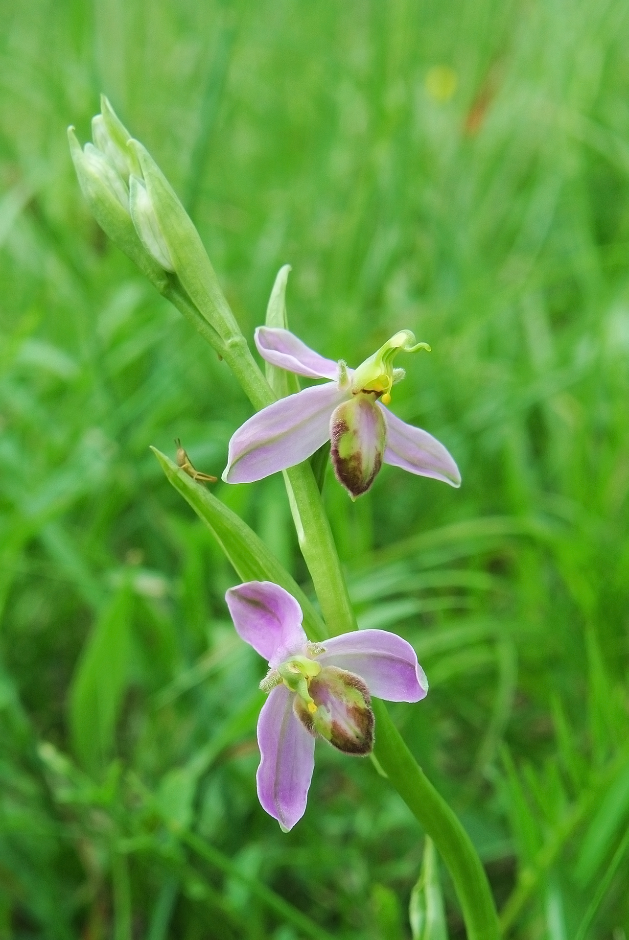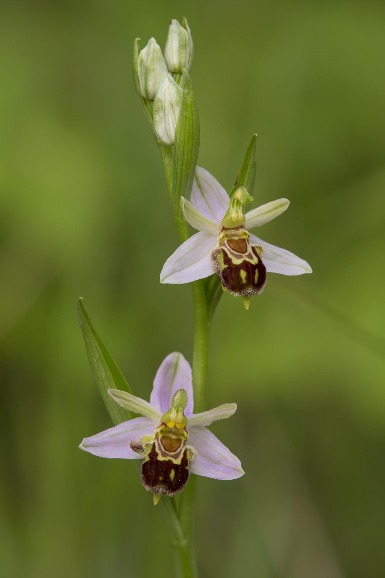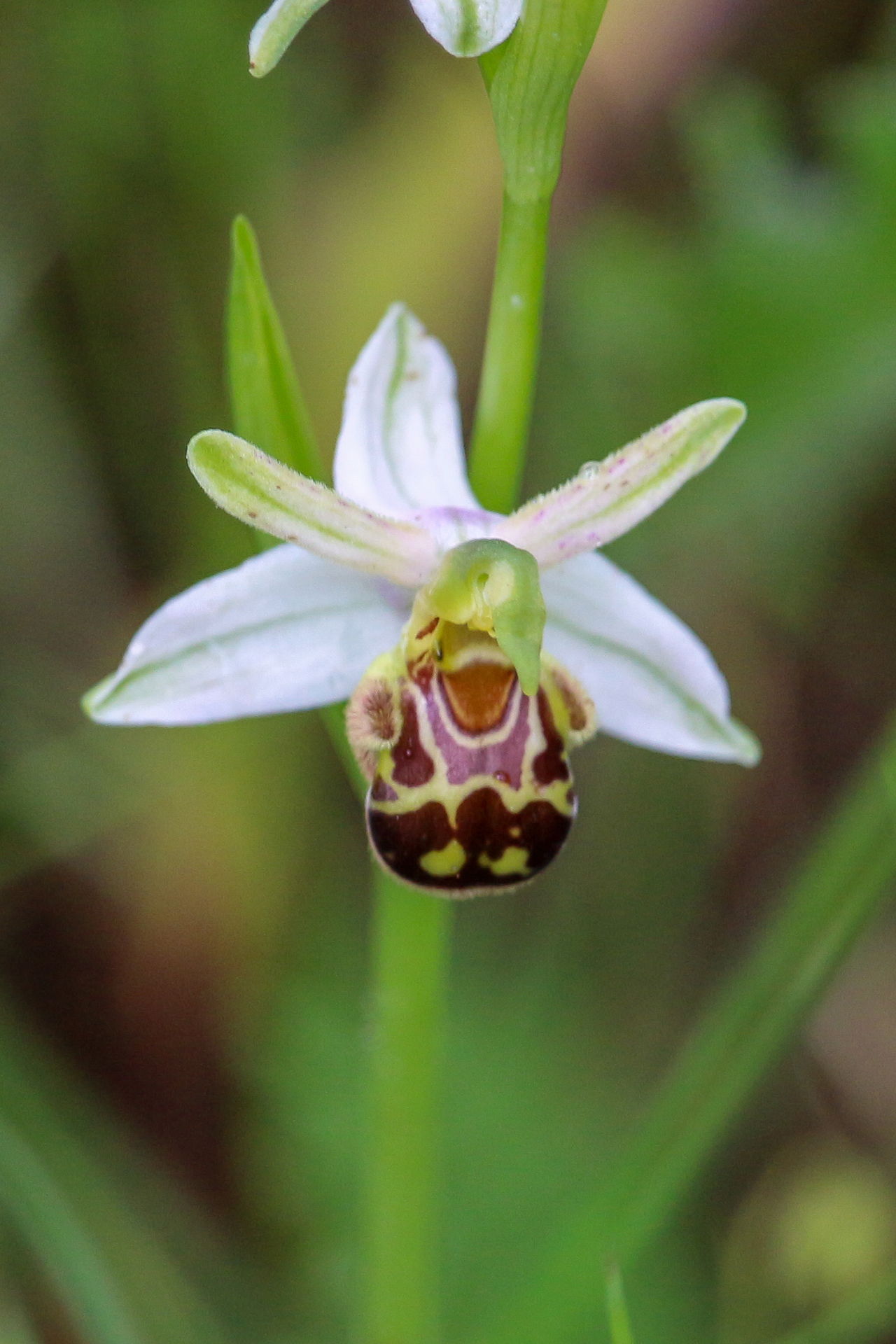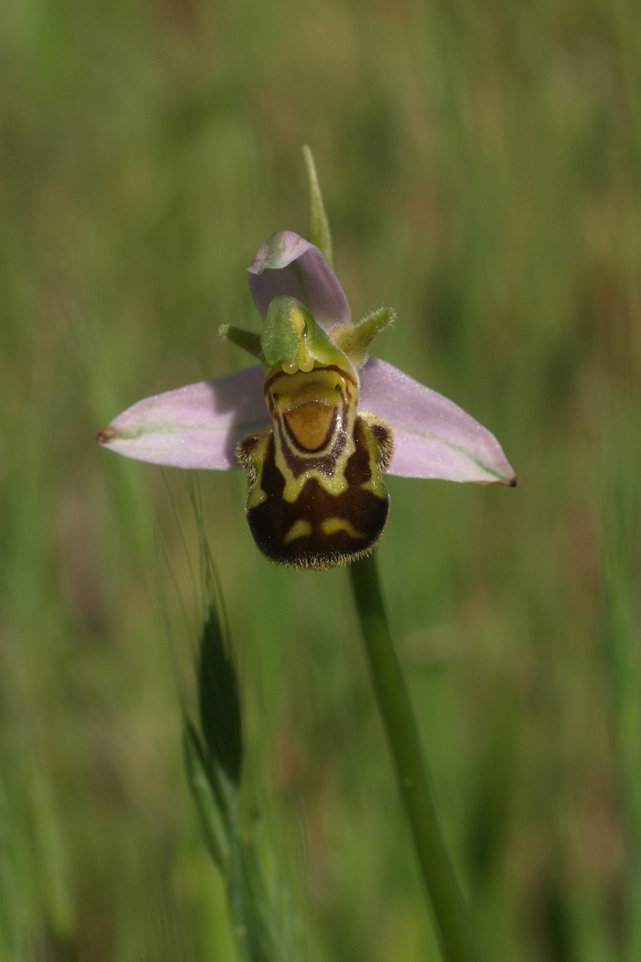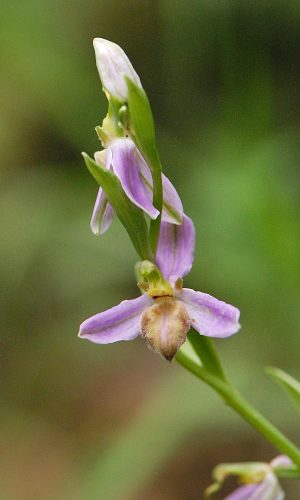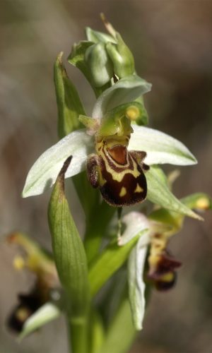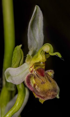 Sepali ovato-lanceolati (11-17 × 5-9 mm), bianchi, rosei o violaceo-porporini, con nervatura mediana verde, il dorsale eretto e poi decisamente ripiegato all’indietro; petali piccoli e molto corti (1-3 × 1 mm), vagamente triangolari, diretti in avanti, ottusi, pelosi, verdastri, talvolta con sfumature brune o rossastre. Labello piuttosto piccolo rispetto ai sepali, vellutato, bruno rossastro o bruno scuro, trilobato alla base, con lobi laterali ridotti a gibbe, piccoli, conici e molto pelosi, e lobo mediano tondeggiante, globoso, decisamente convesso, con margini revoluti; macula piccola e poco elaborata, limitata alla parte basale del labello, bruno-violacea, con ampio bordo bianco-giallastro, campo basale ben delimitato, a tinte bruno-aranciate più o meno intense; pelosità submarginale rasa, bruno-chiara; pseudo-occhi verdastri; apicolo triangolare, rivolto in basso o all’indietro e quindi poco visibile; ginostemio molto allungato e sinuoso; masserelle polliniche discendenti in breve tempo ad appoggiarsi sullo stigma per il ripiegamento delle lunghe caudicole (pianta regolarmente autogama).