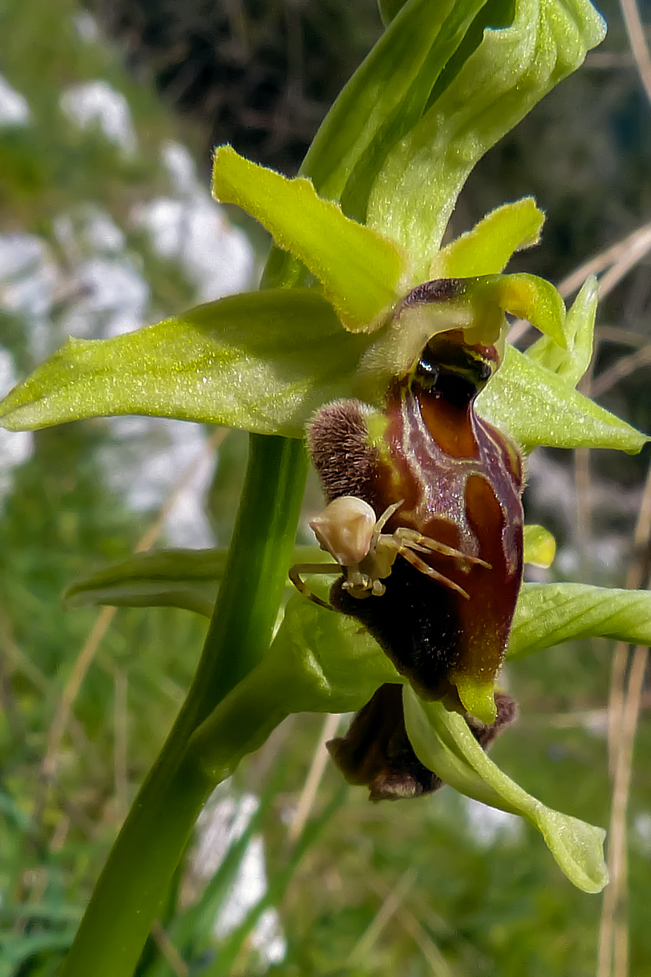 pianta di taglia un po’ minore, con fiori più grandi ma meno numerosi (4-8). Sepali più grandi (10,5-17 × 5,5-9 mm), da verdi-giallastri-biancastri a bianchi a rosa, petali simili a quelli di O. exaltata (6-11 × 2,5-4,5 mm), con toni più scuri e bordi ondulati e pelosetti. Labello più largo (9-14 × 11-19 mm), più squadrato (da subovoide a trapezoide), più chiaro e talora con bordo giallastro. Macula centrale a forma di H o X piuttosto elaborata. Apicolo un po’ più visibile. Impollinata da Colletes cunicularius.