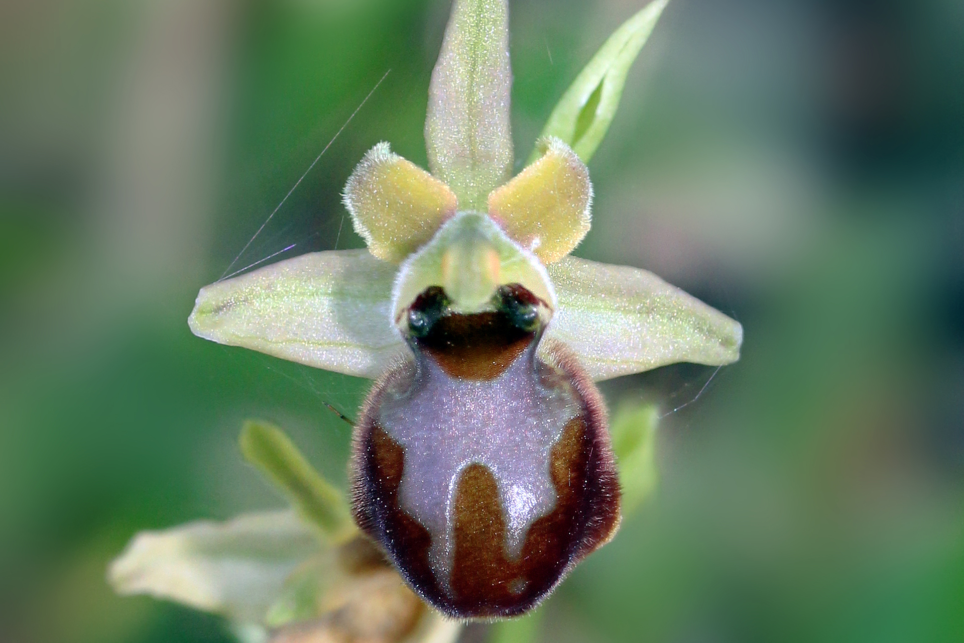 pianta piuttosto gracile, alta fino 30 cm, con fiori piccoli e numerosi (fino a 10); sepali verdi, lunghi 8-12 mm, petali 5-8 × 2-4 mm (lunghi 2/3 dei sepali), con bordi molto ondulati e ±giallastri (spesso ciliati negli esemplari maremmani); labello piccolo (5-10 × 6-12 mm), suborbicolare, con colori brillanti bruno-rossastri e margine più chiaro; macula molto grande con vaga forma di H, ma elaborata e frammentata, grigio-bluastra poco brillante e bordata di bianco; cavità stigmatica piccola, stretta alla base, pseudo-occhi verdi cerchiati di biancastro; apicolo ridottissimo; ginostemio inclinato ad angolo acuto sul labello. Impollinata da Andrena fulvata.