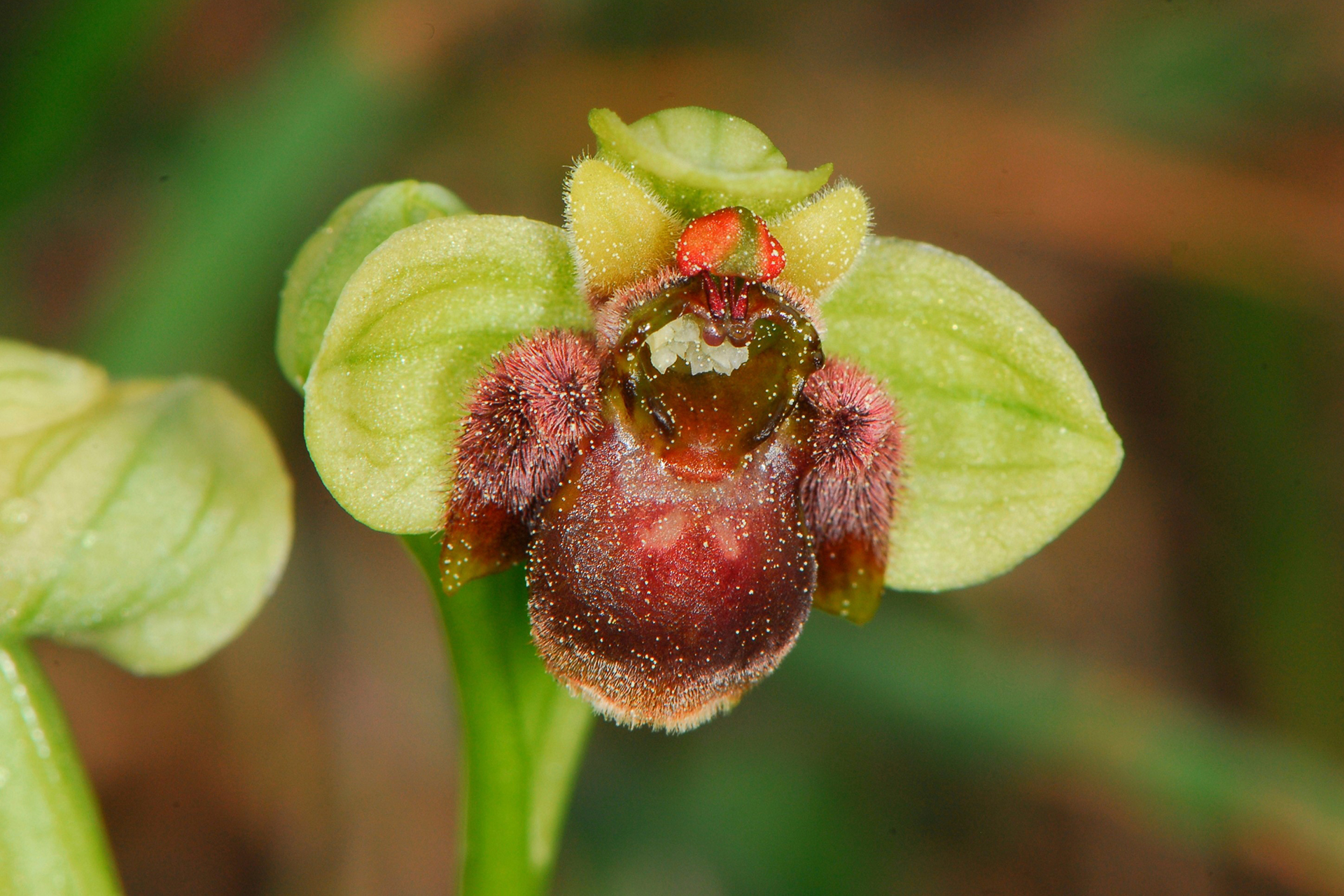 Pianta piccola (alta fino a 20 cm), con fiori piccoli (raramente più di 5) e brattee più corte dell’ovario. Sepali verdi, con vene longitudinali più scure, concavi e largamente ovati (9-12 × 6-8 mm), petali piccoli, subtriangolari (3-4 × 3-4 mm), ciliati, ottusi, verde-giallastri a base bruno-scura. Labello ovato-arrotondato (8-10 × 11-13 mm), di colore bruno piuttosto uniforme, trilobato con lobi laterali in posizione basale a mo’ di gibbe coniche e pelose; lobo mediano globoso, con pelosità marginale corta e piuttosto chiara presente soprattutto nella parte apicale; macula poco evidente, brunastra, grigia o violacea, a volte con margine chiaro; apicolo ridotto, poco visibile e sormontato da un ciuffo di peli biancastri, nascosto sotto il labello; cavità stigmatica relativamente grande, cuoriforme, contornata da callosità in rilievo; ginostemio a becco corto e arrotondato; logge dell’antera rossastre all’esterno.