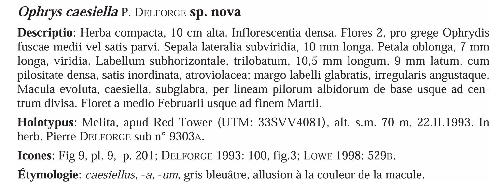 Caratteri distintivi essenziali rispetto alle altre Fuscae: pianta piccola e gracile (da 10 a 20 cm di altezza), infiorescenza densa con 2-6 fiori piccoli; sepali lunghi 8,5-11 mm, petali 4,5-6 × 1,8-2,5 mm; labello corto e piuttosto allargato (10-13 × 9-11 mm, rapporto lunghezza/larghezza 1,17), suborizzontale, non piegato alla base e convesso trasversalmente, meno in senso longitudinale, dai colori piuttosto opachi; lobi laterali piuttosto piccoli e appena ribattuti, molto spioventi (angolo spalle/asse del labello tra 22 e 28°), mammosità basali poco evidenti; pelosità densa e disordinata, violacea scura; macula relativamente grande, spesso poco definita, con lunule grigio-bluastre a volte marmorizzate e solco centrale che giunge solo fin verso la metà della macula; sottile bordo irregolare giallastro o verdastro; retro labellare bianco-verdastro, a volte con sfumature brune o porporne. L’antesi è precoce (mese di massima fioritura marzo). Impollinata da Andrena flavipes.