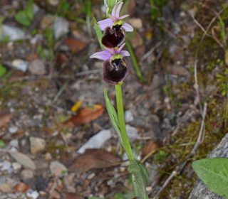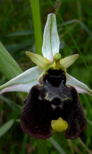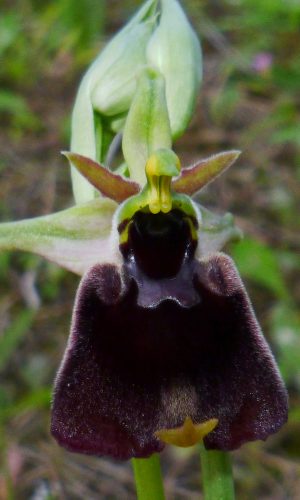 Pianta slanciata, di solito con 3-5 fiori grandi (abitualmente solo un paio in antesi insieme). Sepali ovato-oblunghi (10-18 × 5-8 mm), da rosei a biancastri con linea centrale verde; petali strettamente triangolari-lanceolati (4-6,5 × 1,5-3 mm), finemente ciliati ai margini, concolori ai sepali o verdastri-giallastri. Labello trapezoidale, molto ampio (12-18 × 15-23 mm), con pelosità submarginale completa, di colore bruno-rossiccio molto scuro, fino a nerastro nella parte centrale, con gibbosità moderate, coniche o arrotondate; macula basale piccola, con disegno semplice a forma di H, X o U, grigio-malva, spesso marginata da una linea chiara; apicolo grosso ed eretto, campo basale e cavità stigmatica molto scuri, concolori al centro del labello. Impollinata dal bombo Psithyrus vestalis, che è lo stesso di O. normanii (sect. Tenthrediniferae).