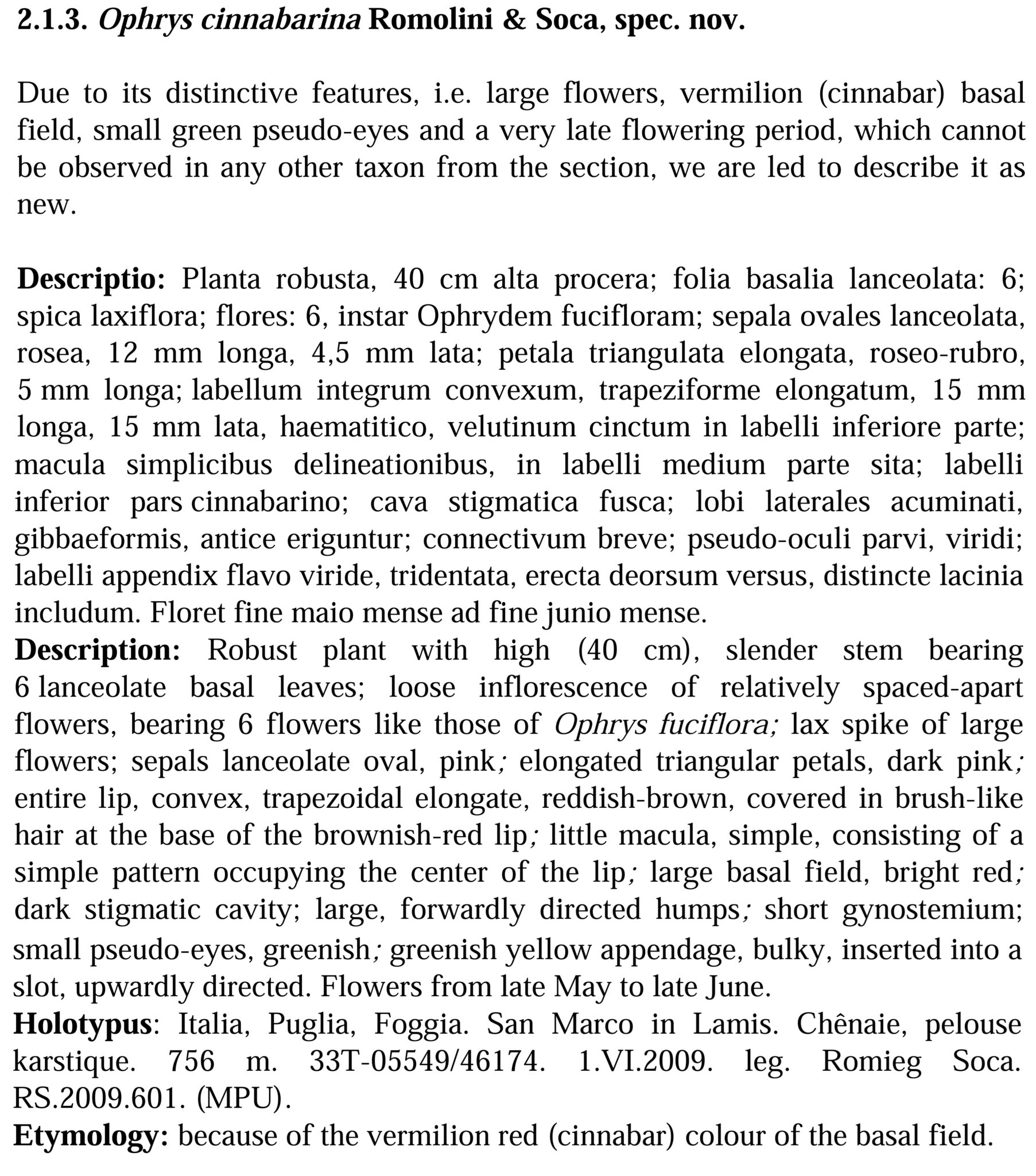 pianta robusta con 3-9 fiori grandi; sepali subuguali a quelli di O. appennina, petali più corti e triangolari (2,5-3,5 × 1,5-3,5 mm, lunghi circa 1/4 dei sepali); labello (sub)trapezoidale, talvolta vagamente subromboidale (12-17,5 × 13-19 mm), non convesso ma appena bombato al centro, con gibbe poco prominenti, rivolte in avanti; apicolo grosso, inserito in una profonda incisura; macula basale piuttosto semplice e non troppo estesa rispetto all’ampiezza del labello, ben delimitante un campo basale rosso vermiglio, ampio e allungato, più chiaro del centro del labello; cavità stigmatica bassa e scura, pseudo-occhi piccoli, grigio-verdastri a volte con cerchiatura giallina.