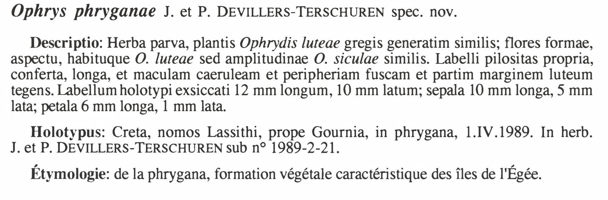 Fin dalla prima descrizione Foelsche & Foelsche (2002) evidenziarono gli stretti rapporti di Ophrys corsica (e le sue differenze) con O. lutea, O. sicula e O. phryganae (nel protologo di quest'ultima, descritta dai Devillers nel 1991 a Creta e qui sopra riportato, si faceva riferimento a O. lutea e a O. sicula). Sembra chiaro che si tratti di entità ibridogene a partire dalle due specie principali della sect. Luteae, che i confronti morfometrici di Hennecke (2017, 2019) hanno confermato: Ophrys ×phryganae è l'ibrido originario tra O. lutea e O. sicula. Ma le sue successive segnalazioni un po' in tutto l'areale dove si incontrano i parentali hanno fatto pensare piuttosto a una specie di origine ibridogena, con diverse varietà geografiche, tra cui una delle più importanti sarebbe Ophrys phryganae var. corsica (Soleirol ex G. Foelsche & W. Foelsche) Hennecke 2017. Al momento preferiamo mantenere la denominazione originaria, considerando che anche Ophrys corsica potrebbe essere più propriamente considerata una specie di origine ibridogena, frutto forse di ripetuti incroci, reincroci e introgressioni, anche se il suo areale si sovrappone più che altro a O. sicula (ma nell'Italia meridionale anche a O. lutea). In ogni caso localmente potrebbe aver sostituito il parentale (o i parentali).