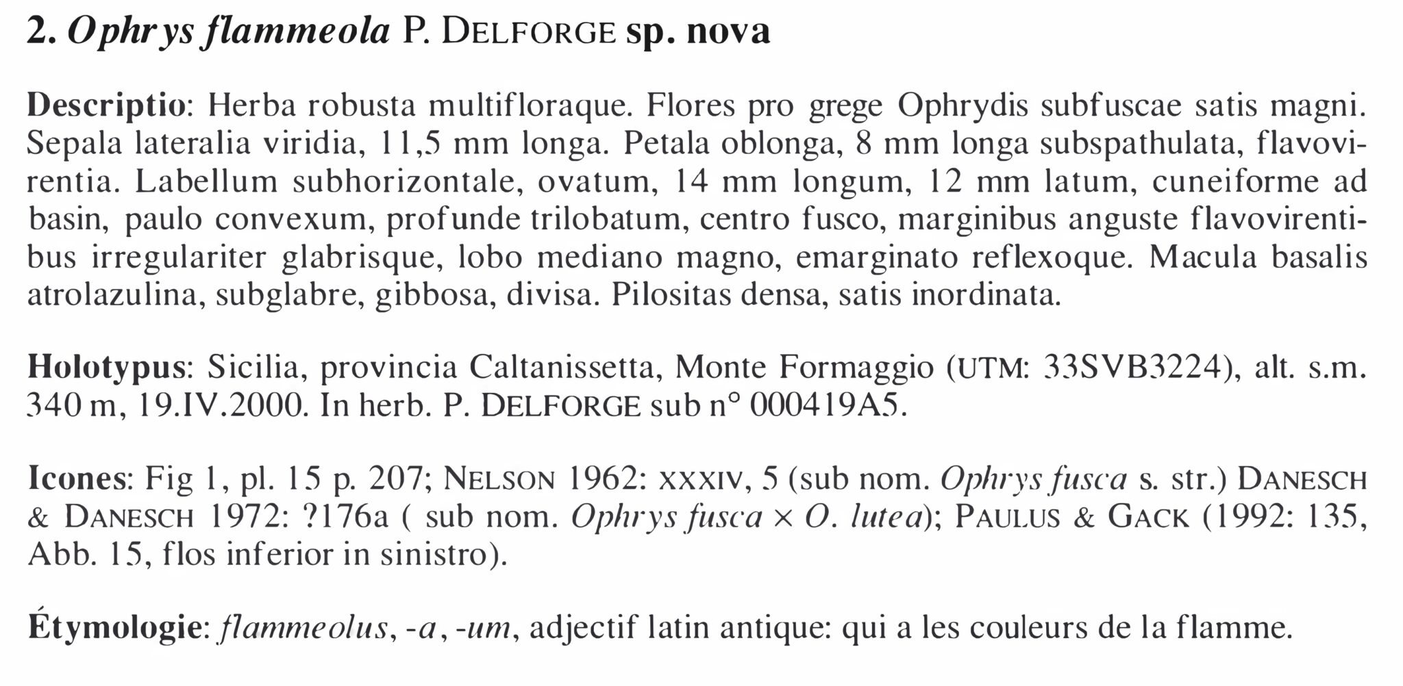 Caratteri distintivi rispetto a Ophrys sicula:pianta robusta e slanciata (può superare i 35 cm di altezza); infiorescenza più densa, con 3-9 fiori medio-grandi; tepali più lunghi, i sepali lunghi 10,5-16 mm, i petali 6-8,5 mm; labello ovato, più allungato (11-16,5 × 10-14 mm, rapporto lunghezza/larghezza 1,20), suborizzontale ma convesso trasversalmente per le mammosità basali abbastanza rilevate, e a volte sinuoso longitudinalmente (con depressione centrale); angolo spalle/asse del labello tra 40 e 47°; retro del labello giallo-(verdastro); lobi laterali falciformi con seni piuttosto larghi e profondi; lobo mediano grande, spesso squadrato alla base e allargato all’estremità; pelosità labellare densa, bruna al centro e di colore rossastro più diluito verso il margine giallo, sottile ma di solito abbastanza evidente; l’ampia parte scura centrale raggiunge i seni e penetra decisamente nel lobo mediano; anche la macula è piuttosto estesa (ma non raggiunge i seni), blu glabrescente, allargata e bilunulata all’estremità; cavità stigmatica piccola con densa pelosità bianca.
