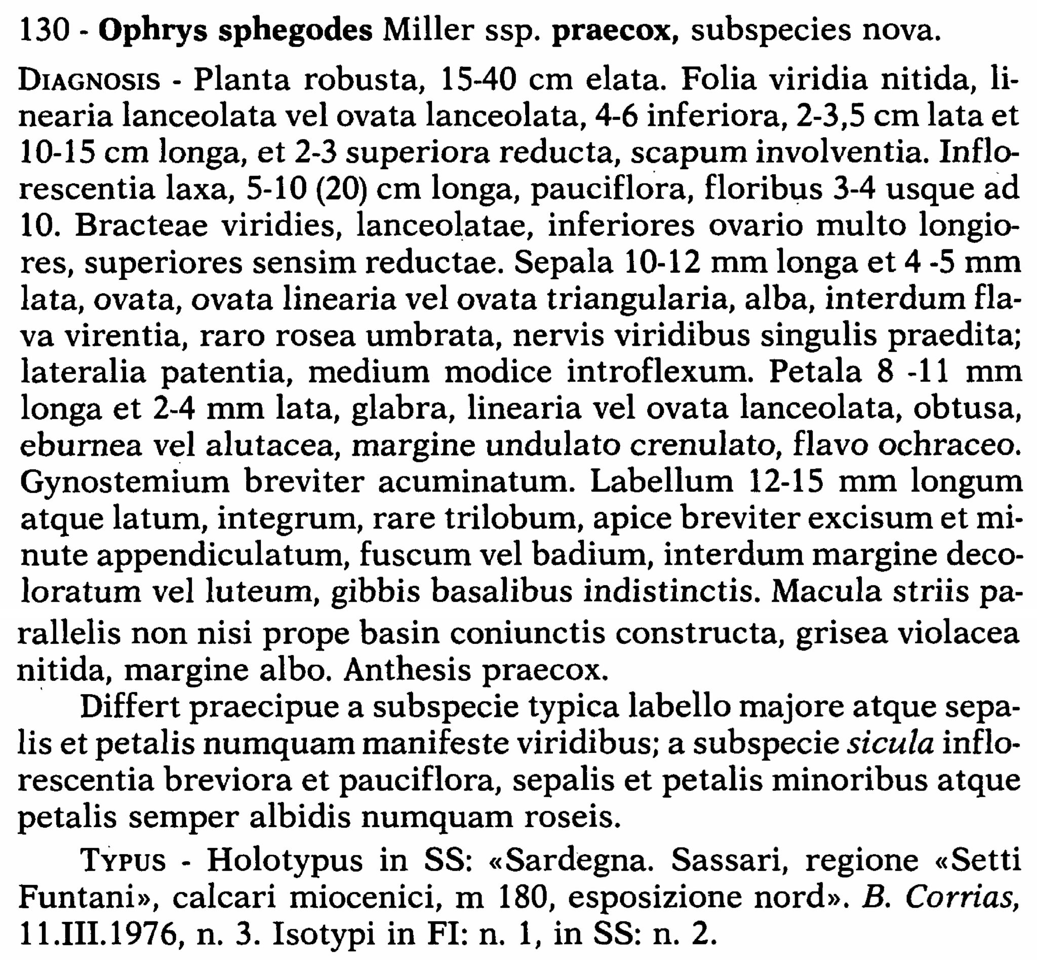 Protologo di Bruno Corrias 1983 della var. praecox (Ophrys sphegodes subsp. praecox):