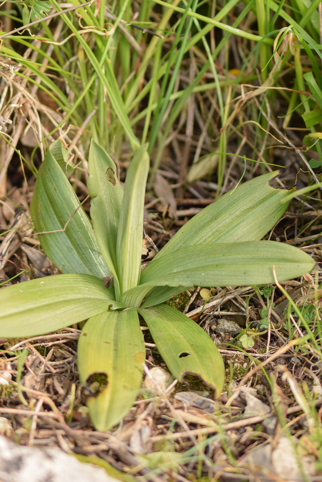 pianta robusta, alta anche più di 40 cm, con 3-7 o più fiori medio-grandi; tepali di colore variabile, i sepali (10-15 × 5-8 mm) da roseo chiari a rosa intenso o verde-biancastri o anche verde vivo, con nervatura centrale verde (nella var. praecox di solito bianco-verdastri); petali lunghi poco più di 2/3 dei sepali (7-11 × 2-4 mm), glabri con bordi un po’ ondulati, di toni più intensi rispetto ai sepali (nella var. praecox di solito bianco-rosati o giallastri); labello allargato e arrotondato (11-15 × 10-18 mm), da subovato a suborbicolare a subquadrangolare, un po’ convesso, subintero o subtrilobo, con gibbe poco evidenti (a volte di più nella var. praecox, in caso di labello più nettamente trilobo) e apicolo ridotto ma evidente, in una profonda incisione del bordo apicale; labello da bruno scuro a marrone-rossastro, con pelosità submarginale densa e più chiara, a volte giallastra all’estremità; macula in posizione basale, lucida e semplice, di solito a forma di H rossastra o bluastra, spesso bordata da una linea bianca o grigia; cavità stigmatica concolore col centro del labello centrale, come il campo basale (più chiaro nella var. praecox); pseudo-occhi grigi o verdastri (più verdi nella var. praecox). Impollinata soprattutto da Andrena thoracica.