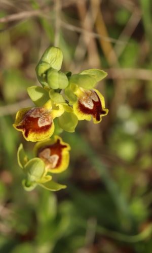 Segnalazioni di piante della sect. Luteae con labello quasi interamente scuro nell’Italia meridionale (specialmente tra Puglia e Calabria e in Sicilia), erano state ipotizzate erroneamente come Ophrys melena (Renz) Paulus & Gack 1990 (da Ophrys lutea subsp. melena Renz 1928), entità ellenico-balcanica controversa, considerata da alcuni variante melanica di O. sicula, o - forse più propriamente - di origine ibridogena tra O. sicula e un taxon non meglio identificato della ser. Fuscae.