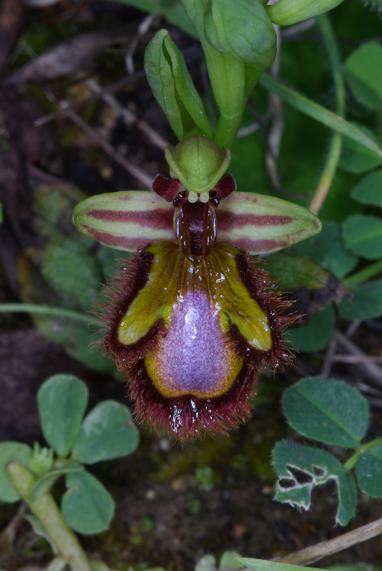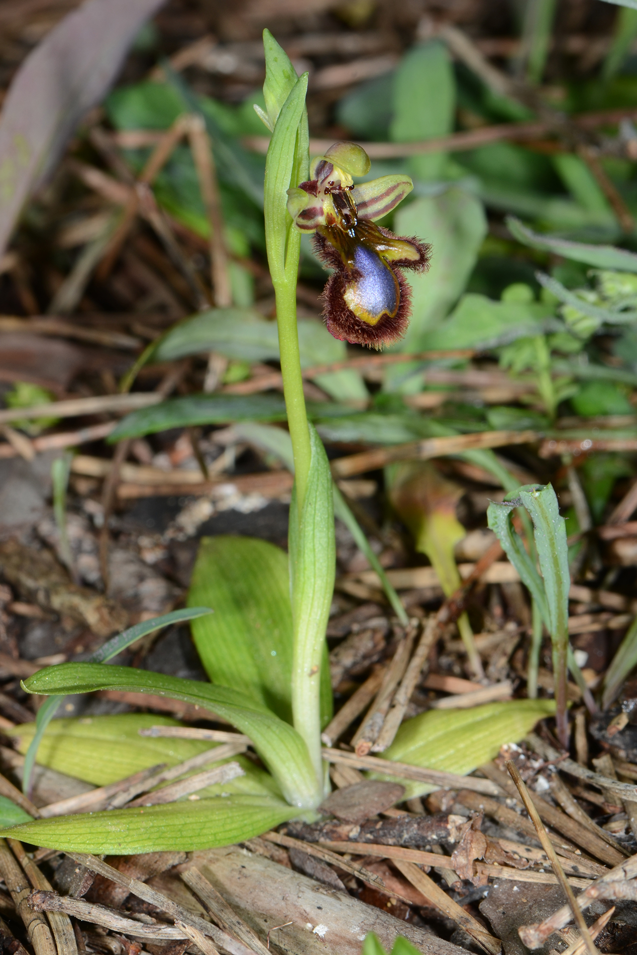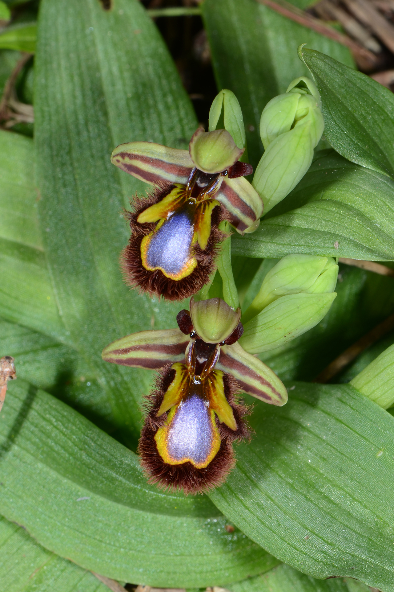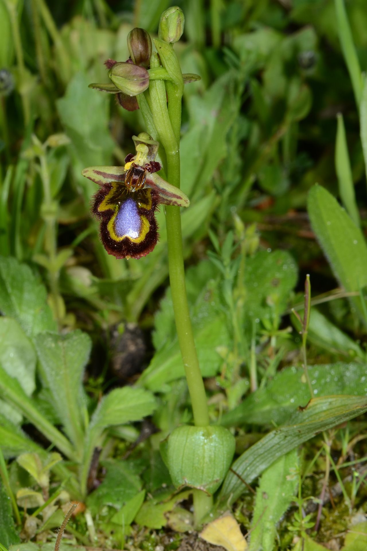 Pianta piccola, raramente più alta di 20 cm. Infiorescenza con 2-6 fiori medio-grandi, rivolti in avanti o leggermente penduli; brattee poco più lunghe dell’ovario. Sepali color verde chiaro con 2(3) fasce bruno-rossastre sulla faccia interna, a margini revoluti, ovati-oblunghi (7-10 × 3-5 mm), concavi, ottusi, il dorsale arcuato in avanti a coprire il ginostemio; petali corti, triangolari, ottusi e decisamente arcuati all’indietro, lunghi 4-6 mm, bruno-rossastri e vellutati. Labello trilobo nella metà basale, senza apicolo, obovato, lungo 12-16 mm, a base di solito bruno-nerastra, con larga (0,5-1,5 mm) fascia submarginale coperta da lunghi e fitti peli bruno-rossastri; lobi laterali piuttosto corti, giallo-verdastri a base bruna, ovati o vagamente triangolari, diretti obliquamente verso l’esterno e/o un po’ in avanti; lobo mediano più ampio, leggermente convesso, in gran parte occupato dalla macula grande e brillante, blu o violacea, lievemente incisa all’apice, bordata da una fascia marginale giallo-verdastra o aranciata più o meno ampia; campo basale lucente, bruno scuro, da ovato a ellittico, orlato da due callosità in rilievo dello stesso colore; pseudo-occhi e punti staminodiali bruno-nerastri, lucenti e bene evidenti; ginostemio corto e ottuso.