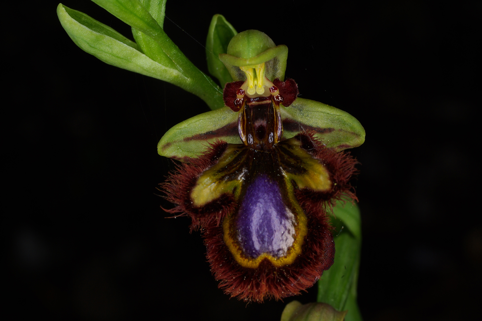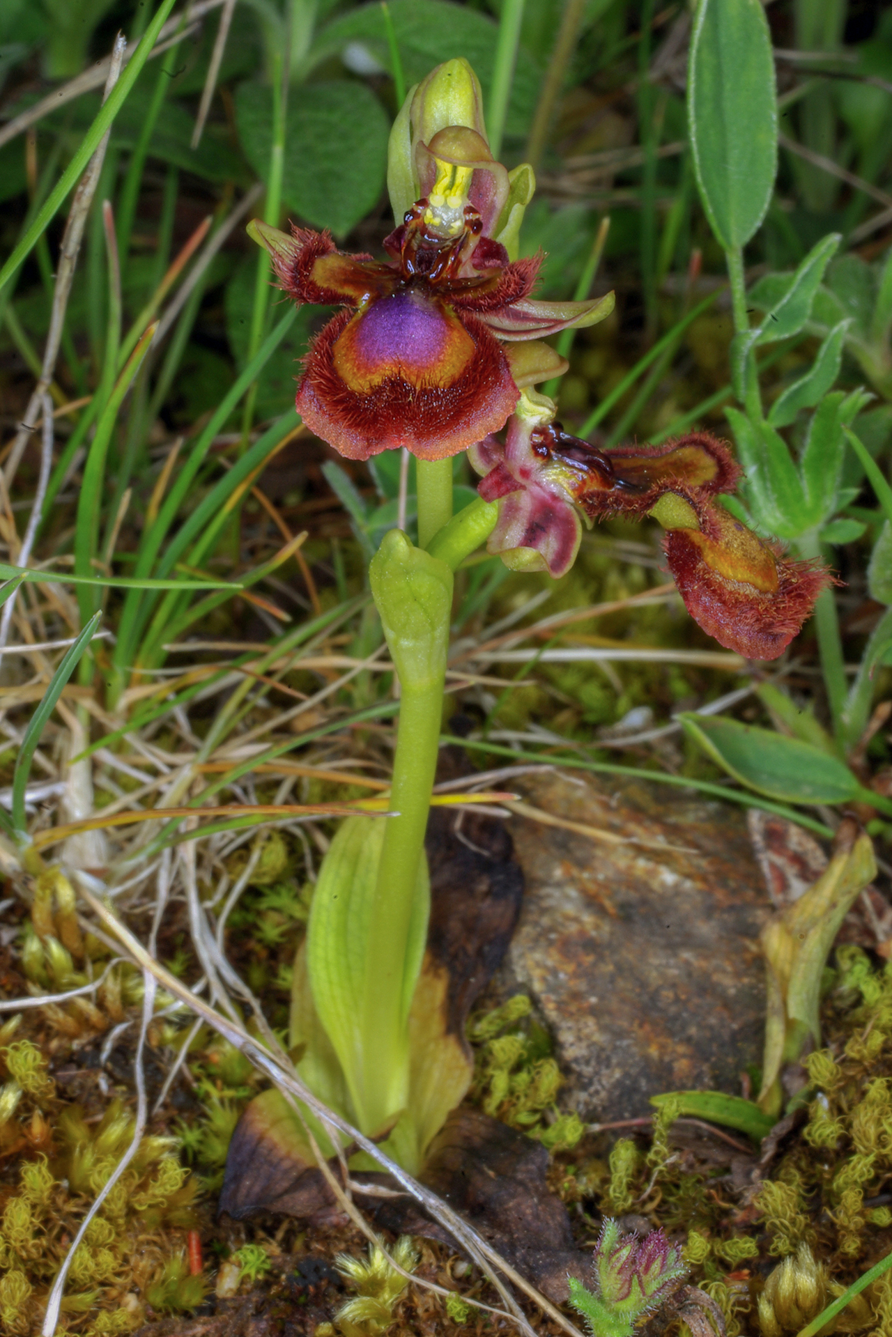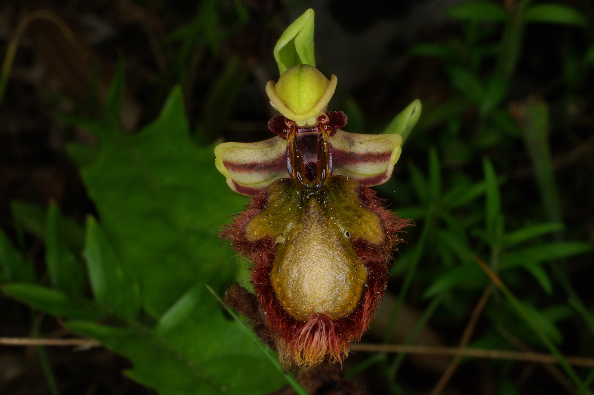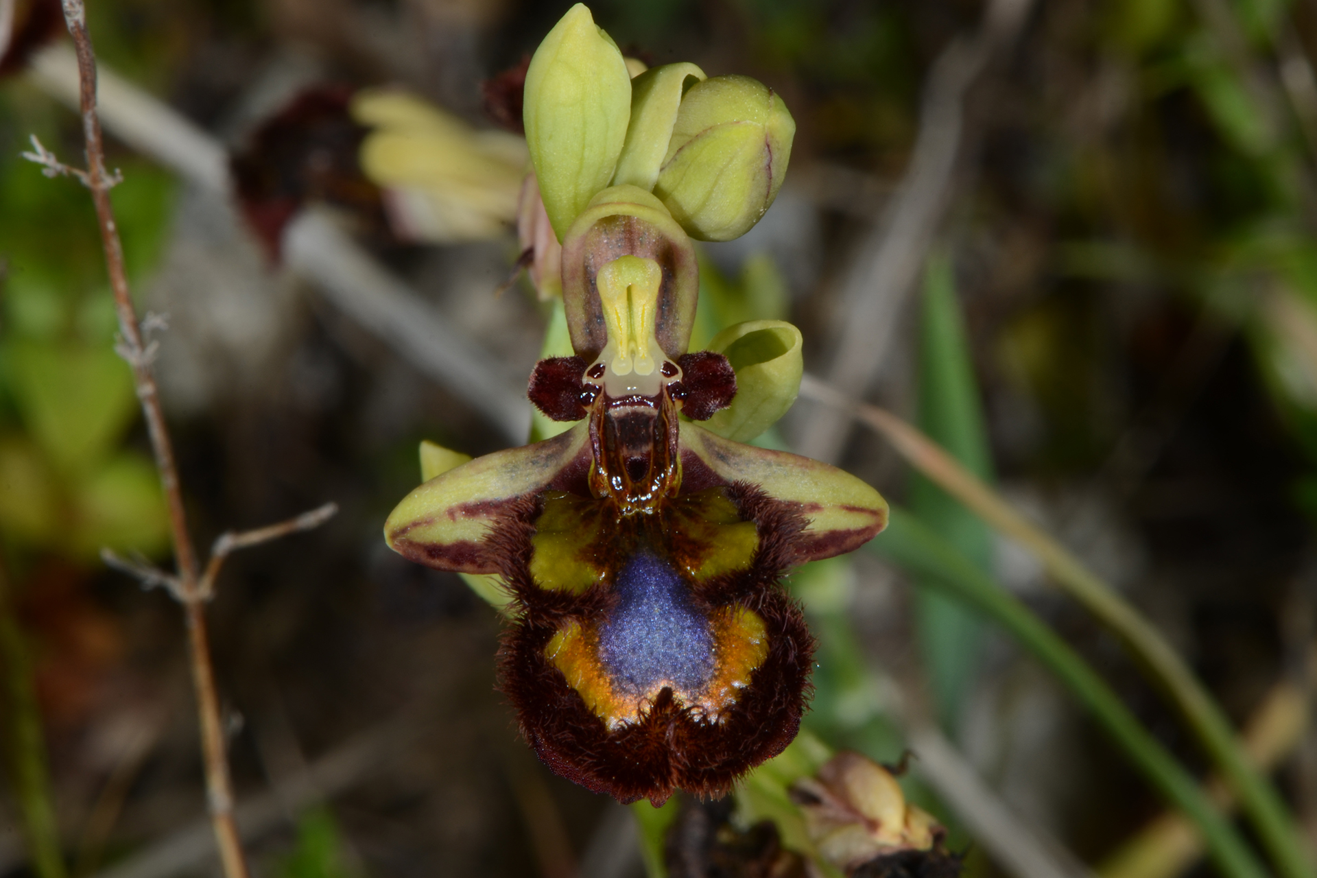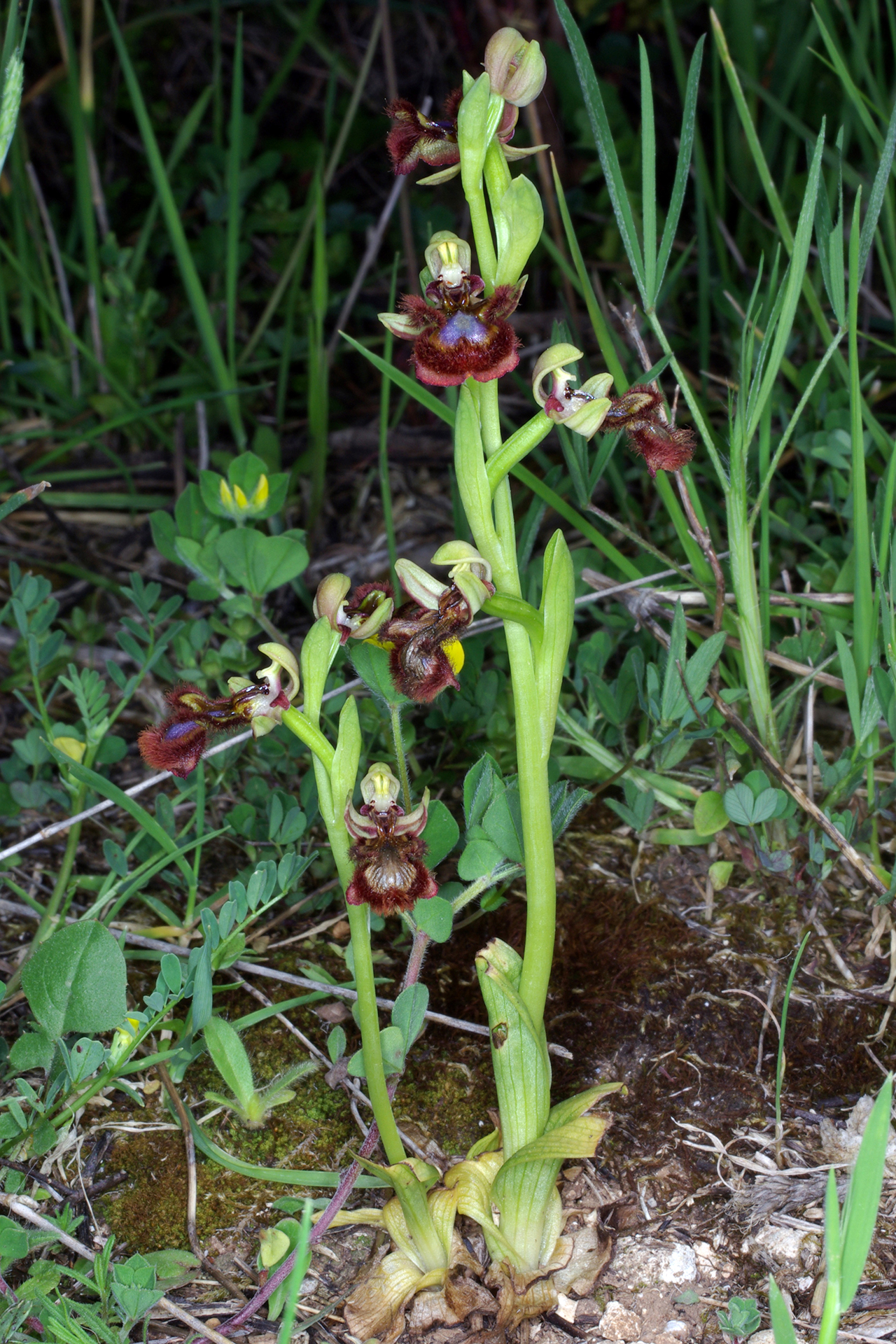 Pianta piccola, raramente più alta di 20 cm. Infiorescenza con 2-6 fiori medio-grandi, rivolti in avanti o leggermente penduli; brattee poco più lunghe dell’ovario. Sepali color verde chiaro con 2(3) fasce bruno-rossastre sulla faccia interna, a margini revoluti, ovati-oblunghi (7-10 × 3-5 mm), concavi, ottusi, il dorsale arcuato in avanti a coprire il ginostemio; petali corti, triangolari, ottusi e decisamente arcuati all’indietro, lunghi 4-6 mm, bruno-rossastri e vellutati. Labello trilobo nella metà basale, senza apicolo, obovato, lungo 12-16 mm, a base di solito bruno-nerastra, con larga (0,5-1,5 mm) fascia submarginale coperta da lunghi e fitti peli bruno-rossastri; lobi laterali piuttosto corti, giallo-verdastri a base bruna, ovati o vagamente triangolari, diretti obliquamente verso l’esterno e/o un po’ in avanti; lobo mediano più ampio, leggermente convesso, in gran parte occupato dalla macula grande e brillante, blu o violacea, lievemente incisa all’apice, bordata da una fascia marginale giallo-verdastra o aranciata più o meno ampia; campo basale lucente, bruno scuro, da ovato a ellittico, orlato da due callosità in rilievo dello stesso colore; pseudo-occhi e punti staminodiali bruno-nerastri, lucenti e bene evidenti; ginostemio corto e ottuso.
