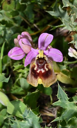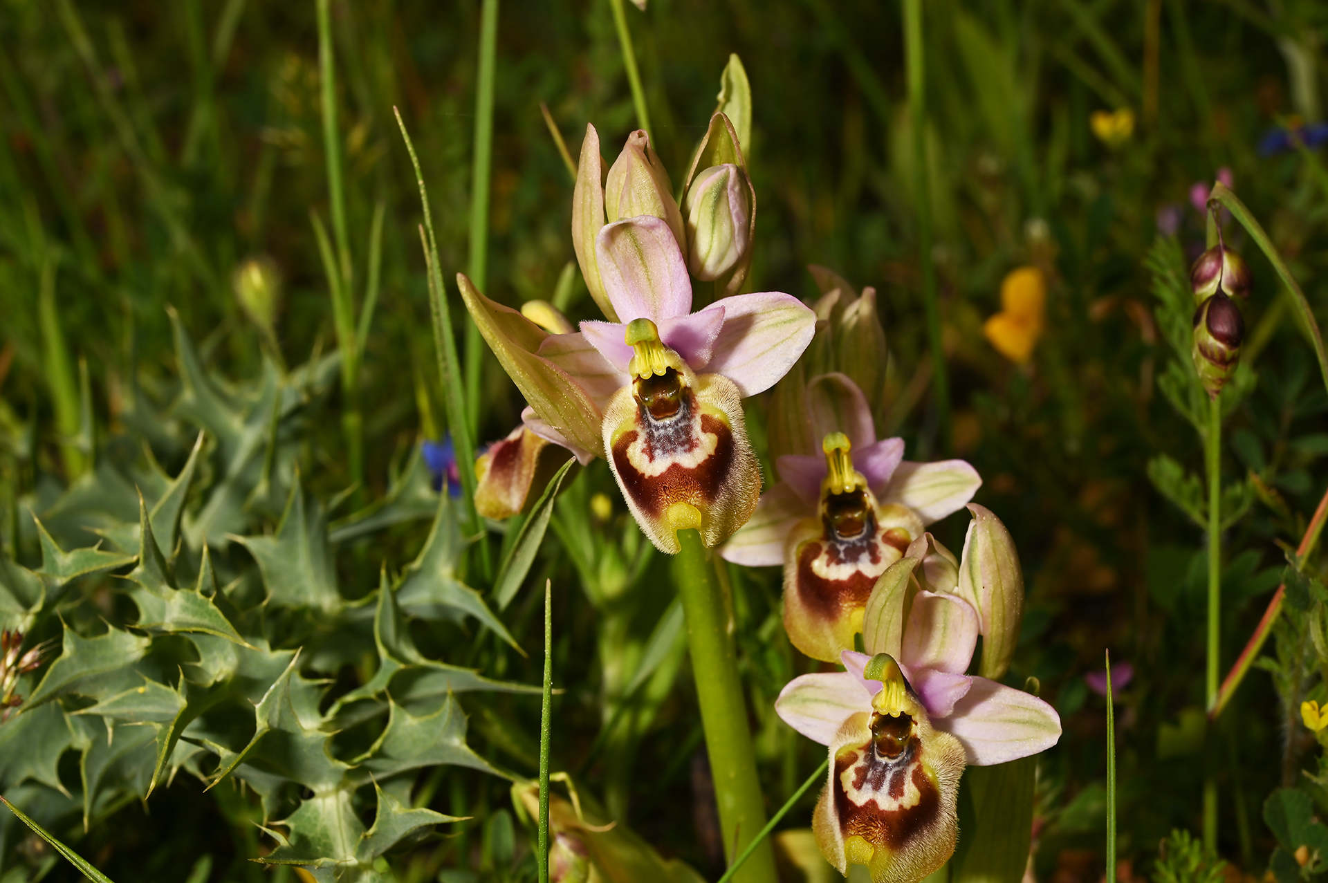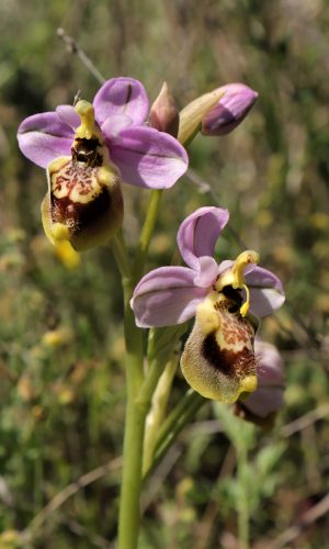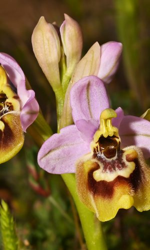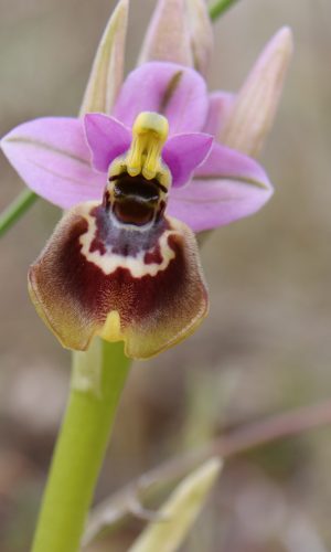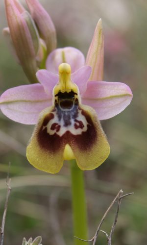 Pianta di aspetto intermedio tra Ophrys neglecta e Ophrys candica; brattee spesso colorate (concolori ai sepali); infiorescenza piuttosto densa, con 3-7 fiori grandi, più simili per dimensioni a quelli di candica; tepali come in neglecta, i sepali 10-15 × 6-11 mm, i petali 3-4,5 × 2,5-3 mm.