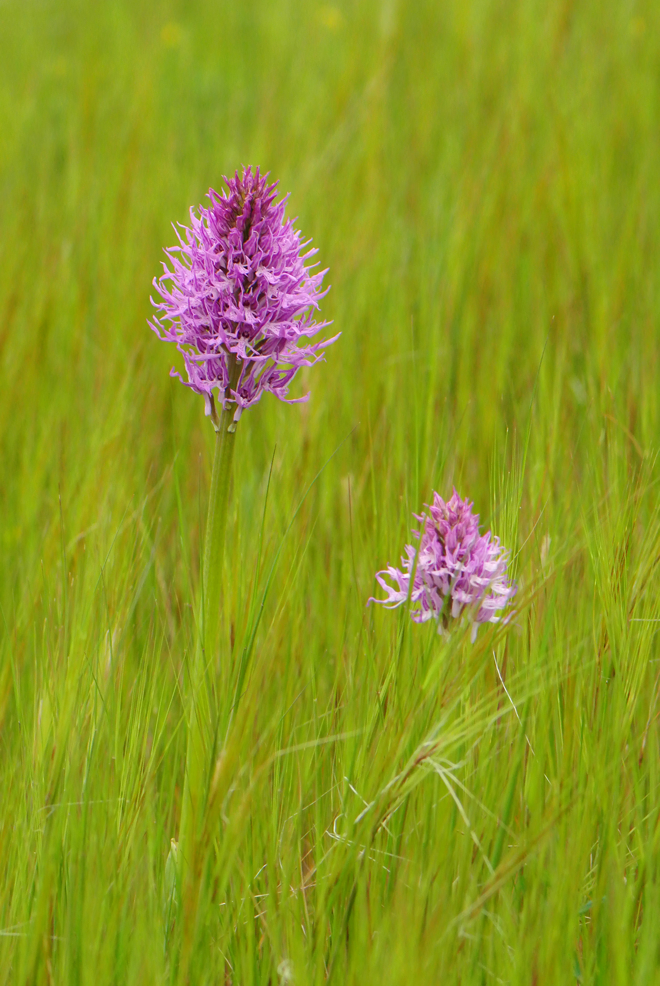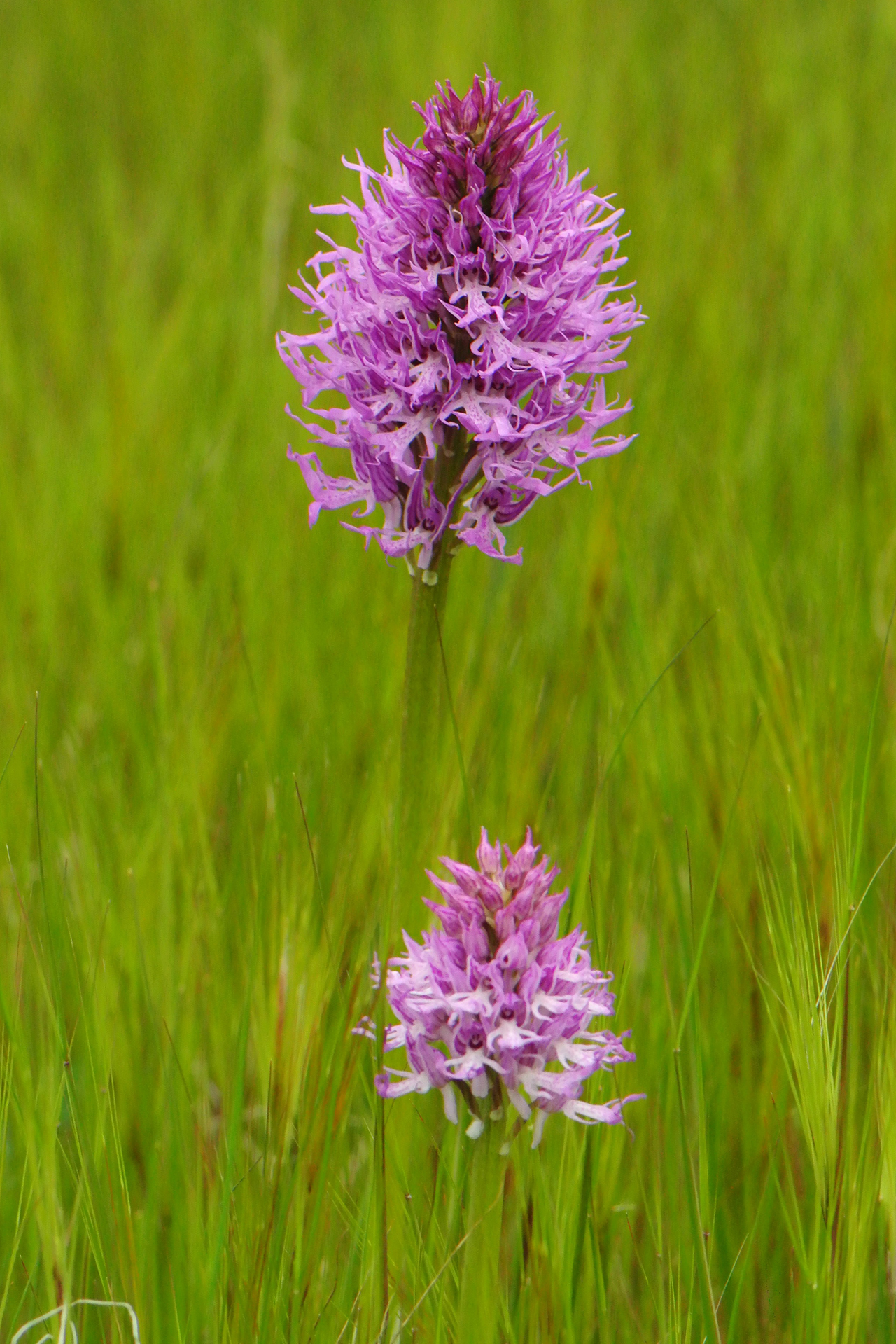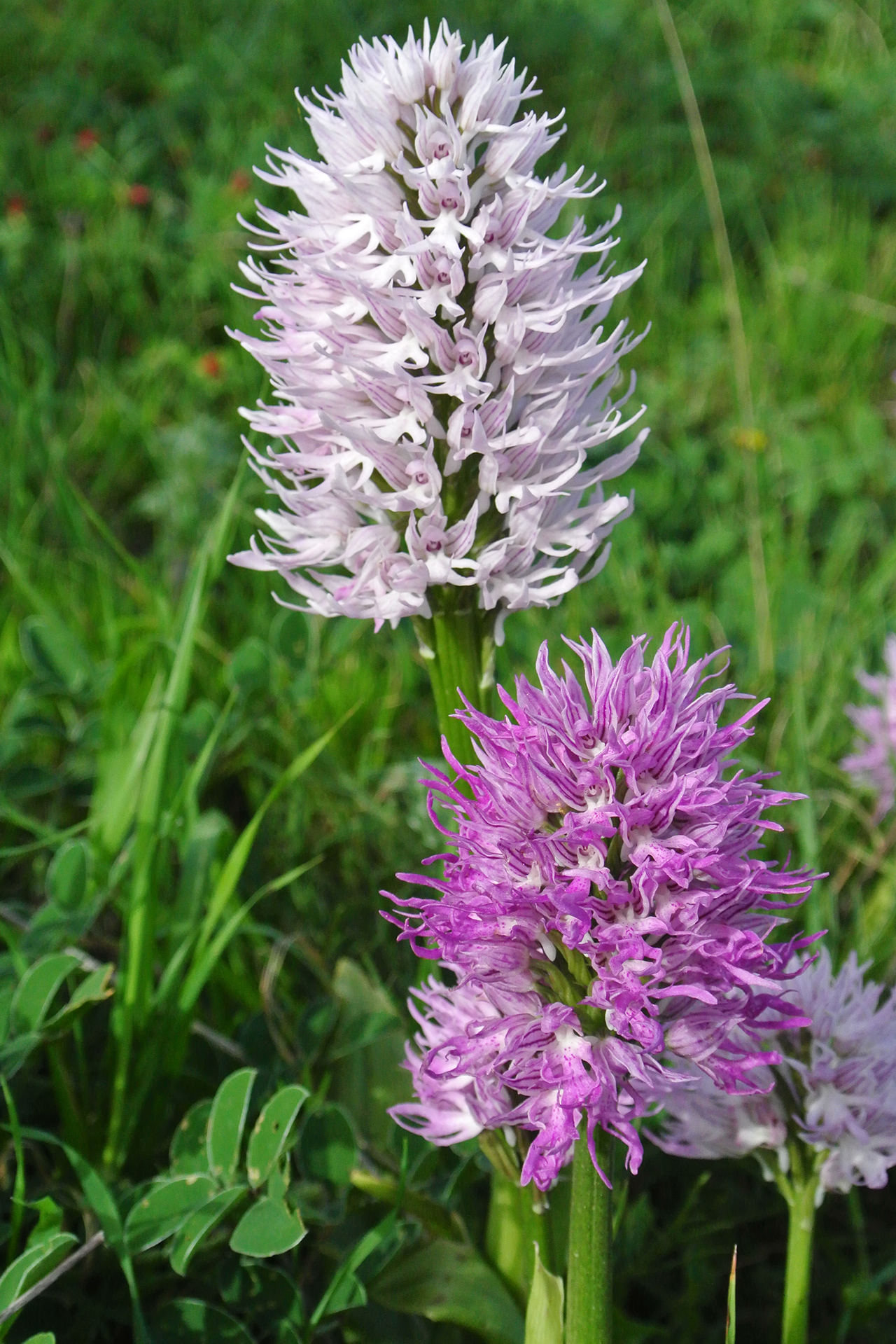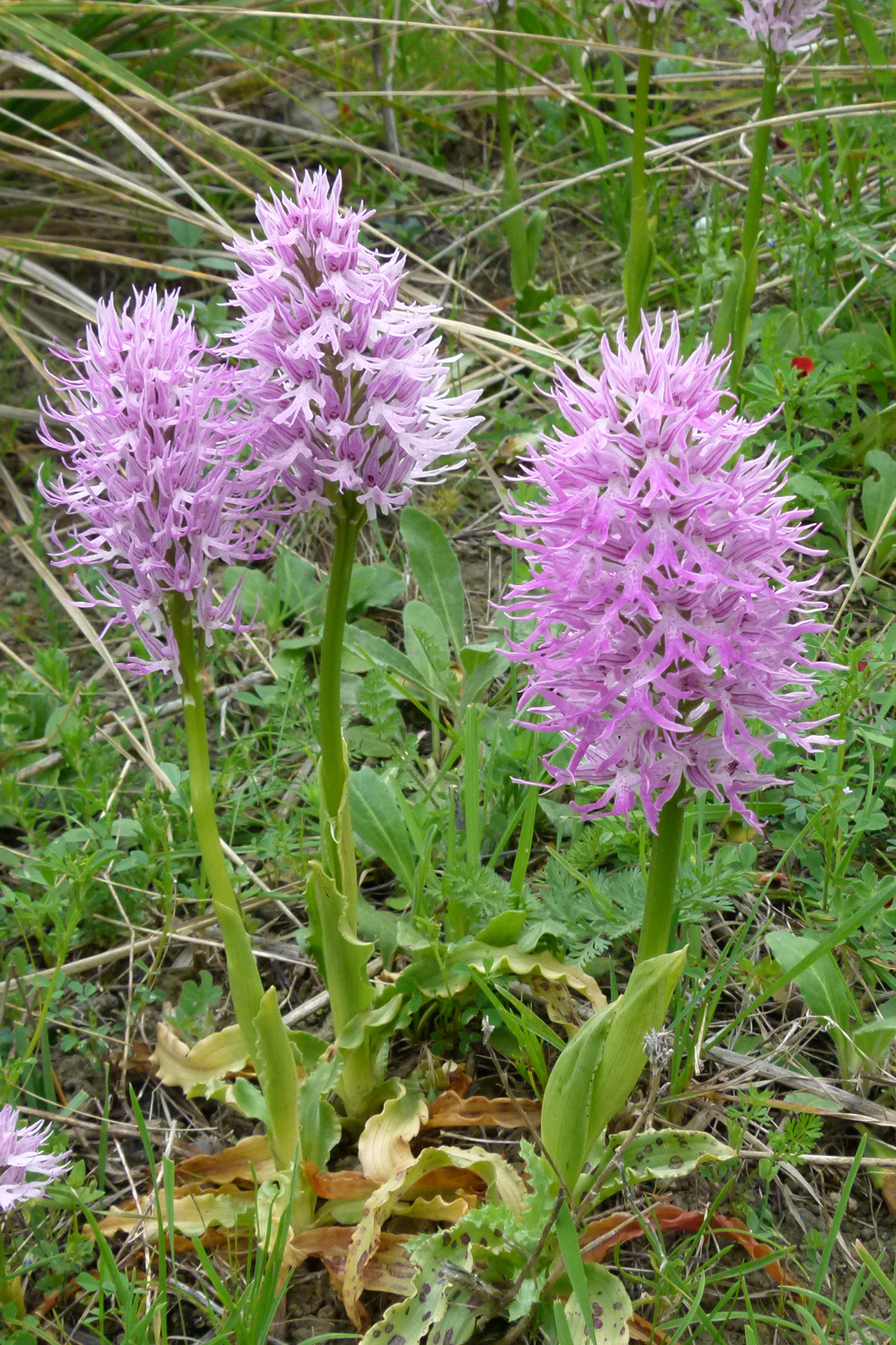 Pianta robusta alta 50-60 cm, con scapo eretto, verde chiaro; rosetta di 5-8 foglie basali con margini fortemente ondulati, strettamente lanceolate (5-13 × 1,2-2,8 cm), di color verde più scuro, talvolta maculate, le cauline più piccole e guainanti; brattee membranose, biancastre, lunghe 1-5 mm. Infiorescenza densa e multiflora, dapprima conico-subglobosa, poi ovoide-cilindrica, con numerosi fiori grandi bianco-rosati. Tepali acuti o acuminati, conniventi in casco piuttosto lasso con apici disgiunti, di colore roseo con evidenti striature purpuree all’esterno e all’interno, sepali lanceolati (8-15 × 3-5 mm), e petali lunghi 5-10 mm, meno acuti e più scuri. Labello piano, pendulo o inclinato in avanti, stretto e allungato, lungo 12-20(25) mm, a fondo biancastro o rosato punteggiato di porpora, colorato più intensamente all’apice dei lobi; nettamente quadrilobo per i profondi seni e i lobi acuminati e divergenti; solitamente sia i lobi laterali che i lobuli del lobo mediano sono allungati e sottili [ma non nella var. fontinalis (☞ Osservazioni)]; lobuli mediani sempre più lunghi dei laterali e separati da un dentino centrale ben sviluppato; sperone chiaro, arcuato verso il basso, lungo 4-8 mm, circa la metà dell’ovario. Numero cromosomico: 2n = 42.
