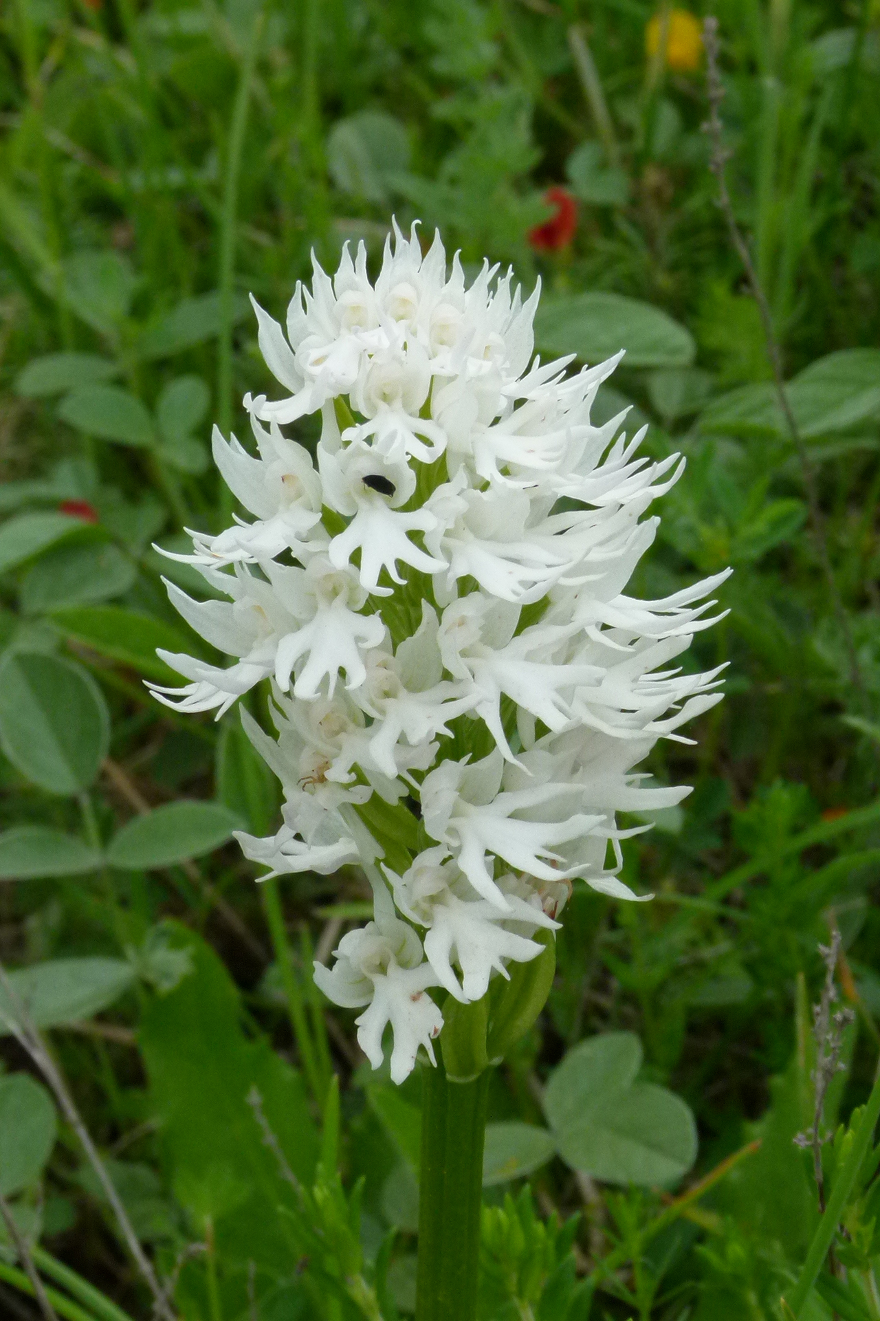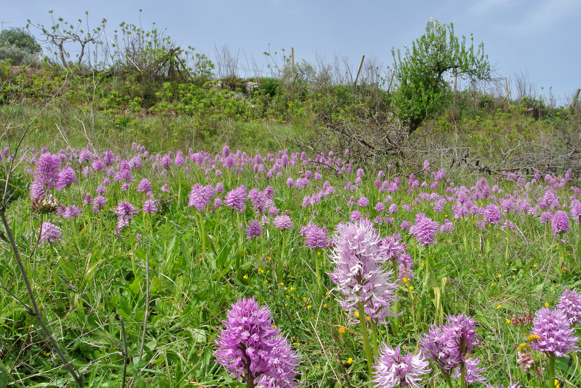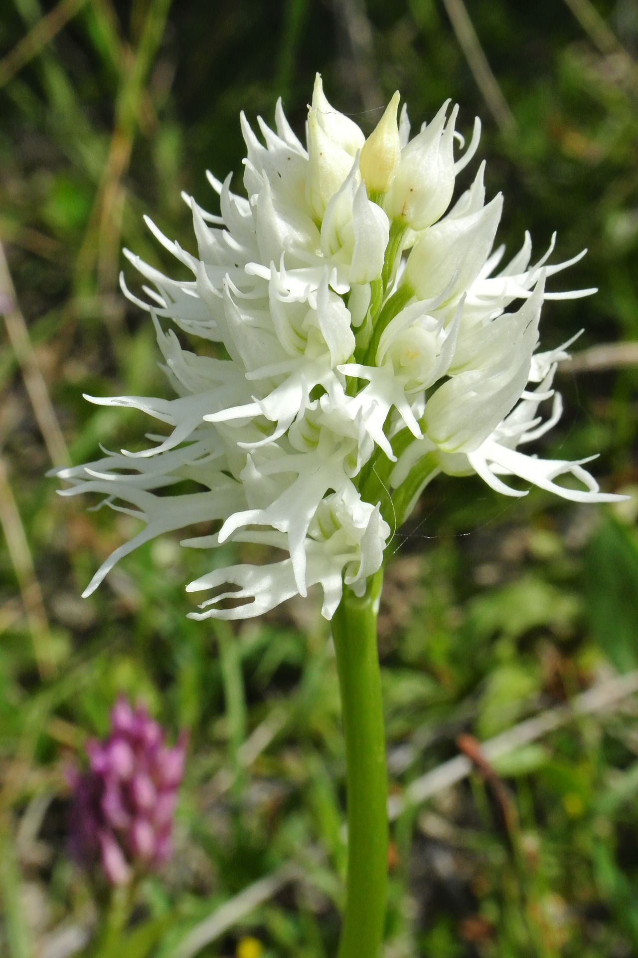 Pianta robusta alta 50-60 cm, con scapo eretto, verde chiaro; rosetta di 5-8 foglie basali con margini fortemente ondulati, strettamente lanceolate (5-13 × 1,2-2,8 cm), di color verde più scuro, talvolta maculate, le cauline più piccole e guainanti; brattee membranose, biancastre, lunghe 1-5 mm. Infiorescenza densa e multiflora, dapprima conico-subglobosa, poi ovoide-cilindrica, con numerosi fiori grandi bianco-rosati. Tepali acuti o acuminati, conniventi in casco piuttosto lasso con apici disgiunti, di colore roseo con evidenti striature purpuree all’esterno e all’interno, sepali lanceolati (8-15 × 3-5 mm), e petali lunghi 5-10 mm, meno acuti e più scuri. Labello piano, pendulo o inclinato in avanti, stretto e allungato, lungo 12-20(25) mm, a fondo biancastro o rosato punteggiato di porpora, colorato più intensamente all’apice dei lobi; nettamente quadrilobo per i profondi seni e i lobi acuminati e divergenti; solitamente sia i lobi laterali che i lobuli del lobo mediano sono allungati e sottili [ma non nella var. fontinalis (☞ Osservazioni)]; lobuli mediani sempre più lunghi dei laterali e separati da un dentino centrale ben sviluppato; sperone chiaro, arcuato verso il basso, lungo 4-8 mm, circa la metà dell’ovario. Numero cromosomico: 2n = 42.
