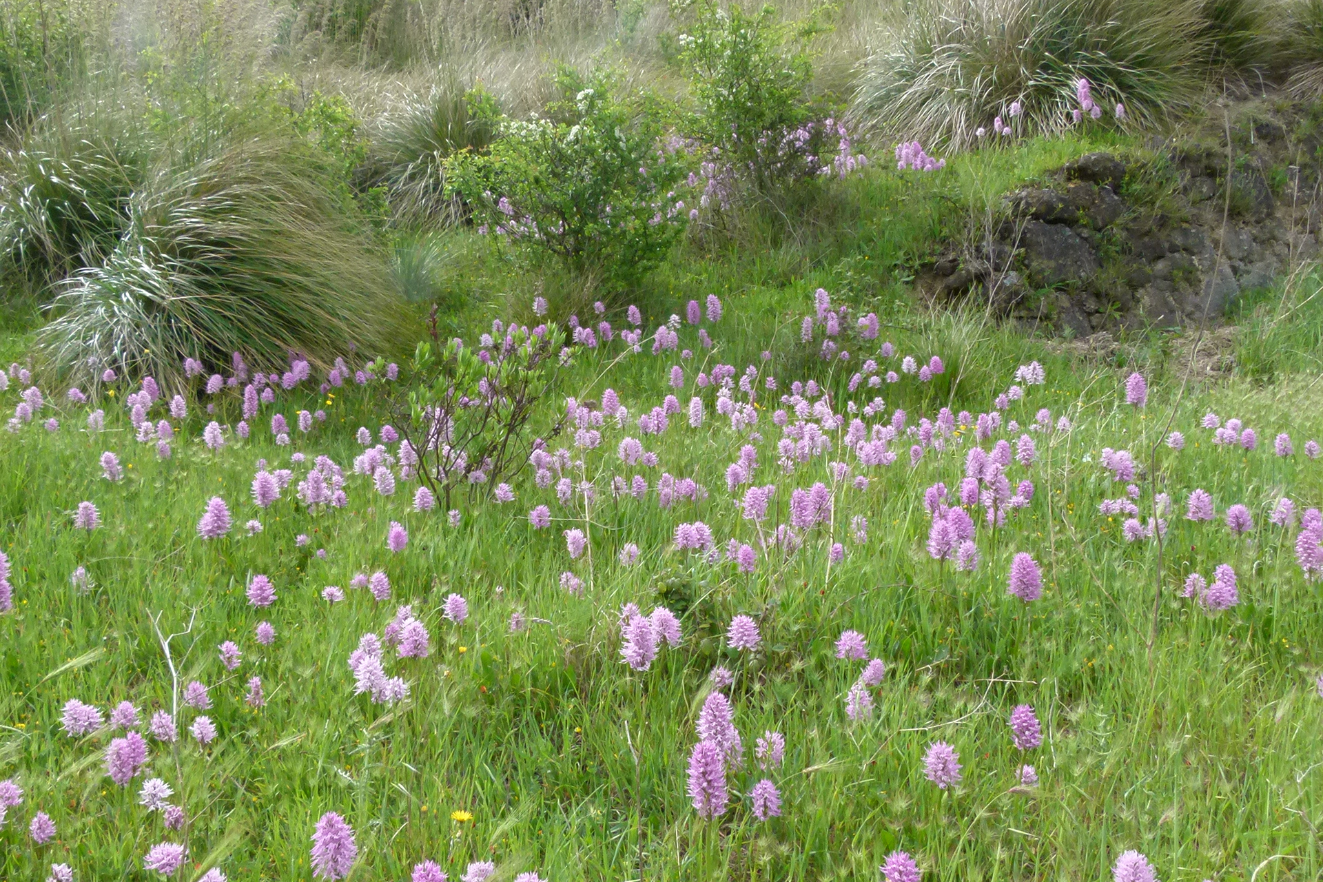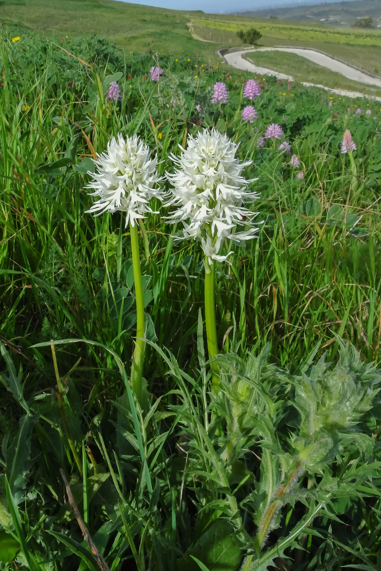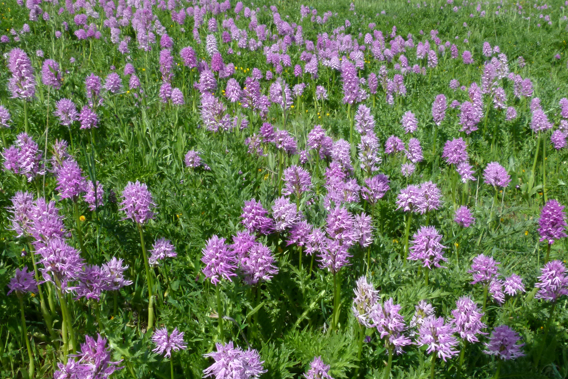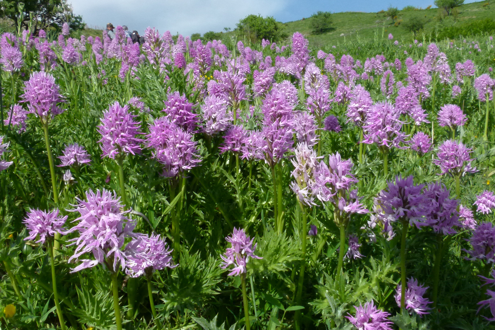 Pianta robusta alta 50-60 cm, con scapo eretto, verde chiaro; rosetta di 5-8 foglie basali con margini fortemente ondulati, strettamente lanceolate (5-13 × 1,2-2,8 cm), di color verde più scuro, talvolta maculate, le cauline più piccole e guainanti; brattee membranose, biancastre, lunghe 1-5 mm. Infiorescenza densa e multiflora, dapprima conico-subglobosa, poi ovoide-cilindrica, con numerosi fiori grandi bianco-rosati. Tepali acuti o acuminati, conniventi in casco piuttosto lasso con apici disgiunti, di colore roseo con evidenti striature purpuree all’esterno e all’interno, sepali lanceolati (8-15 × 3-5 mm), e petali lunghi 5-10 mm, meno acuti e più scuri. Labello piano, pendulo o inclinato in avanti, stretto e allungato, lungo 12-20(25) mm, a fondo biancastro o rosato punteggiato di porpora, colorato più intensamente all’apice dei lobi; nettamente quadrilobo per i profondi seni e i lobi acuminati e divergenti; solitamente sia i lobi laterali che i lobuli del lobo mediano sono allungati e sottili [ma non nella var. fontinalis (☞ Osservazioni)]; lobuli mediani sempre più lunghi dei laterali e separati da un dentino centrale ben sviluppato; sperone chiaro, arcuato verso il basso, lungo 4-8 mm, circa la metà dell’ovario. Numero cromosomico: 2n = 42.