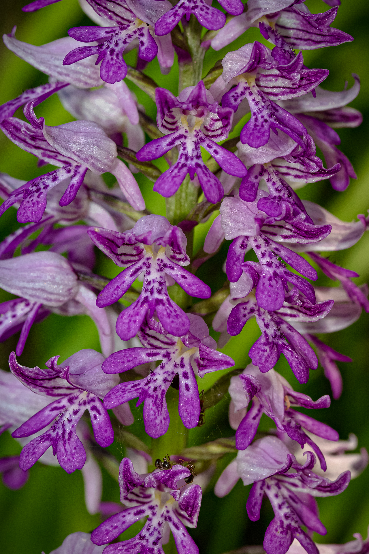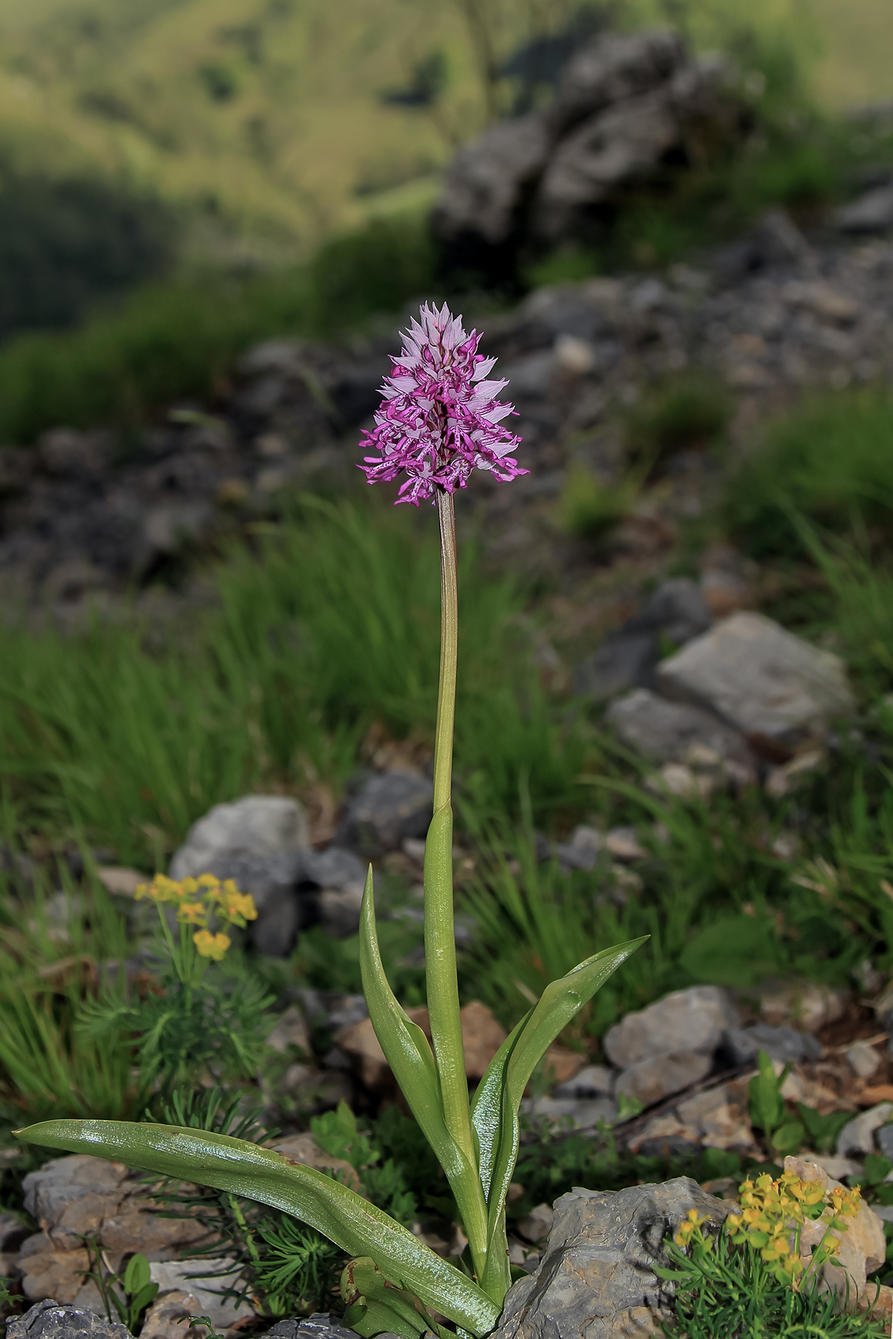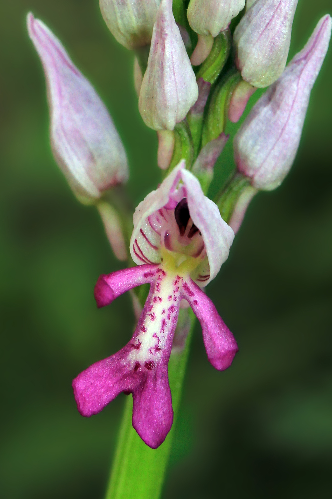Infiorescenza dapprima densa, poi piuttosto lassa, da ovoide a cilindrica, con 10-40 fiori di medie dimensioni. Sepali ovati lungamente acuminati (10-15 × 4-6 mm), conniventi con i petali lineari (7-10 × 1-2 mm) in un casco assai chiuso con apici liberi più o meno divergenti, esternamente biancastro con lievi striature violacee, bianco-violaceo all’interno con strie scure. Labello pendulo o orientato in avanti (10-15 × 8-12 mm), biancastro al centro con numerosi ciuffi di peli papillosi porporini, lobi laterali inseriti verso la base, lineari e allungati, obliquamente discendenti, lobo centrale più lungo e largo, diviso in due lobuli divergenti separati da un piccolo dente centrale, più corti e larghi dei laterali, con apici arrotondati a tinte violacee più o meno intense; sperone biancastro, lungo 5-7 mm, circa la metà dell’ovario sessile.