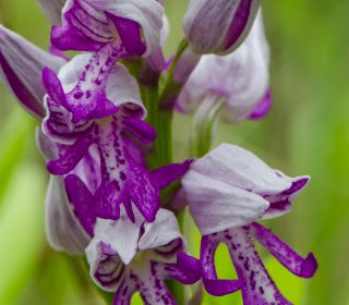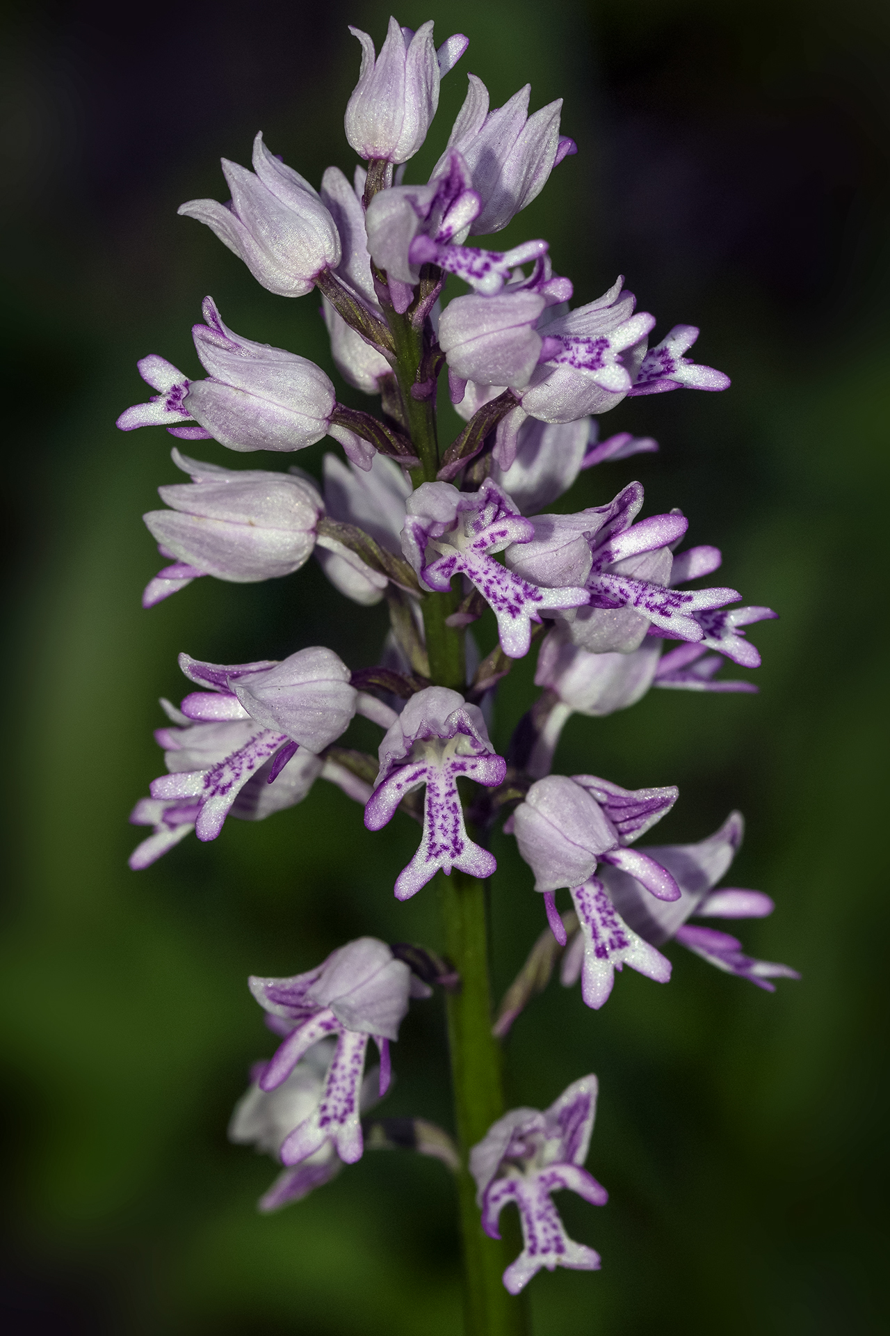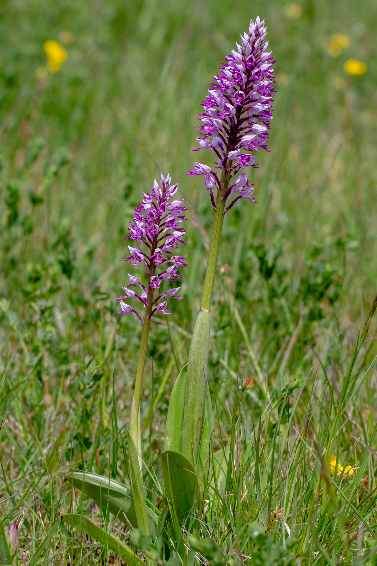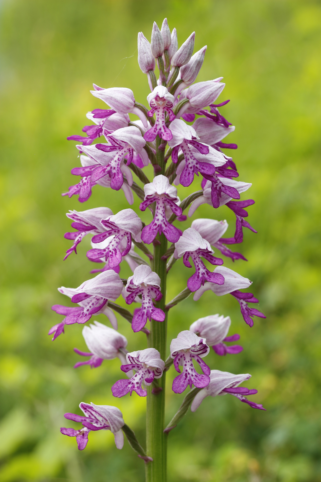 Infiorescenza dapprima densa, poi piuttosto lassa, da ovoide a cilindrica, con 10-40 fiori di medie dimensioni. Sepali ovati lungamente acuminati (10-15 × 4-6 mm), conniventi con i petali lineari (7-10 × 1-2 mm) in un casco assai chiuso con apici liberi più o meno divergenti, esternamente biancastro con lievi striature violacee, bianco-violaceo all’interno con strie scure. Labello pendulo o orientato in avanti (10-15 × 8-12 mm), biancastro al centro con numerosi ciuffi di peli papillosi porporini, lobi laterali inseriti verso la base, lineari e allungati, obliquamente discendenti, lobo centrale più lungo e largo, diviso in due lobuli divergenti separati da un piccolo dente centrale, più corti e larghi dei laterali, con apici arrotondati a tinte violacee più o meno intense; sperone biancastro, lungo 5-7 mm, circa la metà dell’ovario sessile.