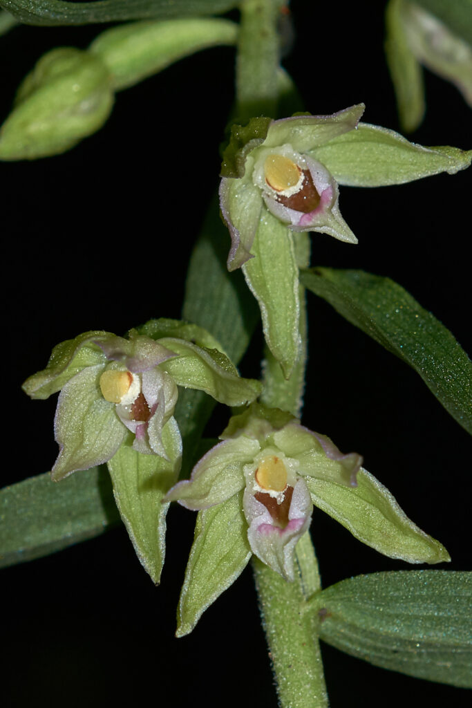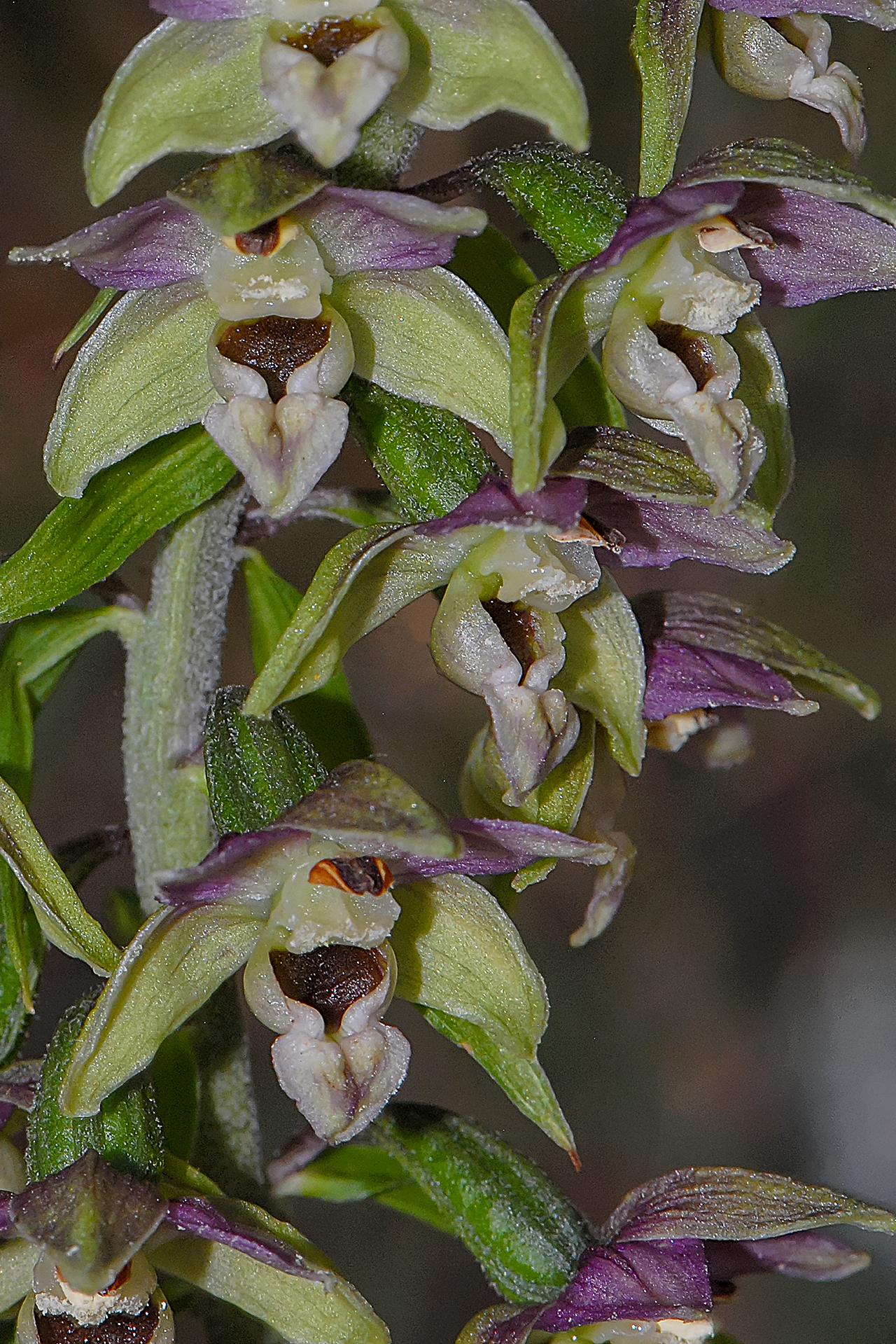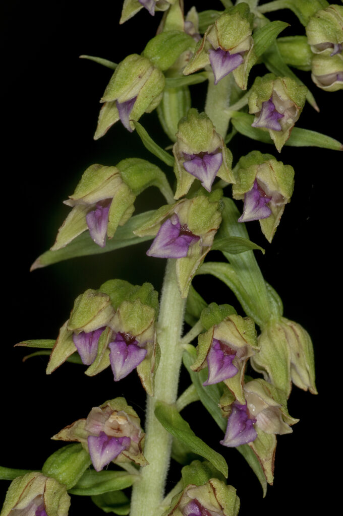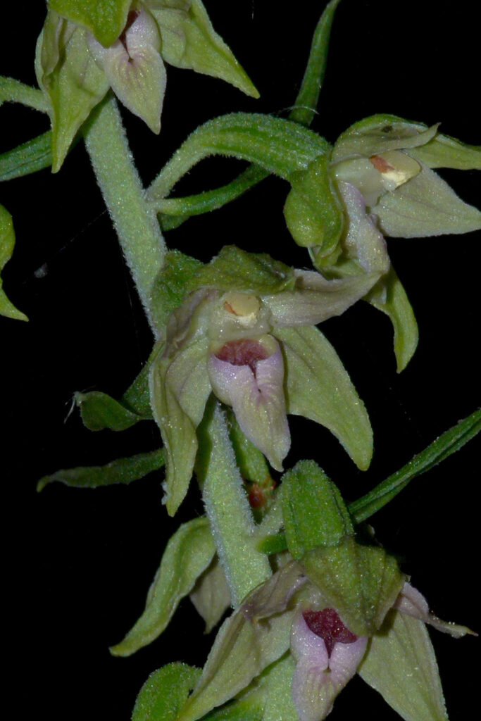 Pianta spesso cespitosa, alta fino a 60 cm, con scapo eretto, spesso flessuoso, glabro e rosa-violaceo in basso, verde chiaro e con fitta peluria verso la sommità; 4-7 foglie da lanceolate a ovate, la prima in basso piccola ed ellitica, le mediane 11-12,5 × 4,5-5,5 cm, orizzontali o obliquamente ascendenti, alterne, distiche o blandamente spiralate, a margini leggermente ondulati, verdi chiare e biancastre o roseo-violacee alla base, in basso lungamente guainanti, le superiori lunghe fino a superare talora l’infiorescenza; brattee inferiori molto lunghe (4,5-8,2 × 0,8-1,6 cm), variamente orientate. Infiorescenza densa, a volte più lassa, (sub)unilaterale, con 20-45 fiori grandi, essenzialmente autogami, penduli, di solito poco aperti o anche cleistogami. Tepali ovato-lanceolati, acuti, i sepali verdi-giallognoli (11-12 × 4-5 mm), i petali verdi-biancastri (9-11 × 3,5-4 mm) a volte sfumati di rosa. Labello con giunzione ipo-epichilo piuttosto stretta; ipochilo emisferico, rossastro all’interno, nettarifero; epichilo triangolare allungato (5-5,5 × 4,5-5 mm), da roseo intenso a porporino-violaceo, con apice appuntito di solito leggermente arcuato all’indietro e callosità mediamente pronunciate; colonna grigio-biancastra; antera sessile o lievemente peduncolata; clinandrio sviluppato; viscidio presente ma efficace soltanto per brevissimo tempo a inizio antesi; pollinii friabili presto disgregantesi sullo stigma trapezoidale e incavato; ovario scarsamente pubescente, con pedicello lungo 4-7 mm, verde-giallastro.