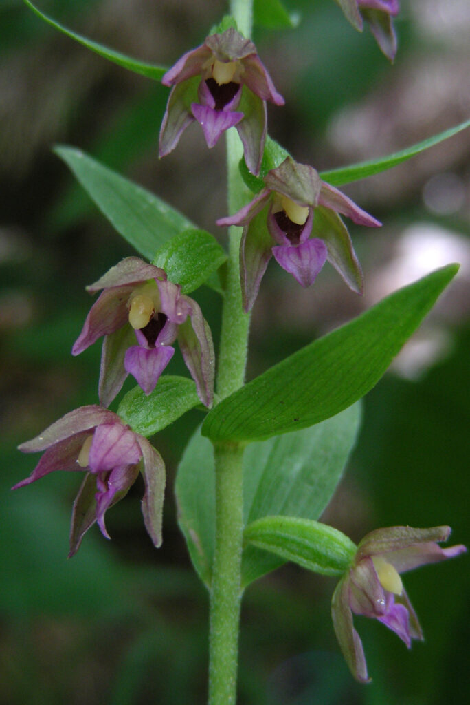 Portamento simile a quello di Epipactis muelleri, ma pianta sempre singola e mediamente di taglia minore (alta da 20 a 40 cm), con scapo robusto, arrossato e glabro in basso, verde e pubescente verso la sommità; 4-7 foglie a base guainante e più o meno alterne e spiralate, spesso quella in basso più piccola e ovata, la più alta bratteiforme, le altre ovato-lanceolate o lanceolate, acute, scanalate, a margine debolmente ondulato, finemente e irregolarmente papilloso-denticolate; brattee inferiori più lunghe del fiore, in alto mai più corte dell’ovario. Infiorescenza con meno fiori (fino a 30) piuttosto piccoli, da rosei a magenta, autogami ma mai cleistogami, profumati, penduli, a inizio antesi aperti, poi presto semichiusi, di breve durata. Tepali ovato-lanceolati e acuti, i sepali fino a 10 × 5 mm, verdastri verso la base e rosati o violacei verso il margine, i petali rosei-magenta su entrambe le facce, più chiari verso la base. Labello con giunzione ipo-epichilo piuttosto stretta; ipochilo emisferico, nettarifero, roseo all’esterno, magenta-porporino all’interno; epichilo triangolare, da roseo a roseo-violaceo, di solito piano o a margini lievemente rialzati, con apice acuto e in genere non ripiegato, con callosità a volte nette e verrucose; colonna, antera, clinandrio e viscidio come in E. muelleri; pollinii friabili, ovario clavato, a sezione subtriangolare, con lungo pedicello a base verde-giallastra, di rado lievemente arrossata.