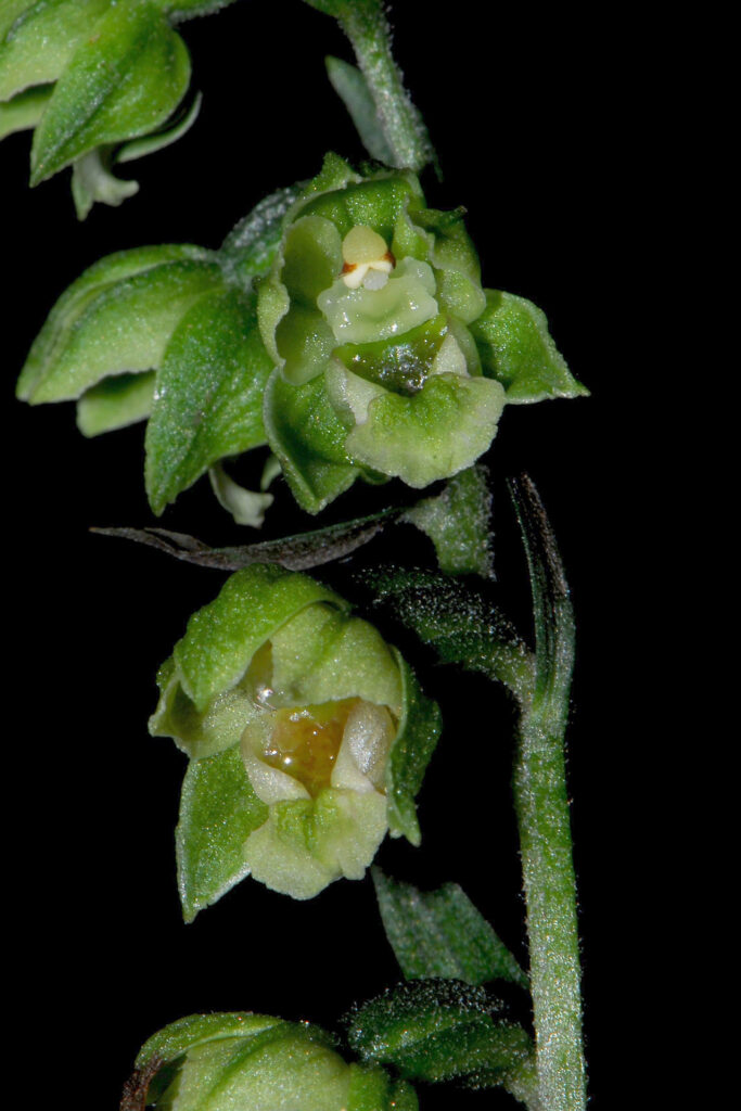 pianta piccola, raramente alta più di 20 cm, di solito isolata o in coppia; scapo gracile, sottile, verde chiaro in basso, con densa pubescenza biancastra verso l’alto; 3-7 foglie verdi, ovato-lanceolate (4,5-8,5 × 1-2,5 cm), più o meno spiralate, erette o patenti, talvolta arcuate, a margini debolmente ondulati, in basso ridotte a squame guainanti; brattea inferiore poco più lunga del fiore (1,2-4 cm). Infiorescenza corta e lassa, di solito unilaterale, con 7-15 fiori piccoli, verdastri, autogami, poco aperti (a volte cleistogami), campanulati, suborizzontali o penduli. Tepali color verde chiaro, ovati e acuti; sepali lunghi 6,5-8 mm, petali appena più corti e più chiari. Labello esternamente bianco-verdastro, con giunzione ipo-epichilo a forma di U più o meno larga; ipochilo nettarifero, bruno-olivaceo sul fondo; epichilo cordiforme (2,3-3 × 3-4,2 cm), talvolta crenulato sul margine, con parte apicale ottusa, allargata e rivolta all’indietro e callosità basali poco sviluppate, verdastre (a volte brunastre); colonna biancastra; antera piuttosto corta e brevemente peduncolata; clinandrio e staminodi non molto sviluppati; viscidio presente ma inefficace; pollinii sfarinantesi sulla parte superiore dello stigma; ovario verde e costoluto, con pedicello breve a base a volte violacea. Numero cromosomico 2n = 40.