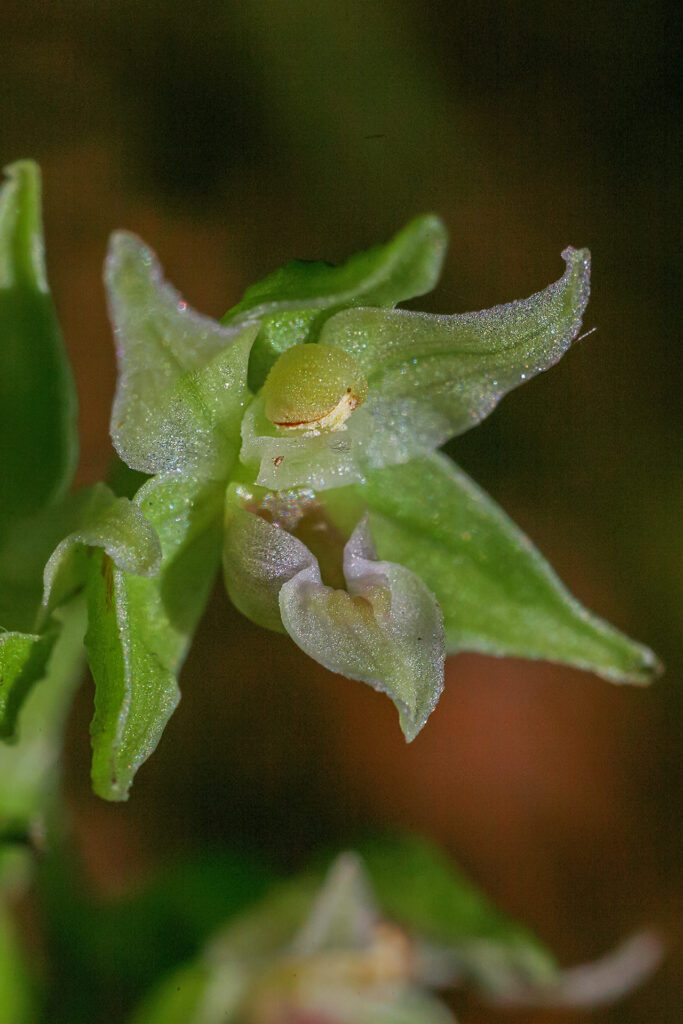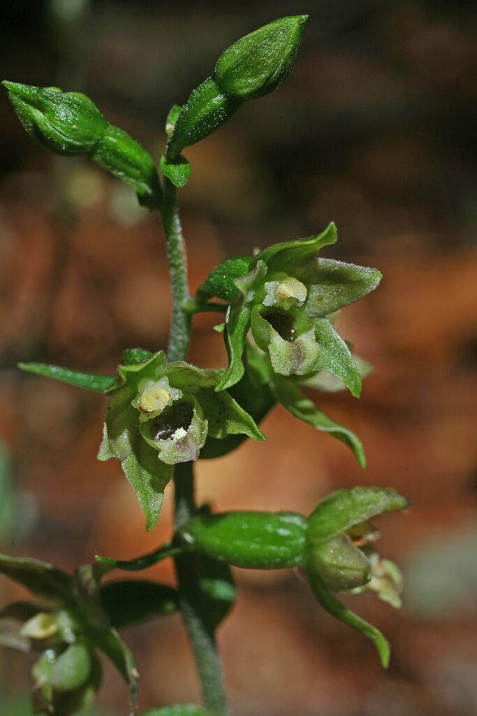 Pianta alta 15-50 (70) cm, spesso cespitosa, con scapo gracile, verde o verde-giallastro, densamente pubescente in alto; 4-7 foglie piccole (la maggiore 6 × 3,5 cm), a base guainante, ovate-lanceolate, spesso più corte degli internodi, di colore verde tenue, con bordi ondulati e microdenticolati; brattee inferiori più lunghe dei fiori e piuttosto larghe. Infiorescenza più o meno lassa e tendenzialmente unilaterale, portante da pochi a oltre 50 fiori assai piccoli, autogami, abitualmente aperti, da orizzontali a penduli. Sepali ovato-lanceolati (7-8 × 4 mm), verdastri, più chiari all’interno; petali simili, più chiari e sfumati di rosa. Labello con giunzione ipo-epichilo piuttosto larga; ipochilo a coppa profonda, olivaceo all’interno, nettarifero; epichilo cordato (3,5 × 4 mm), con apice piegato verso il basso, biancastro con sfumature rossastre, con callosità basali poco marcate; colonna tozza; antera robusta, peduncolata; clinandrio ben sviluppato; staminodi sviluppati, rostello allungato; viscidio presente ma inefficace, pollinii granulosi e friabili sullo stigma rettangolare o trapezoidale a bordi sporgenti; ovario fusiforme, pubescente, con pedicello lungo, arcuato, di solito violaceo.